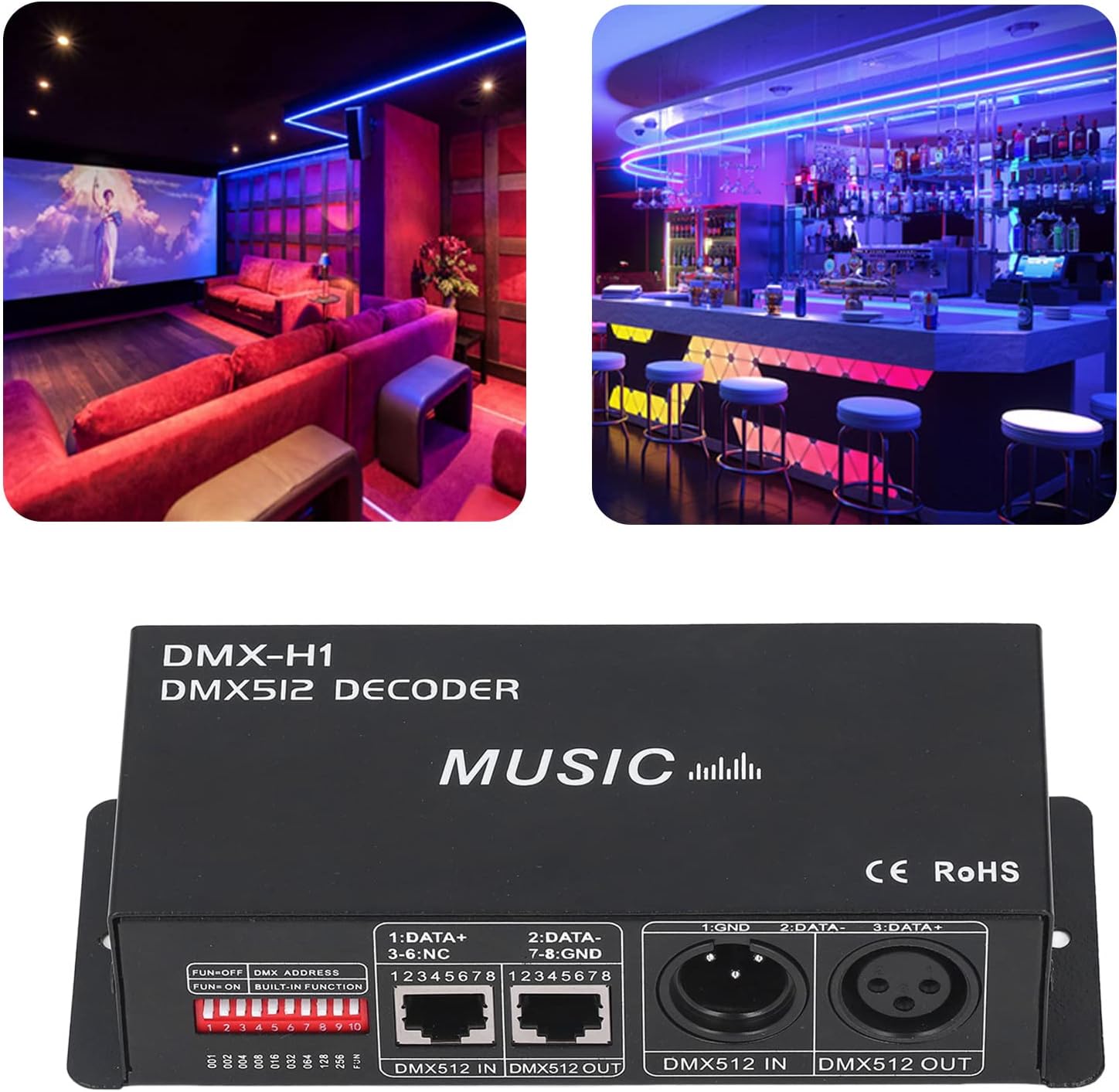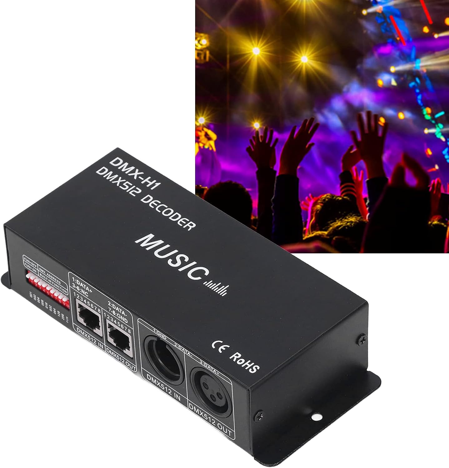 Dimming RGB: è possibile connettersi con la console digitale per la funzione di attenuazione RGB. Materiale PCB in ferro: il decoro LED RGB è realizzato in PCB e ferro, resistente e l'indirizzo può essere impostato tramite DIP switch. Ambito di applicazione: il decoder RGB ha una gamma di applicazioni e può essere utilizzato in luoghi pubblici come case, bar, hotel e bar sobri Design regolabile: il Decorder a 4 canali può entrare in modalità musica regolando Switch8,9, Switch1‑7 può regolare la sensibilità della musica. Pratico durevole: il decoratore riceve il segnale di controllo digitale standard e lo converte in segnale PWM per regolare il LED.