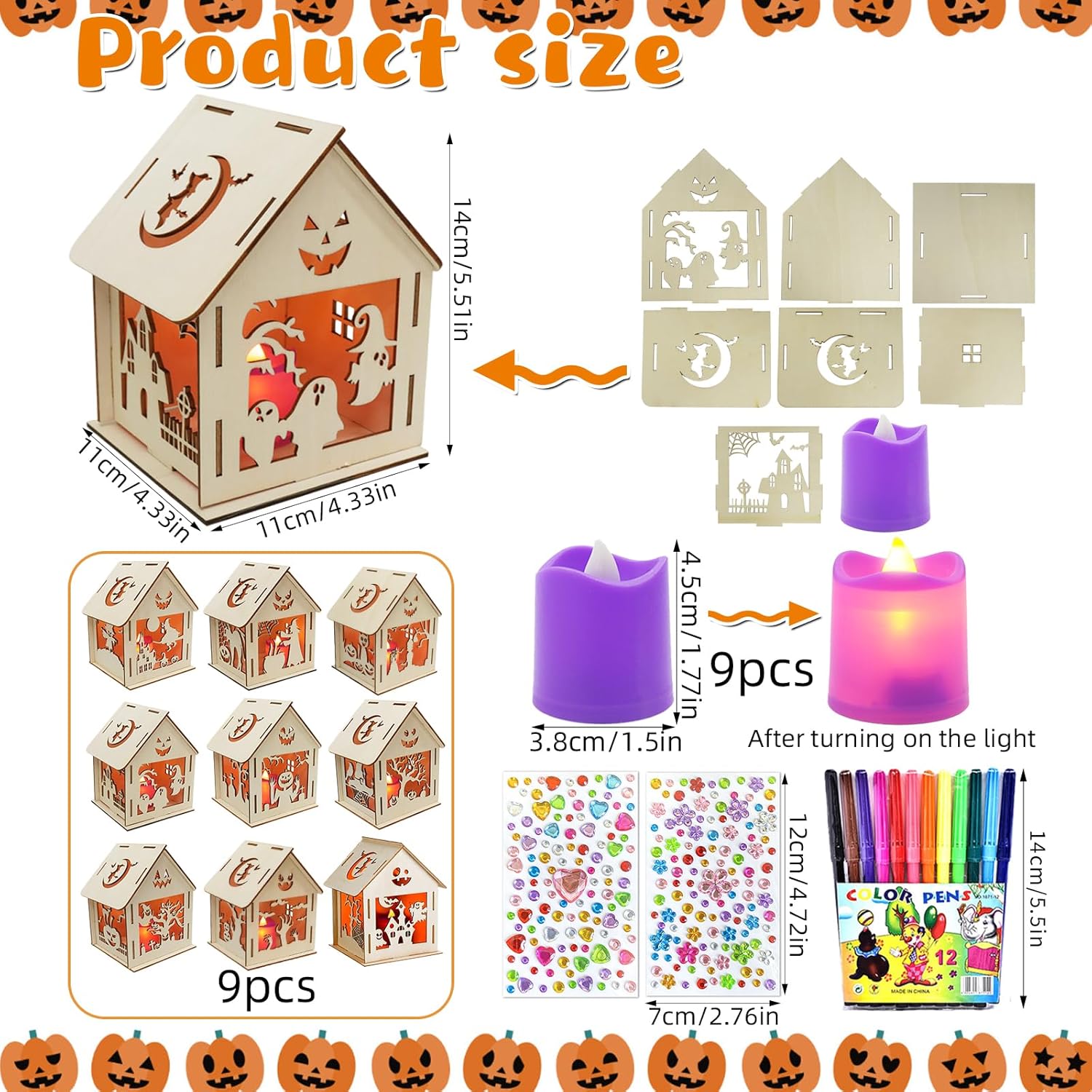 Kit fai da te per la casa di Halloween per bambini: riceverete 9 streghe in legno a forma di zucca con elementi classici di Halloween come zucche (9 design), 1 set di pennelli da pittura, 2 adesivi con strass e 9 lampadine. Il set fai da te per la casa di zucca di Halloween è perfetto per la decorazione di Halloween con i bambini Materiale di alta qualità: la casa della strega di zucca da dipingere è realizzata in legno di alta qualità, resistente e infrangibile, con bordi lisci. È pretagliato e scanalato, senza bisogno di attrezzi, perfetto per consentire ai bambini di creare una casa di Halloween sicura e fai da te Facile da montare: le candele a LED portacandele a forma di casa pre-tagliate possono essere facilmente assemblate per creare un incantevole tealight case che illuminerà ogni cameretta dei bambini Candele LED suggestive: la casa fantasma autunnale dei bambini contiene 9 luci a LED a luce calda, alimentate a batteria (batterie incluse), realizzate in plastica, la luce può illuminare il modello della casa in legno, che è molto magico. Bambini la loro immaginazione dipingendo e decorando con pennarello, adesivo con strass Creatività regalo di Halloween: illuminazione per la casa di zucca, il regalo ideale per Halloween per ragazzi e ragazze che possono creare la propria casa di Halloween unica. Quando è pronto, può essere utilizzato come punto focale perfetto per la festa di Halloween o la casa e aggiunge più colore all'Halloween