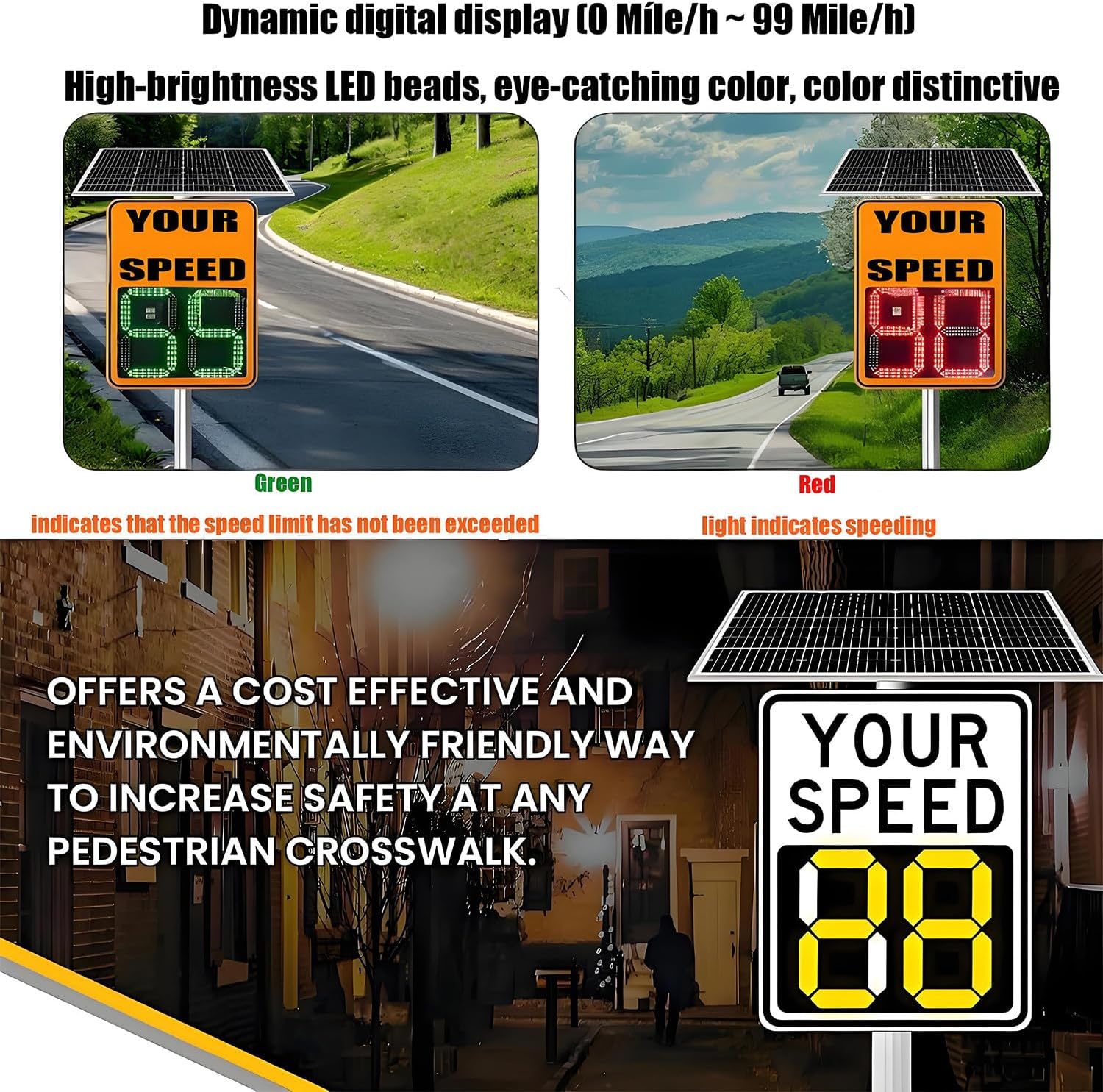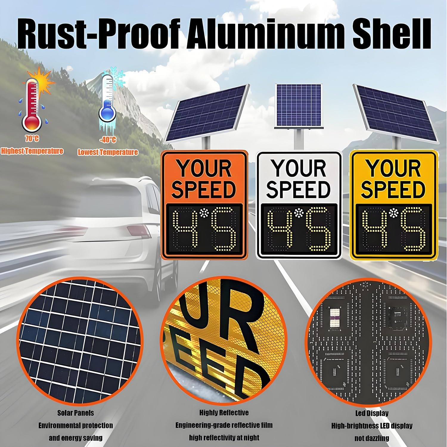 【Fornitura di Energia Sostenibile】: Il segnale limite di velocità a LED alimentato da energia solare è dotato di un pannello solare con un alto tasso di conversione, velocità di ricarica rapida e non è influenzato dalle condizioni meteorologiche avverse. Non richiedendo una fornitura di energia continua, è ecologico, economico e adatto per un uso a lungo termine. 【Monitoraggio in Tempo Reale】: Il cartello stradale a LED alimentato a energia solare rileva automaticamente la velocità dei veicoli in tempo reale e mostra un avviso al conducente per ridurre la velocità. 【Cartello del Limite di Velocità con Radar Solare】: Il cartello con feedback radar è realizzato in alluminio di alta qualità e dispone di un trattamento impermeabile IP65 per prevenire l'intrusione della pioggia, garantendo la sua durata e la capacità di resistere a condizioni meteorologiche avverse. 【Pallini LED】: Il display di rilevamento radar di limite di velocità a LED contiene 660 LED ad alta luminosità, offrendo un'alta luminosità e visibilità a lungo raggio. Con una durata della vita dei LED di oltre 10 ore, fornisce ai conducenti un display chiaro e visibile della velocità attuale, migliorando la sicurezza stradale. 【Alta Luminosità Riflessa】: Il segnale di limite di velocità radar alimentato a energia solare è rivestito con una pellicola riflettente per una migliore visibilità notturna, con un raggio di 1.000 metri. La sua eccellente riflettenza notturna e la forte retro-riflettenza offrono una maggiore sicurezza.
