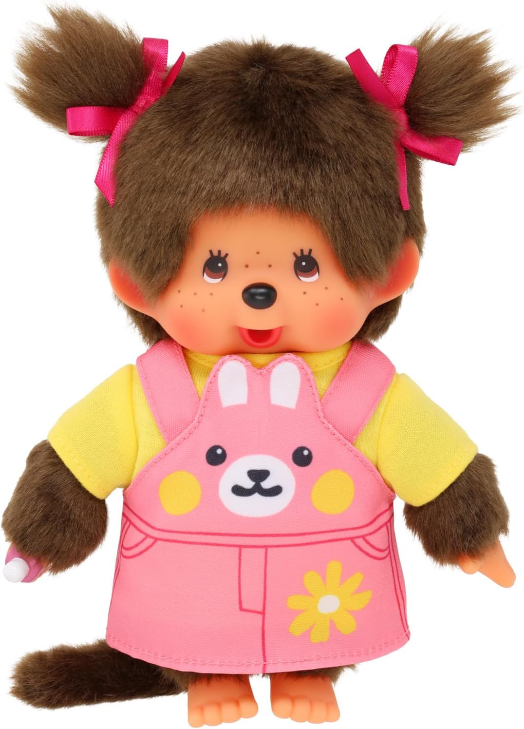 Simpatica bambina Monchhichi con maglietta gialla, salopette rosa con faccia da coniglio e fiocchi rosa tra i capelli, altezza circa 20 cm Il viso, le mani e i piedi della bambola simile a una scimmia sono realizzati in plastica Il pelo marrone è realizzato in peluche particolarmente morbido e invita a coccolarlo, giocare con lui e amarlo Il Monchhichi tiene nella mano destra un ciuccio che può mettersi in bocca Regalo ideale per compleanni, Natale e Pasqua per bambini, appassionati, collezionisti e nostalgici