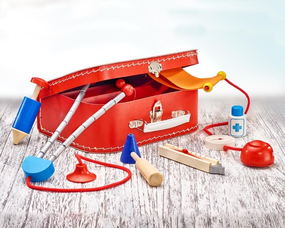 Per un perfetto gioco di ruolo Elegante valigetta del dottore con molti strumenti robusti da usare per una visita Lavorato a mano amorevolmente da materiali di qualità Da materiale in legno naturale Design funzionale e piacevole Robusto e durevole Made in Germany Testato indipendentemente Sicuro e atossico