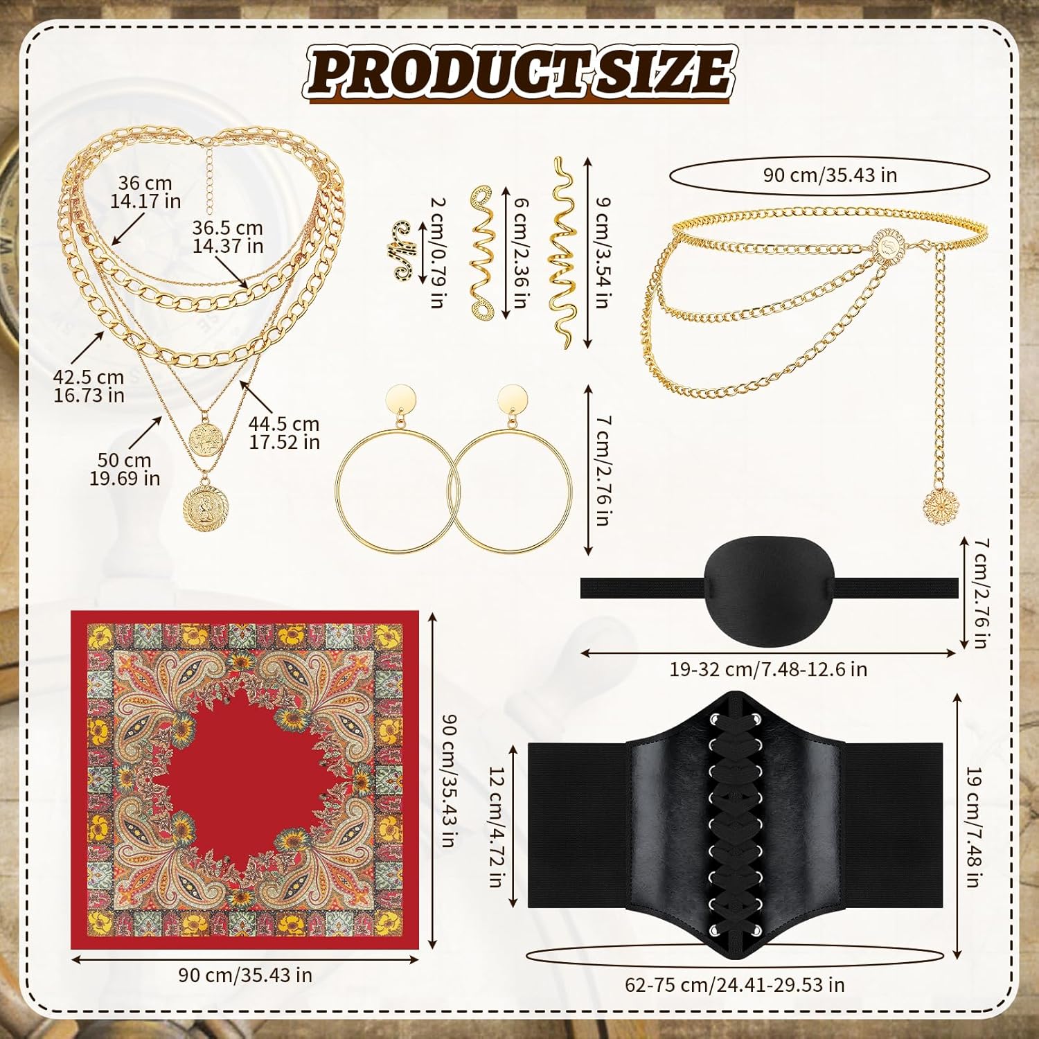 Descrizione prodotto Set di accessori per costume da pirata SelfTek da 9 pezzi per donne adulte Perfetto per: Halloween, festival dei pirati, feste in costume, cosplay, spettacoli teatrali e fotografia a tema. Perché scegliere il kit costume da pirata SelfTek? Stile tutto in uno: non è necessario cercare parti separate. Questo set viene fornito con una bandana stampata, cintura corsetto regolabile, catena in vita, collana, orecchini, benda sull'occhio 3D e 3 accessori aggiuntivi per capelli da pirata, tutti progettati per abbinarsi e abbinare per un look unico e robusto. IL COMFORT INCONTRA LO STILE - La morbida bandana in cotone rimane al sicuro senza irritazioni, mentre la benda in spugna traspirante garantisce comfort anche durante un uso prolungato. La cintura corsetto regolabile valorizza la tua figura pur rimanendo facile da indossare. Dettagli squisiti: ogni pezzo è progettato per durare nel tempo e per un'estetica da pirata premium. Catene multistrato e accessori per capelli aggiungono profondità al tuo costume. Infinite possibilità di costume: abbina questi accessori a un abito rinascimentale, un mantello da pirata o una semplice camicetta e pantaloni per una trasformazione rapida ma sorprendente. Perfetto per Halloween, convention di cosplay, servizi fotografici ed eventi a tema pirati. Il set include: 1 bandana da pirata. 1 cintura corsetto 1 catena in vita. 1 collana a strati. 1 paio di orecchini. 1 benda sull'occhio 3D. 3 accessori per capelli Avviso di sicurezza Utilizzare il prodotto solo sotto la supervisione di un adulto