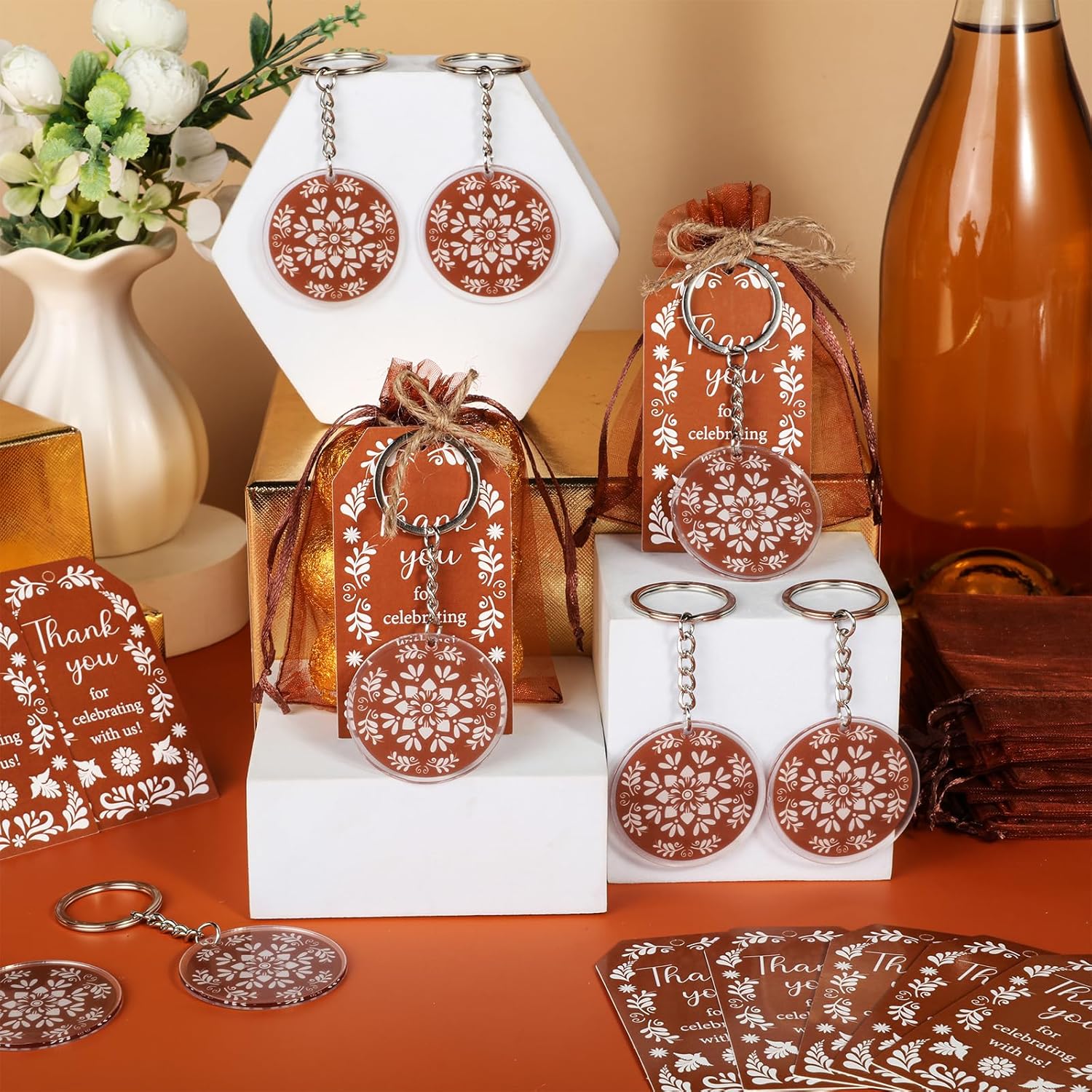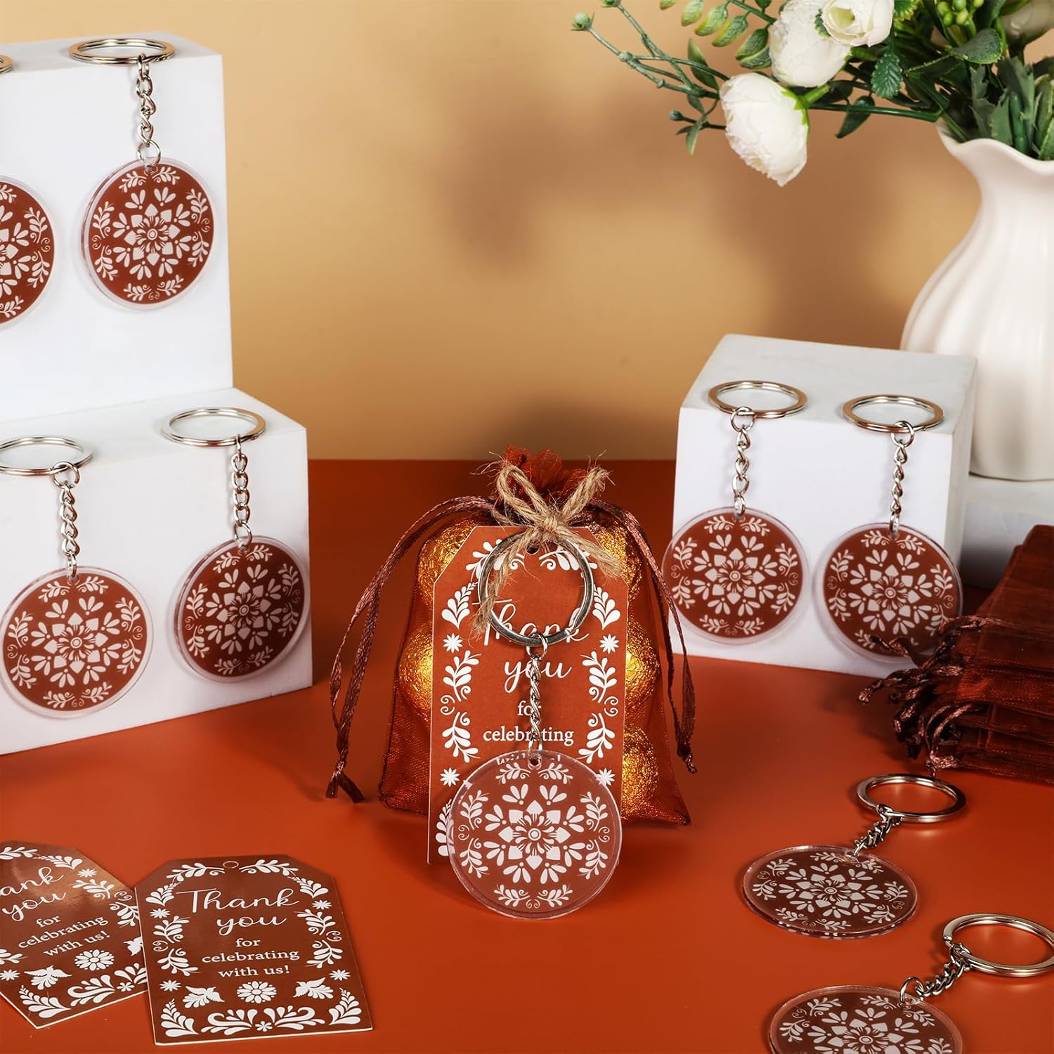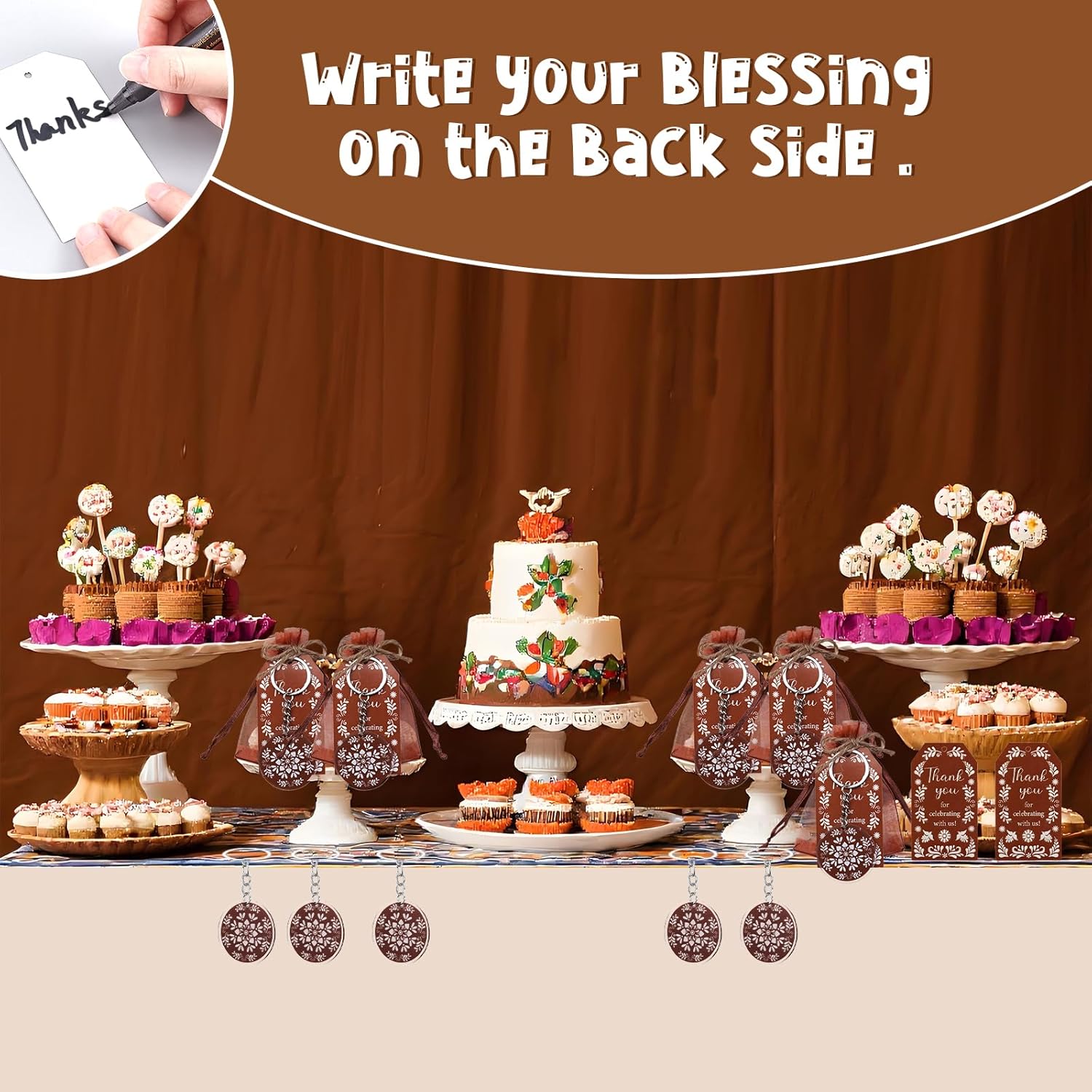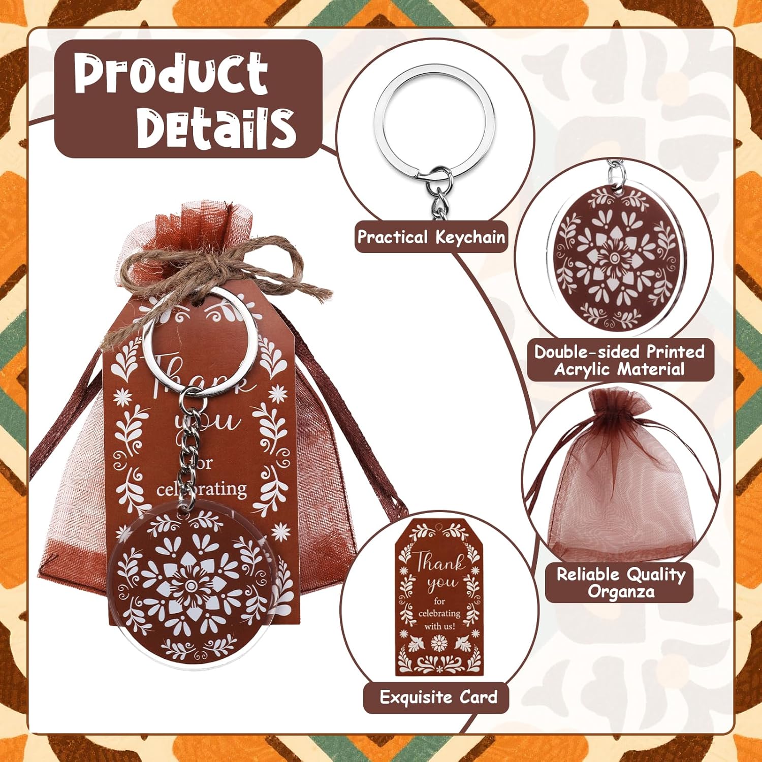 Design autentico Talavera: eleva il tuo baby shower a tema messicano o festa di compleanno con questo vivace set ispirato a Talavera. Gli intricati motivi marroni e bianchi sui portachiavi in acrilico, sui biglietti di ringraziamento e sui sacchetti di organza aggiungono un tocco di fascino culturale. Ogni pezzo è accuratamente progettato per riflettere l'arte tradizionale, rendendo il tuo evento indimenticabile Set completo per bomboniere: questo set all-in-one include 24 portachiavi in acrilico (double-face), 24 biglietti di ringraziamento (5,1 x 8,9 cm) e 24 sacchetti di organza (8,9 x 11,9 cm), più 10 m di spago di iuta per un facile montaggio. Tutto ciò di cui hai bisogno per creare bomboniere memorabili è incluso, risparmiando tempo e fatica Regali versatili e premurosi: ideali per gli ospiti, questi bomboniere possono essere utilizzati come ricordi o oggetti pratici. I robusti portachiavi in acrilico sono ideali per l'uso quotidiano, mentre gli eleganti sacchetti in organza e i biglietti di ringraziamento aggiungono un tocco personale al tuo evento. Ideale per baby shower, compleanni o celebrazioni culturali Facile da personalizzare e montare: il set viene fornito pronto per l'uso, senza bisogno di strumenti aggiuntivi. Basta attaccare i portachiavi ai sacchetti di organza utilizzando lo spago di iuta incluso e abbinarli ai biglietti di ringraziamento per un look raffinato. La combinazione di colori marrone neutro completa qualsiasi arredamento Ottimo rapporto qualità-prezzo: con 72 pezzi in totale, questo set offre un valore eccezionale. Ogni articolo è progettato per stupire i tuoi ospiti senza spendere troppo. Le stampe ad alta risoluzione e i materiali di alta qualità garantiscono una finitura professionale per la tua occasione speciale