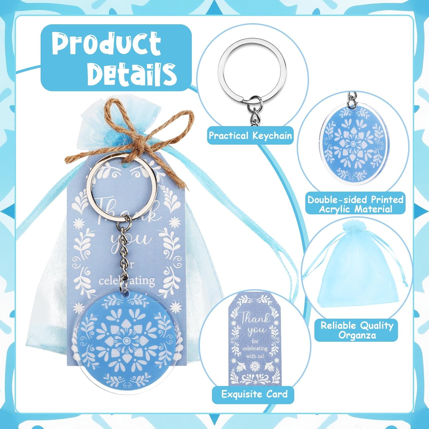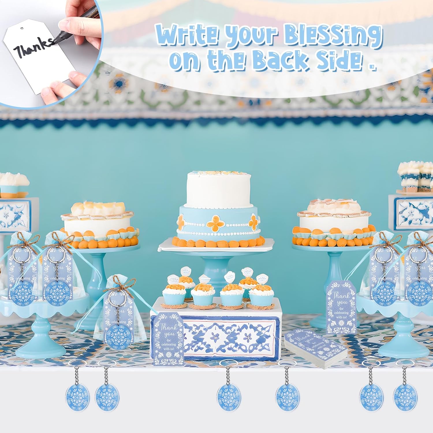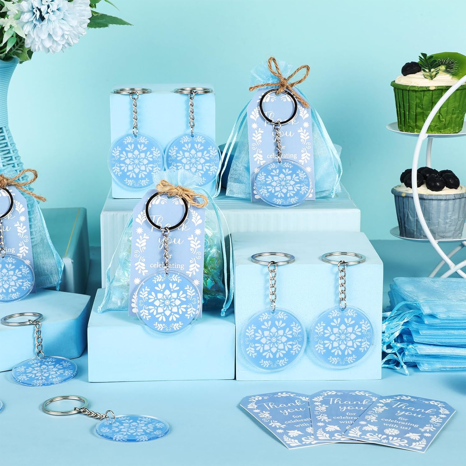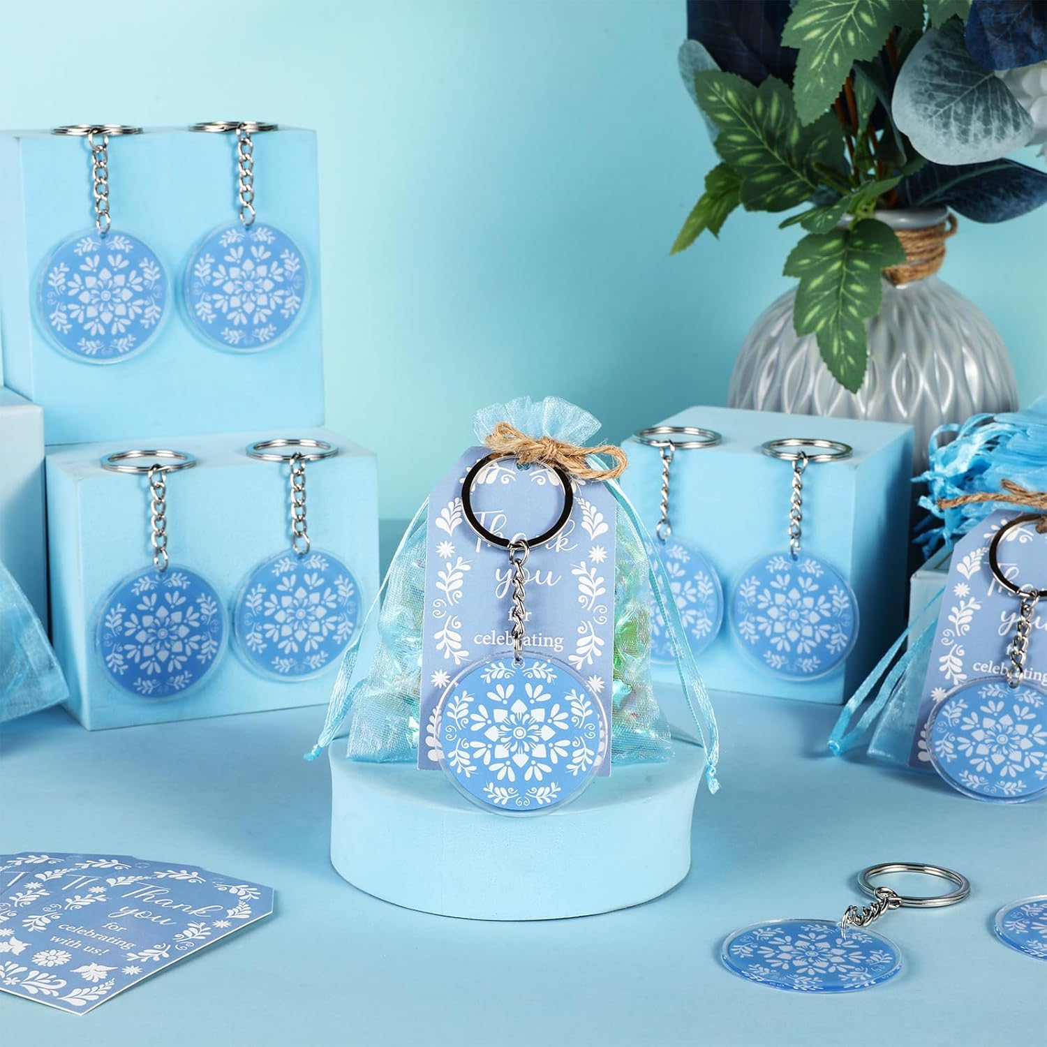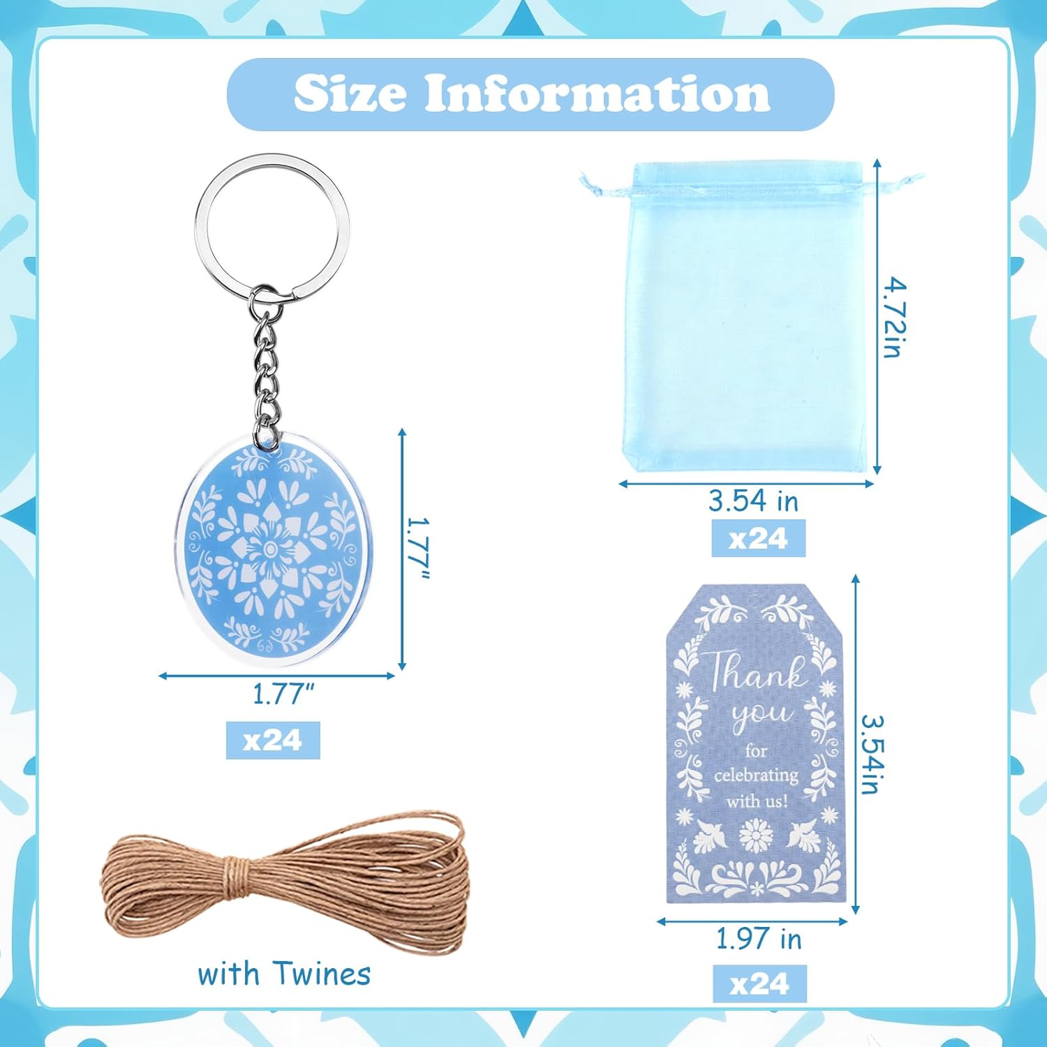 Estetica autentica Talavera: porta il fascino vibrante dell'arte messicana Talavera alle tue celebrazioni con questo set di bomboniere dal design accattivante. Gli intricati motivi blu sui portachiavi, i biglietti di ringraziamento e i sacchetti di organza creano un tema coeso e visivamente sorprendente, adatto per baby shower, compleanni o eventi a tema fiesta. Ogni pezzo mette in mostra il ricco patrimonio culturale dell'artigianato Talavera Pacchetto completo e conveniente per feste: questo set tutto in uno include 24 portachiavi in acrilico su entrambi i lati (6,3 x 5,6 cm), 24 biglietti di ringraziamento stampati premium (5,1 x 8,9 cm), 24 eleganti sacchetti in organza (8,9 x 11,9 cm) e 10 metri di spago di iuta naturale. Non c'è bisogno di acquisti aggiuntivi: tutto è incluso con cura per creare splendide bomboniere che i tuoi ospiti adoreranno Ricordi funzionali e premurosi: i portachiavi in acrilico leggero ma robusto sono progettati per l'uso quotidiano, rendendoli un regalo pratico e memorabile. I biglietti di ringraziamento aggiungono un tocco personale, mentre gli spaziosi sacchetti in organza possono contenere dolcetti, piccoli regali o ricordi, assicurando che le tue bomboniere siano eleganti e funzionali Facile montaggio e personalizzazione: abbina facilmente i biglietti di ringraziamento con i sacchetti di organza utilizzando lo spago di iuta incluso per una presentazione lucida. I componenti versatili consentono una personalizzazione creativa, sia che tu li abbini ad altre decorazioni o li utilizzi come accenti indipendenti per un'esperienza di festa personalizzata Valore eccezionale per feste a tema: con 72 pezzi di alta qualità in un unico set, questa collezione offre un valore imbattibile per feste a tema. La stampa vivida e ad alta risoluzione e i materiali di qualità assicurano che le tue decorazioni si distinguano, rendendolo una scelta economica per gli host che vogliono stupire senza compromettere lo stile o la quantità