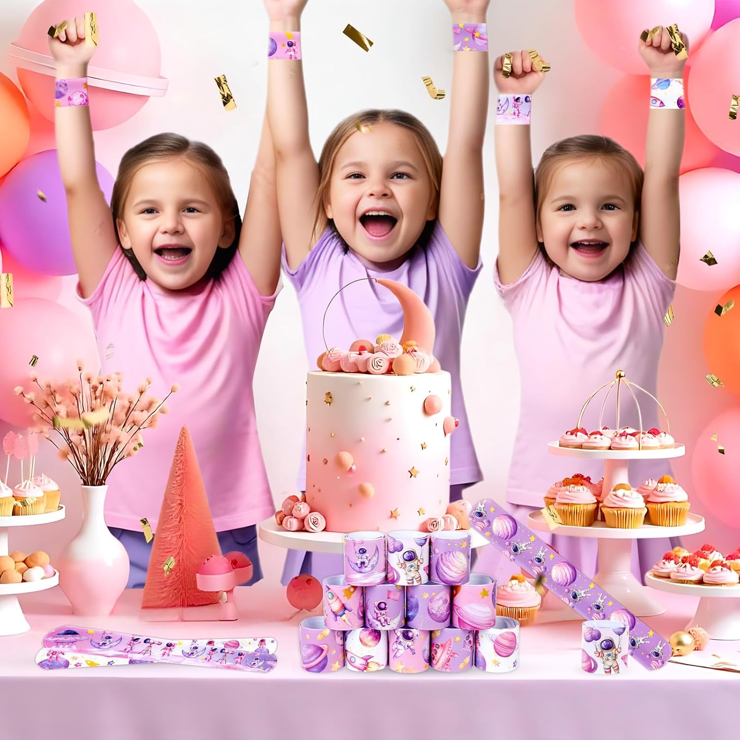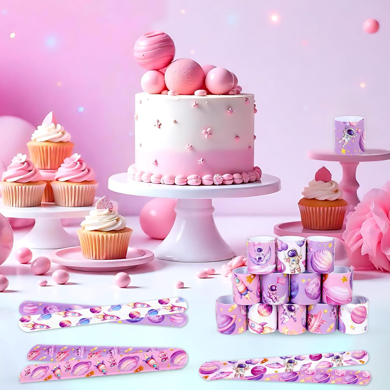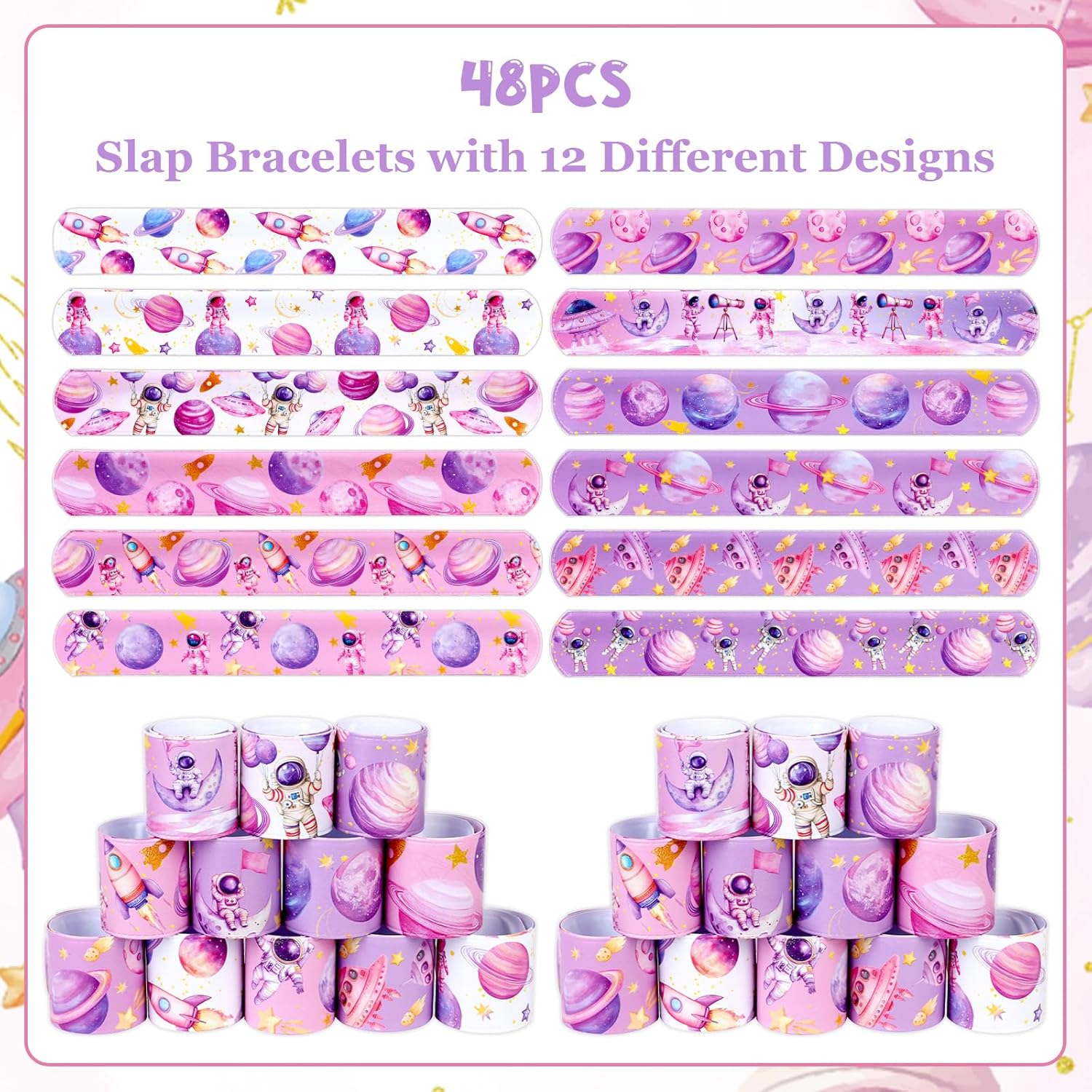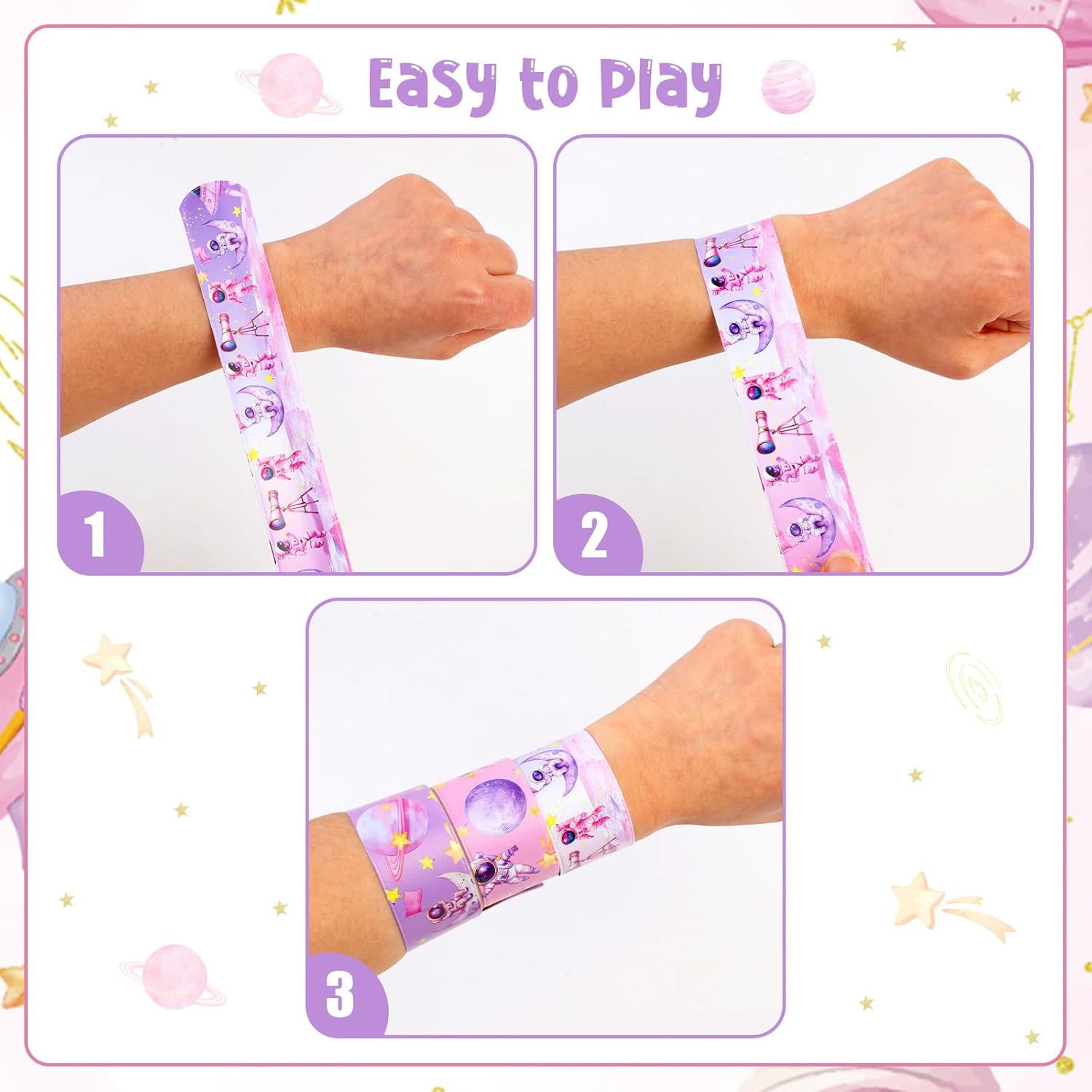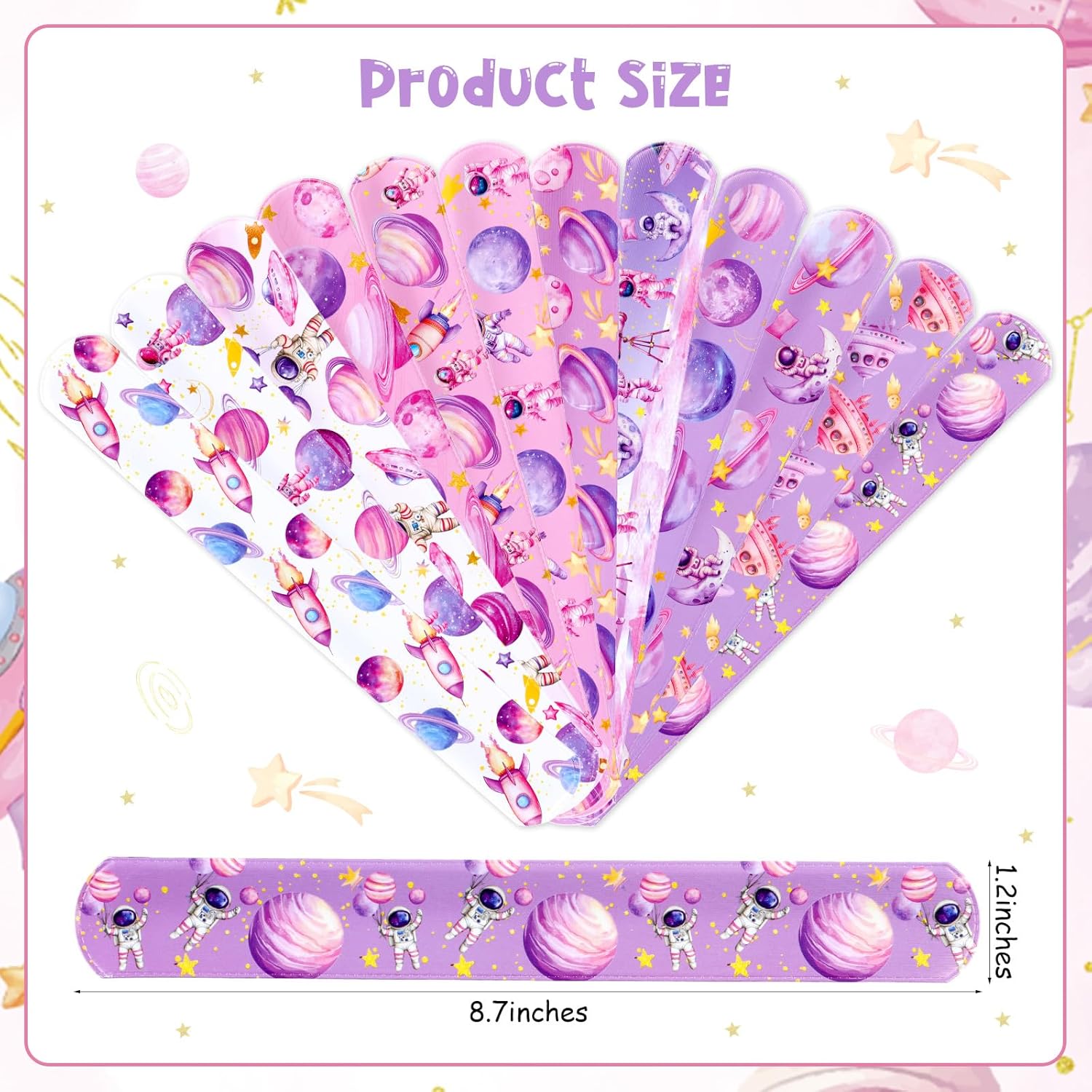 【Contenuto della confezione】Riceverai 48 pezzi di braccialetti Space Slap, 12 modelli diversi, 4 pezzi ciascuno. Stili diversi e quantità sufficiente. Scegli questi braccialetti per bomboniere spaziali per lasciare un'impressione profonda sui tuoi ospiti Design spaziale: progettati con un tema spaziale, questi braccialetti per bomboniere spaziali presentano una vibrante tavolozza di colori rosa con adorabili elementi spaziali come pianeti, razzi e stelle, progettati per deliziare i giovani appassionati di spazio. 【Materiale e dimensioni】 I braccialetti Space Slap sono realizzati in PVC e materiale flessibile per essere indossati comodamente. Dimensioni: 22,1 cm di lunghezza e 3 cm di larghezza, si adatta al polso della maggior parte delle persone. La superficie liscia previene le irritazioni e garantisce un'esperienza confortevole per tutti gli ospiti. Facile da indossare: basta mettere il braccialetto sul polso, si adatterà automaticamente alle dimensioni del polso e si adatterà comodamente al polso e non cadrà facilmente. Il design flessibile garantisce che possano essere facilmente indossati e rimossi, rendendoli ideali per feste di compleanno a tema gioco. Ampia applicazione: adatta per baby shower, feste di compleanno spaziali, premi in classe, sacchetti regalo o bomboniere