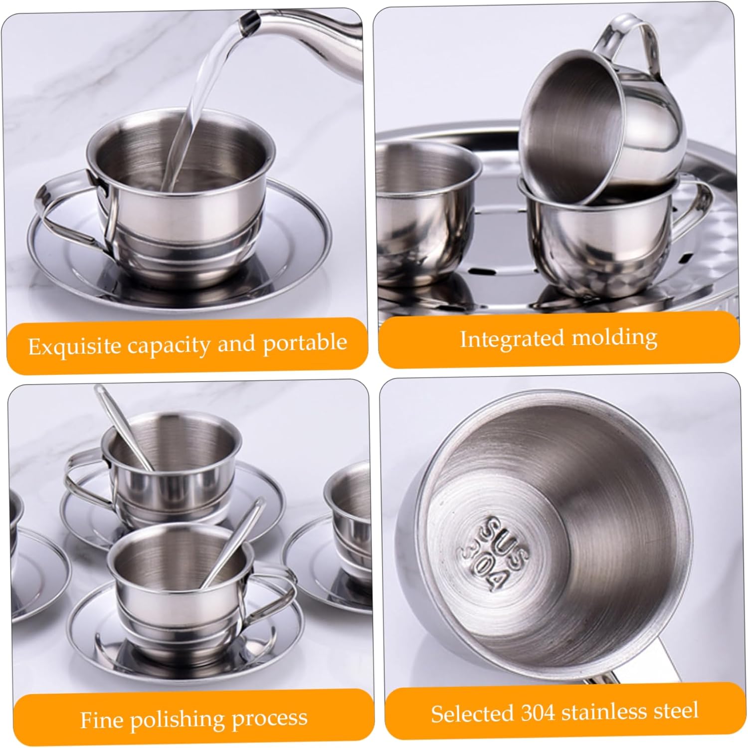 Robusto e facile da pulire: la struttura in acciaio inossidabile garantisce durata e manutenzione senza problemi; La superficie liscia e resistente alla ruggine si pulisce rapidamente per mantenere l'igiene una priorità assoluta. Set da tè per bambini Neutro ed elegante: progettato sia per ragazze che per ragazzi, questo elegante set da tè presenta una finitura in acciaio inossidabile senza tempo che completa qualsiasi stanza dei giochi con fascino moderno e inclusività Design sicuro e resistente al calore: realizzato in acciaio inossidabile resistente al calore, questo set da tè per bambini garantisce un gioco sicuro senza il rischio di ustioni o rotture, rendendolo ideale per l'immaginazione attiva dei bambini Tazze compatte da 70 ml: Ogni set contiene quattro tazze da 70 ml con dimensioni perfette per le mani dei più piccoli, consentendo per una presa comoda e una facile maneggevolezza, incoraggiando al tempo stesso il gioco sociale tra i bambini. Set da tè per bambini e bambine Gli elementi essenziali del set completo: il set è composto da quattro tazze, quattro piattini e quattro cucchiai e ha tutto il necessario per un'esperienza coinvolgente di tea party che incoraggia la condivisione e il gioco di ruolo