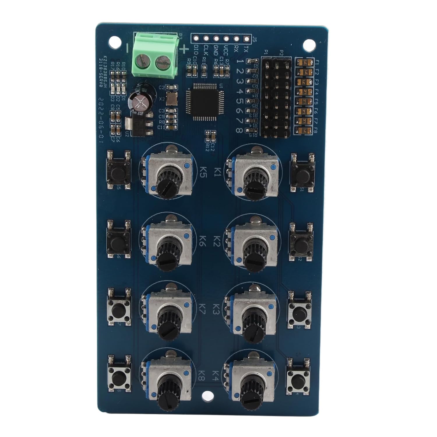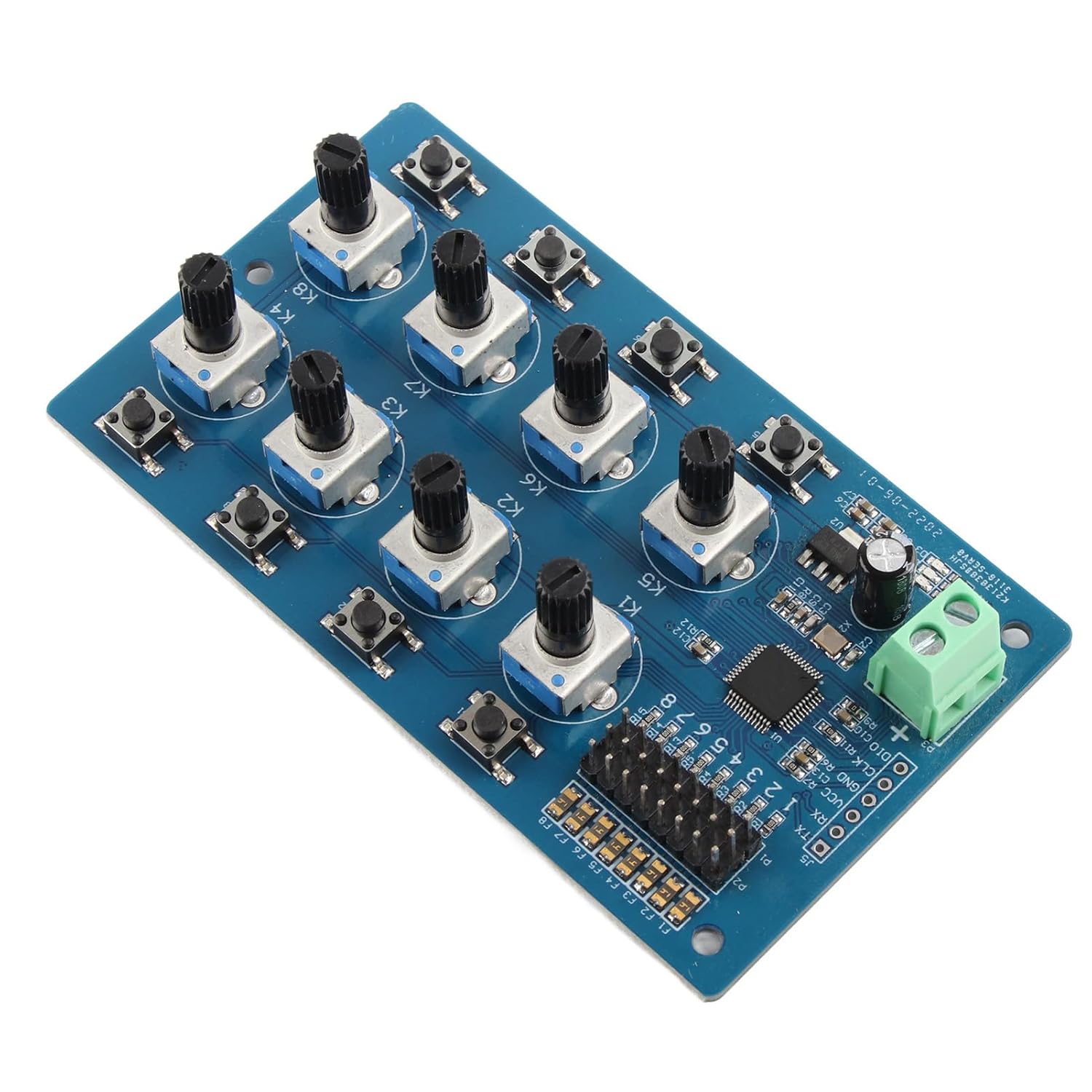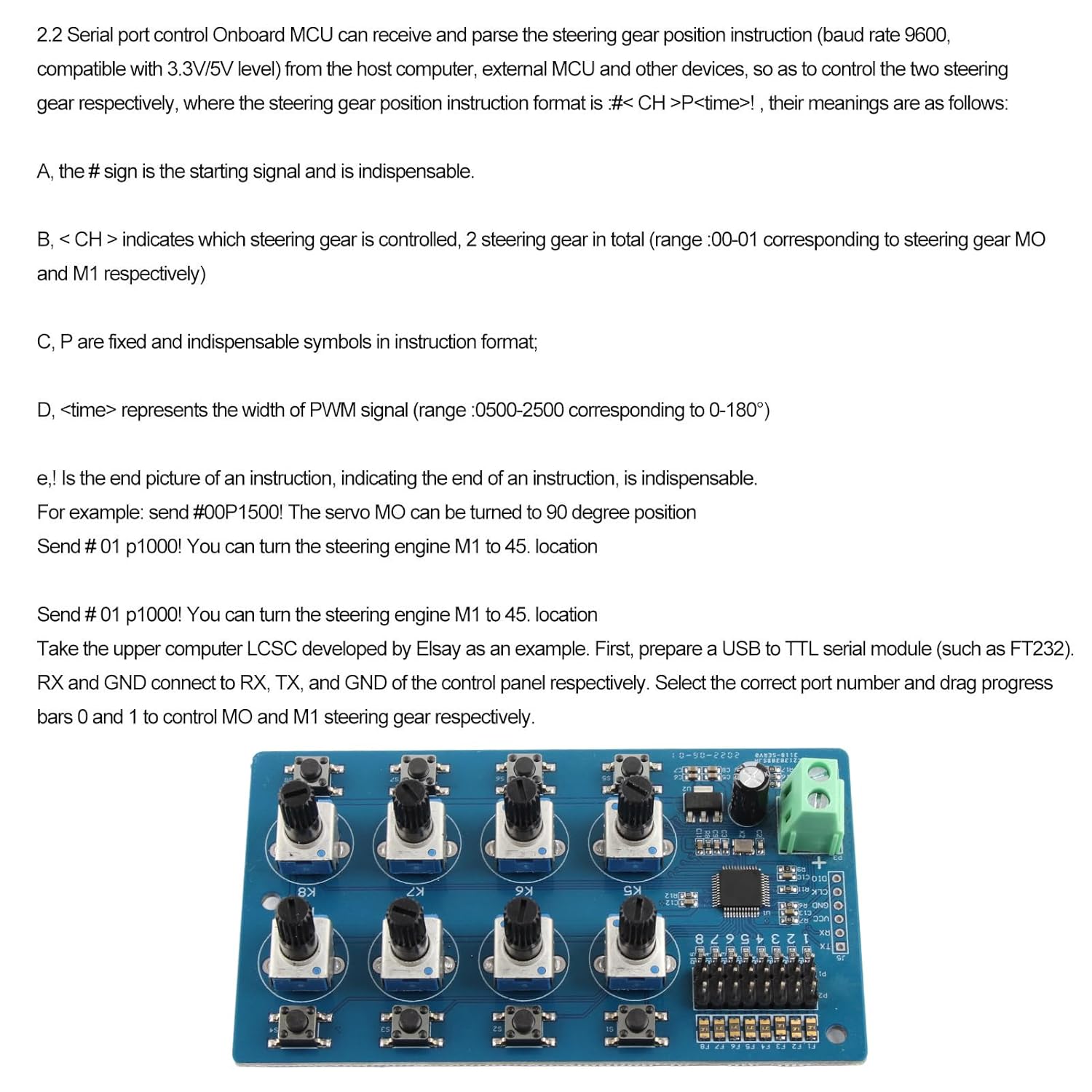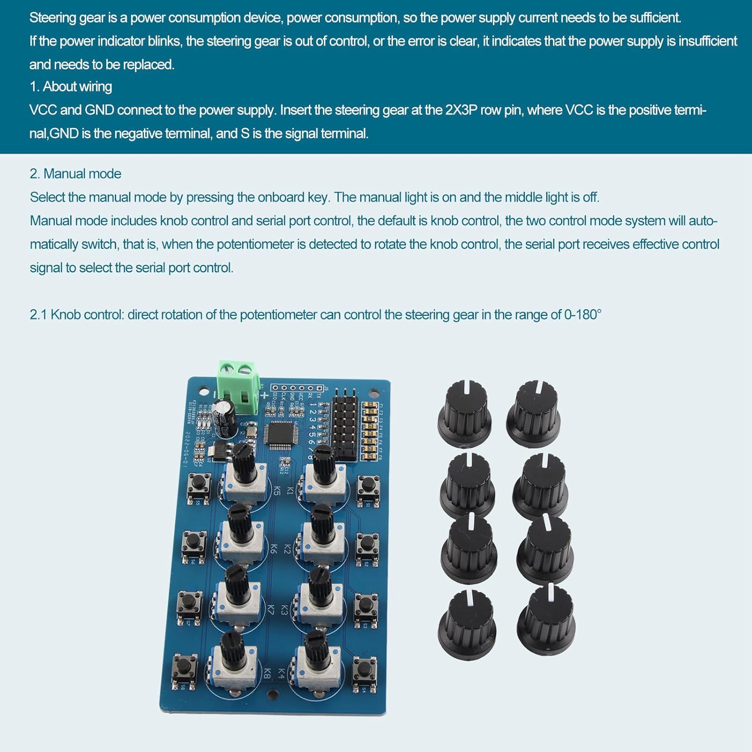 STM32 integrato: l'STM32 integrato viene utilizzato per generare segnali PWM ad alta risoluzione, con controllo preciso e plug and play Modalità commutabile: il servo controller supporta la modalità manuale e la modalità di ritorno, che può essere commutata tramite pulsanti, il che è molto comodo da usare e utilizzare Controllo della manopola: il controller dello sterzo ha una regolazione della manopola a 8 vie e ruotando direttamente il potenziometro è possibile controllare la rotazione dello sterzo nell'intervallo da 0 a 180 gradi Alta precisione: la precisione di controllo del controller dello sterzo è di 0,09 gradi, l'errore è estremamente piccolo e la risposta è sensibile Indicatore LED: il servo controller ha un indicatore di modalità. Quando il LED lampeggia, significa che la corrente di alimentazione non è sufficiente e l'alimentatore deve essere sostituito
