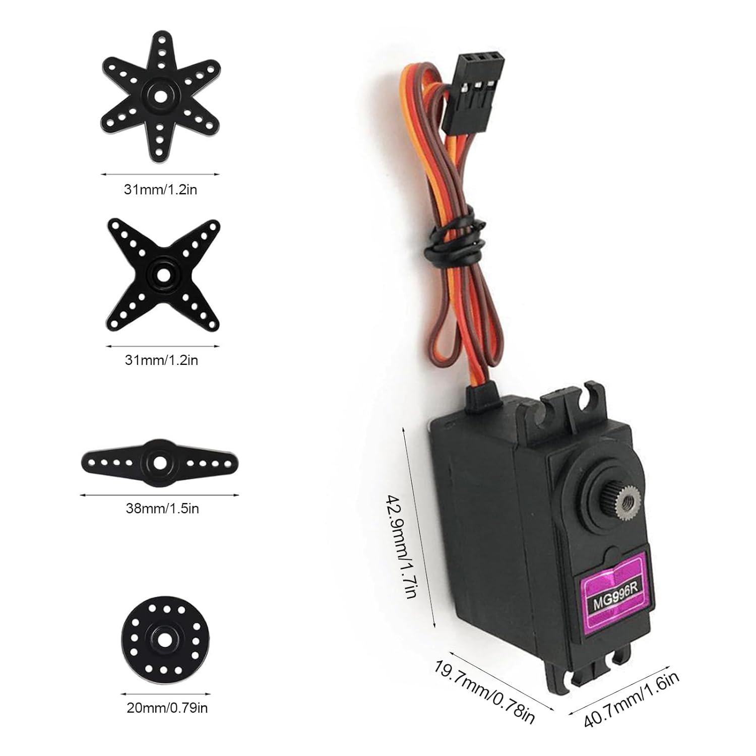 【Materiale】: Scatola dello sterzo interamente in ferro, l'ingranaggio è stabile e affidabile e non facile da rompere. E ha le caratteristiche di prestazioni stabili, risposta rapida, forte capacità anti-interferenza, bassa rumorosità, rapida dissipazione del calore e lunga durata. 【Informazioni Sulle Dimensioni】: La dimensione di questo servomotore è 40,7 x 19,7 x 42,9 mm. Il peso è di circa 66,2 grammi. La lunghezza del cavo di collegamento è di 30 cm (il giallo è il cavo del segnale, il rosso è il cavo di alimentazione e il marrone è il cavo di terra). L'intervallo dell'angolo controllabile del servomotore è di 180 gradi. 【Specifiche】: La coppia di lavoro è di 13 kg/cm. (Tensione consigliata: 5 V, consumo energetico: 3 A). La velocità di reazione è di 0,17 secondi/60 gradi (4,8 V); 0,13 secondi/60 gradi (6,0 V). 【Compatibilità】: Questo servomotore è compatibile con la maggior parte delle porte del ricevitore standard. Riceverai un servo interamente in ferro a 180° e accessori (gli accessori includono volante, viti di fissaggio, manicotti in gomma ammortizzanti e manicotti in alluminio). 【Ampia Applicazione】: Questo servomotore è adatto per robot bipedi in scala 1:10 e 1:8, veicoli fuoristrada, camion, veicoli da arrampicata, manipolatori, barche telecomandate e la maggior parte dei progetti fai-da-te.