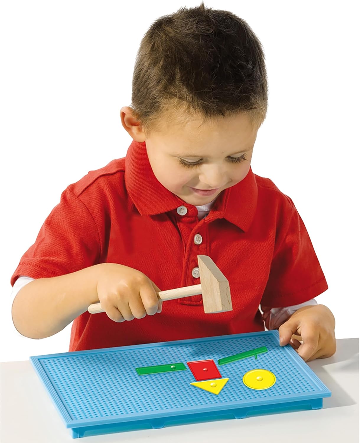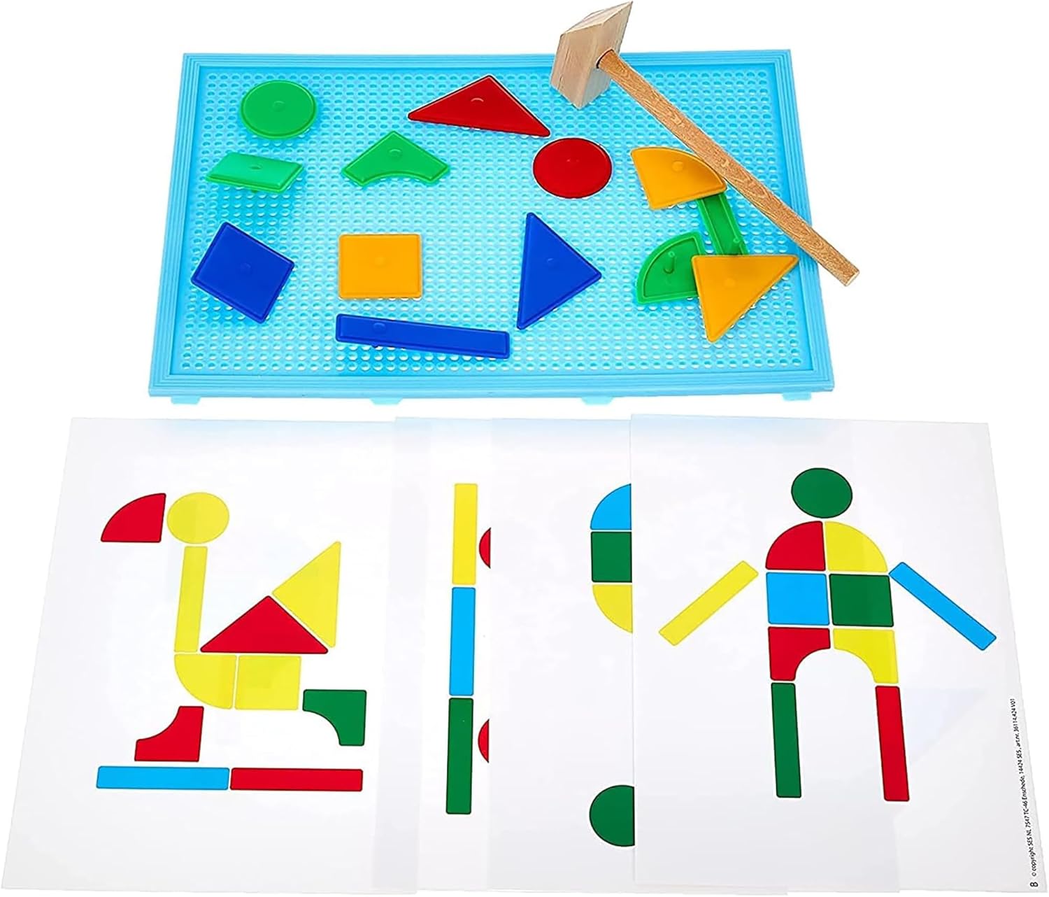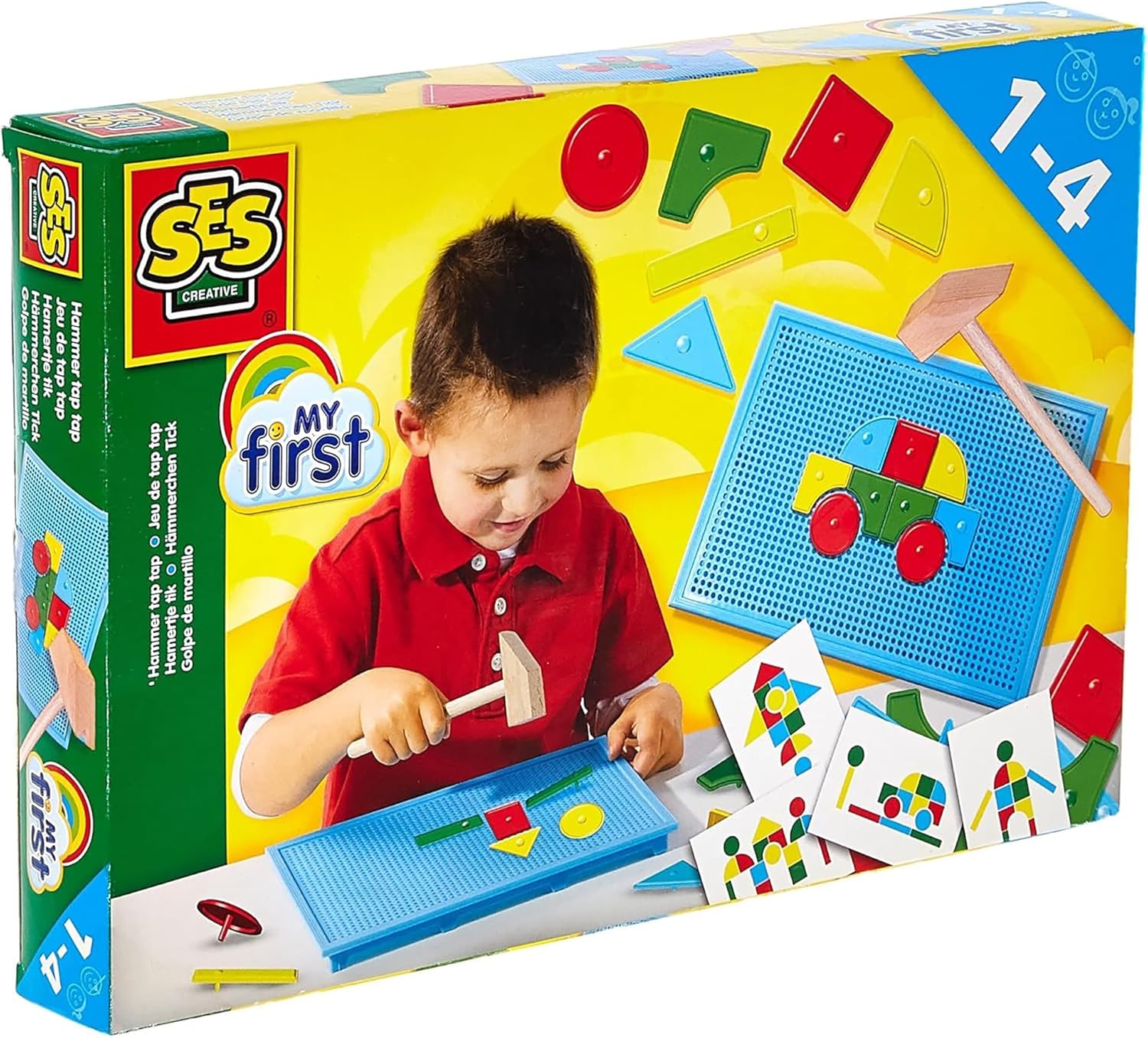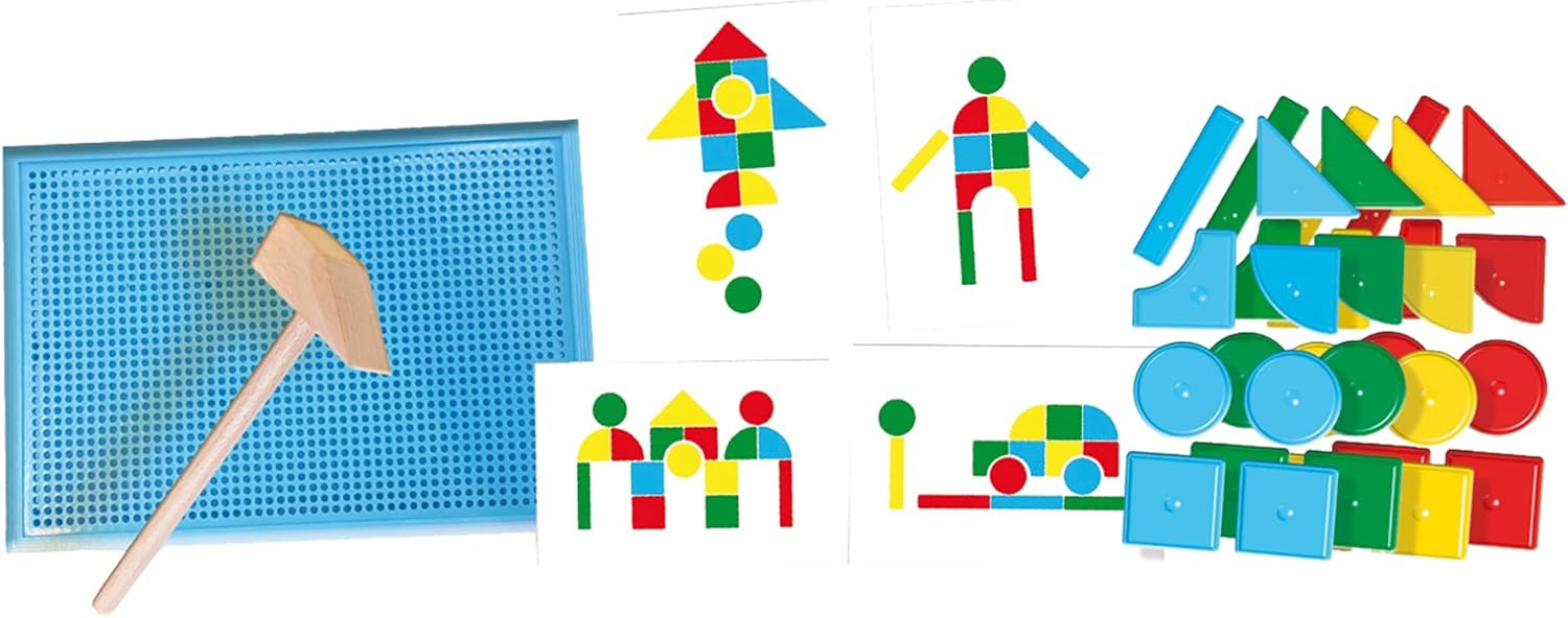 In dem Hämmerchenset befinden sich: - 1 Holzhämmerchen - 1 blaue Plastik-Lochplatte - 32 Plastikstecker (in rot, gelb, blau, grün) - 4 Pappkarten, doppelseitig bedruckt mit 8 Motiven Das Set ist für Kinder ab 1 Jahr geeignet und vom Prinzip her recht einfach. Die Kinder können mit dem Hämmerchen verschiedene Motive, entweder nach den Karten oder frei, auf der Lochplatte zusammenhämmern. Dabei sind keine Nägel, wie das bei dem Set meiner Großen der Fall ist, notwendig. Die Plastikteilchen verfügen alle über eine Nase, die in die Lochplatte gehämmert werden muss. Das finde ich auf der einen Seite gut, auf der anderen seit macht mit die Stabilität des Produkts ein wenig Sorge, denn das Plastik ist doch arg dünn. Kinder ab 1 Jahr habe noch nicht so die Feinmotorik, weswegen sie gerne auch mal wild und fest drauf los hämmern. Aber überleben das die Teile auch auf Dauer? Fakt ist, meine 18 Monate alte Tochter war ganz begeistert von dem Set und wusste direkt was damit anzufangen. Sie setzte sich an den Tisch, breitete die Teile um sich aus, ignorierte die Motivkarten und fing an zu hämmern. Der Hammer ist auch schön stabil, so dass man auch problemlos mal daneben auf den Tisch schlagen kann. Das Wiederherausziehen war dann etwas zu schwer noch für sie und sie benötigte Hilfe. Ansonsten kam sie sehr gut alleine zurecht. Auch jetzt, einige Tage später hat das Spiel seinen Reiz für sie nicht verloren. Mag sie es spielen, kommt sie mit dem Karton an den Tisch, packt es aus und legt los. Ist die Platte voll oder will sie neu beginnen, motzt sie kurz, damit man ihr hilft und weiter geht es, bis das Spiel wieder aufgeräumt wird. Fazit: Sieht man mal von dem dünnen Plastik ab, ist es ein tolles Spiel für Kinder ab 1 Jahr. Man muss als Elternteil keine Angst haben, dass sie sich an den Nägeln verletzen oder diese in den Mund nehmen. In der Form ist es ideal für Kleinkinder, ich hätte mir lediglich ein stabileres Plastik bei den Bauteilen gewünscht.