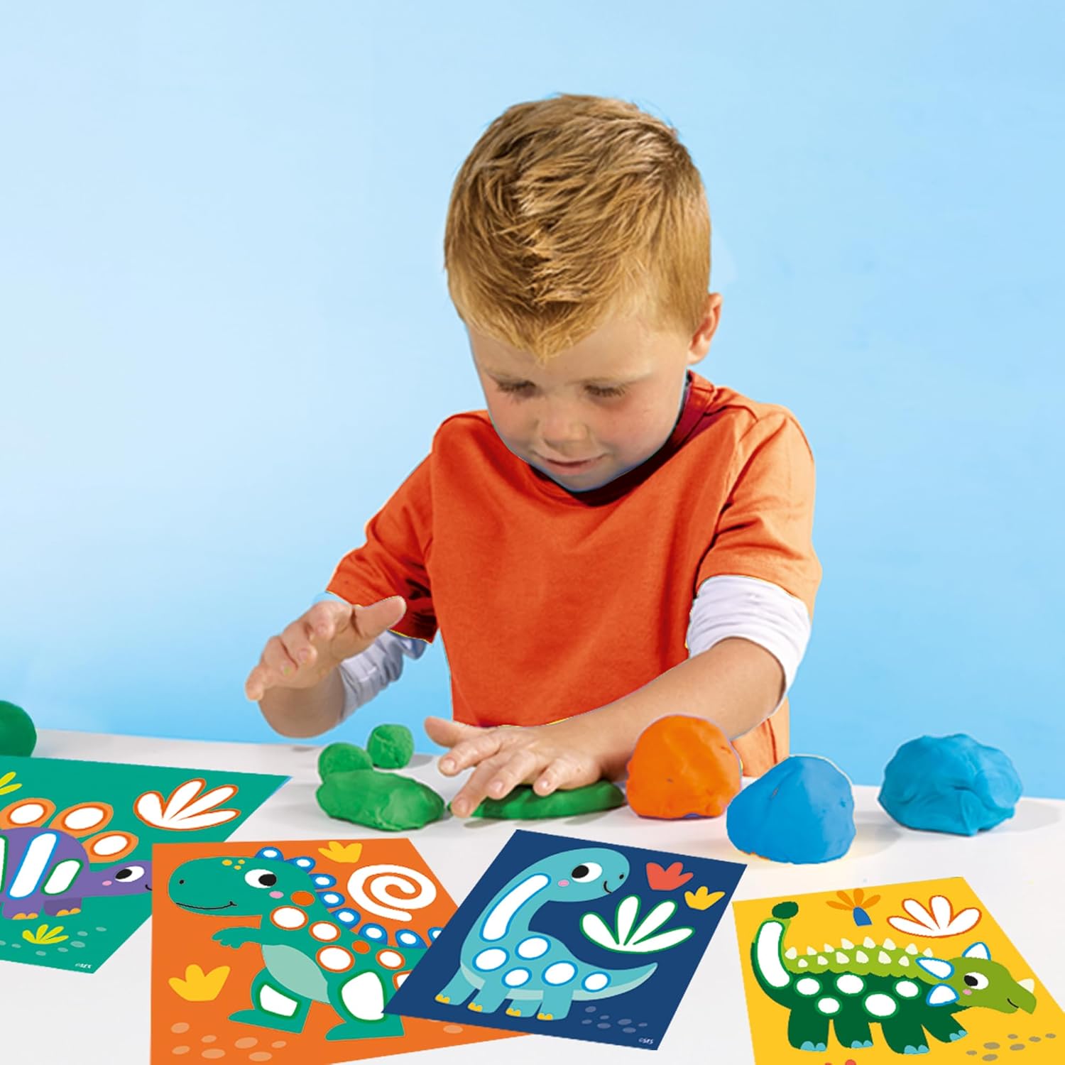 Scopri il mondo dei dinosauri con My First – Carte attività da impastare Dinos! Riconosci le forme, combina i colori e posizionali con la plastilina sui biglietti Dino. Il set contiene plastilina blu, arancione e verde (40 g ciascuna) e quattro carte riutilizzabili con motivi a dinosauri, ideali per ore di divertimento. Stimola le capacità motorie e la creatività del tuo bambino, imparando a riconoscere e ricreare colori e forme. Le carte laminate sono riutilizzabili e durevoli: per sempre nuove avventure con i dinosauri preferiti! Set perfetto per promuovere l'immaginazione e il pensiero logico e far immergere i bambini nell'emozionante mondo dei dinosauri!