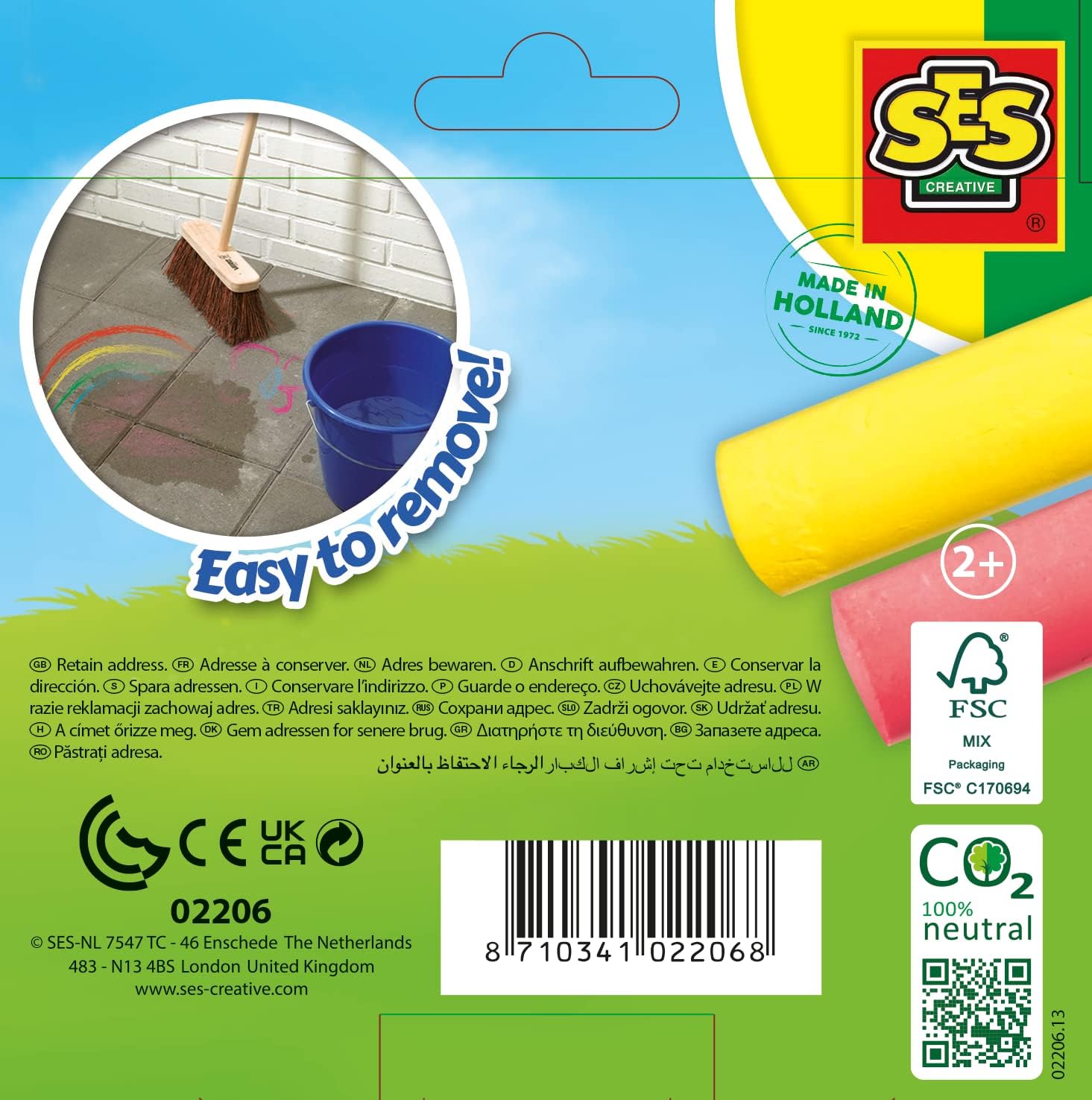 Grandi gessi da pavimento in 6 colori. SES - da oltre 40 anni produce giochi e giocattoli educativi prevalentemente orientati alle attività creative; tutti i prodotti sono inventati, sviluppati e fabbricati in Olanda. Da 3 anni
