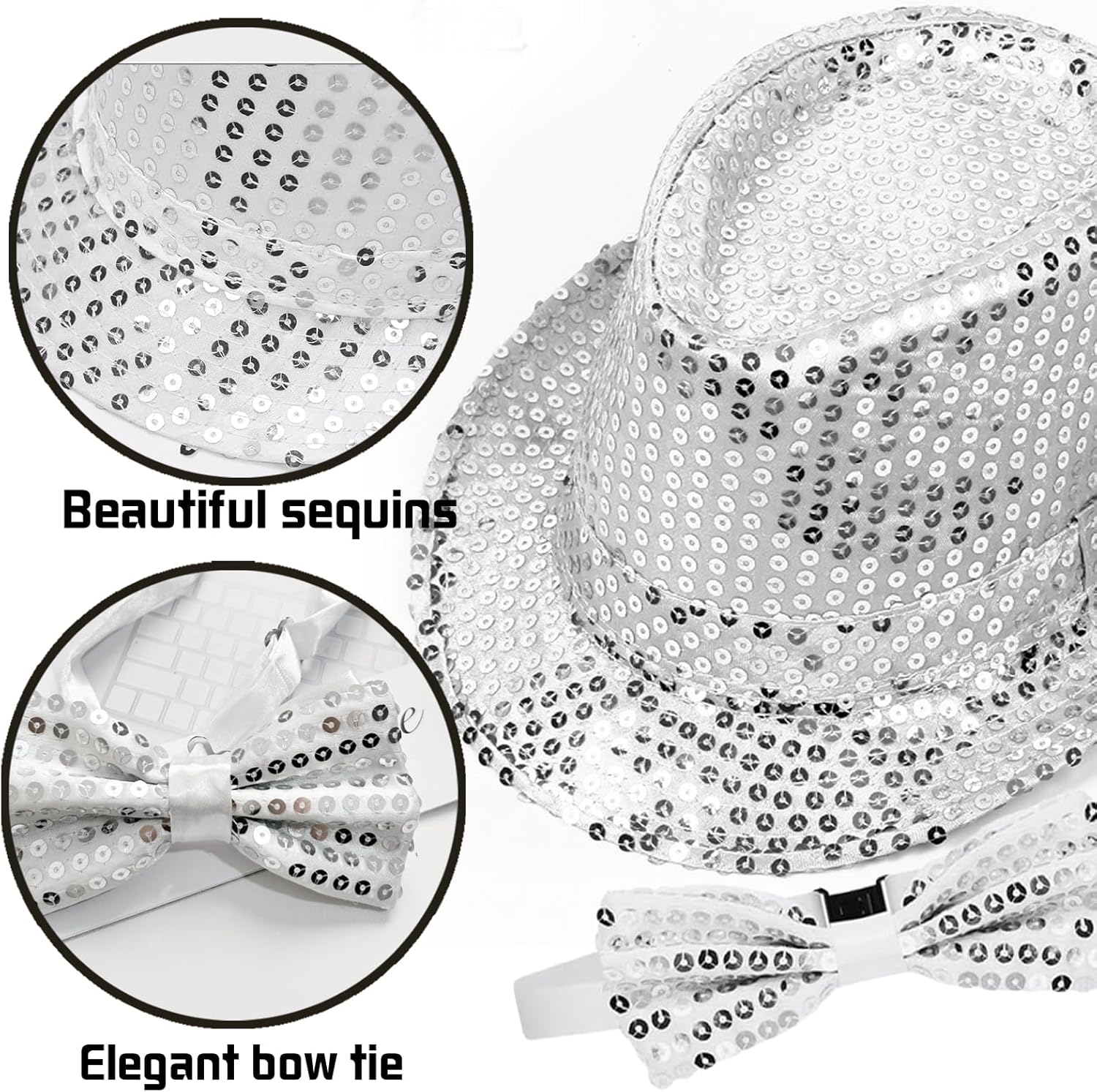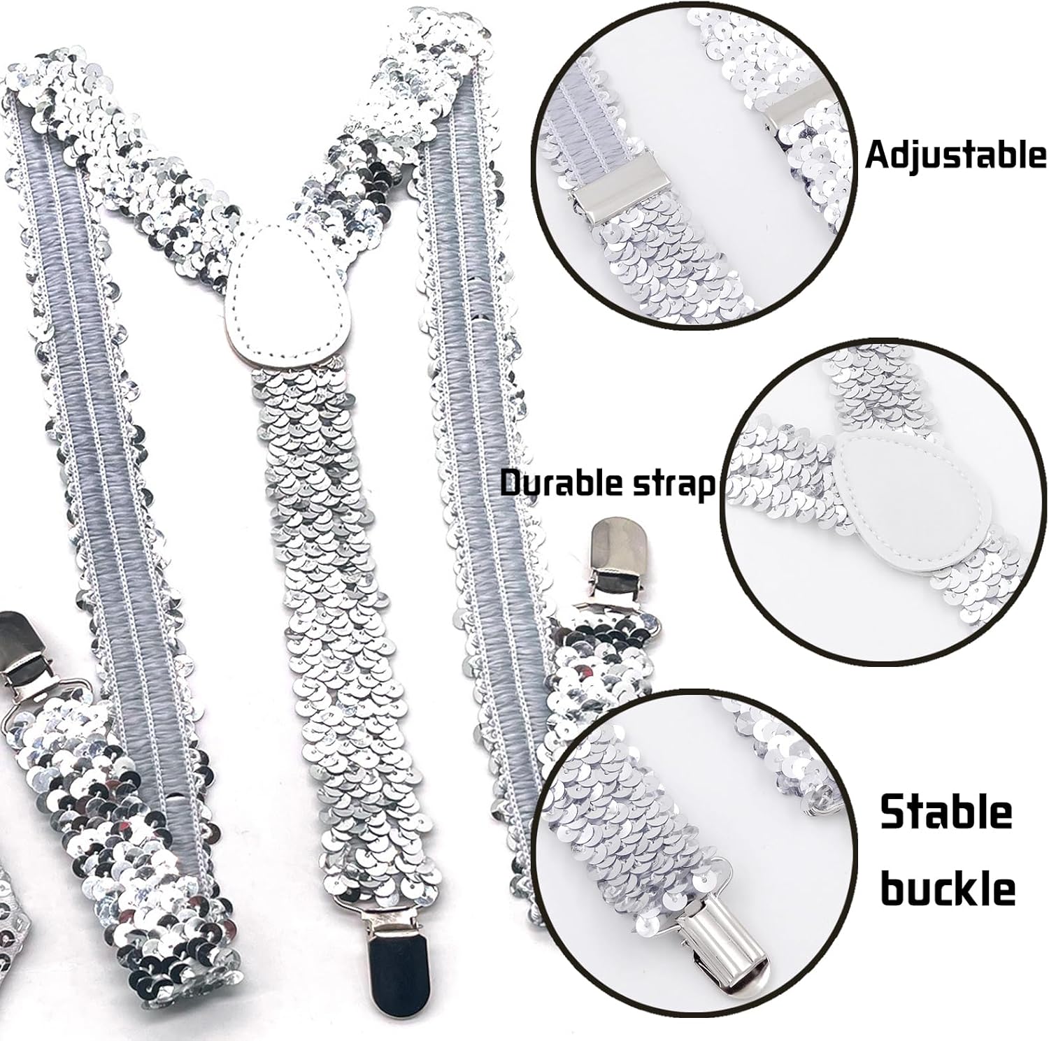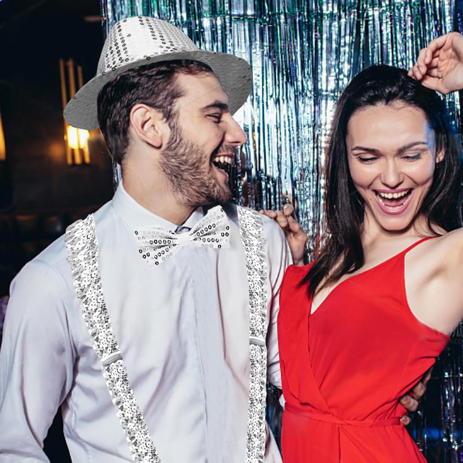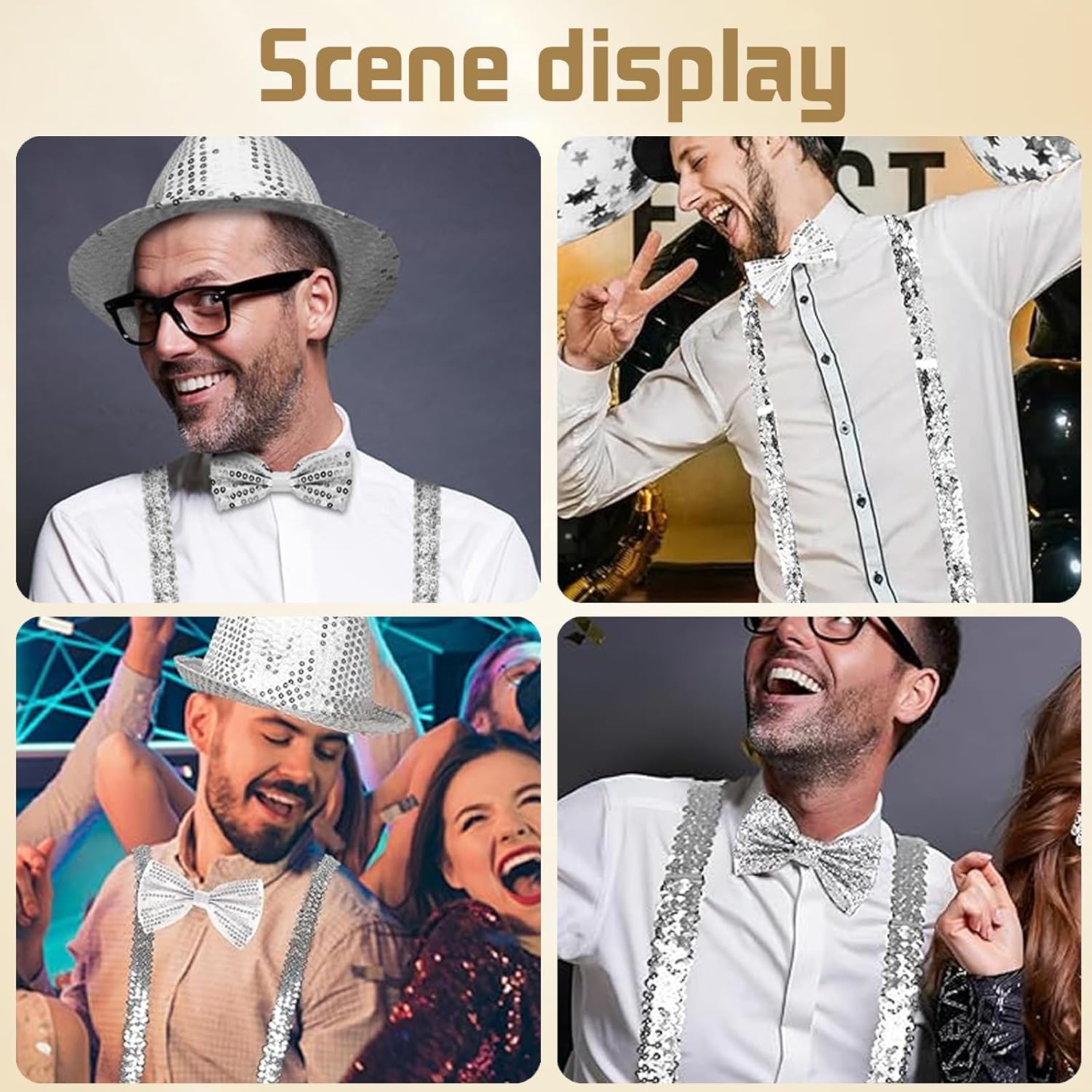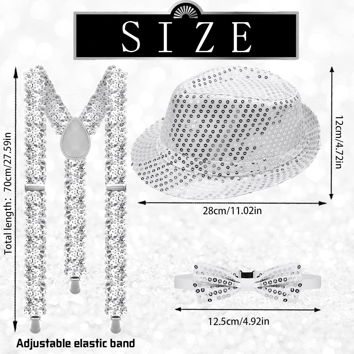 Ensemble correspondant parfaitement à la description et aux photos, avec le chapeau, les bretelles et le noeud papillon en sequins argentés. Ça rend très bien, c'est parfait pour une soirée déguisée ou un photobooth