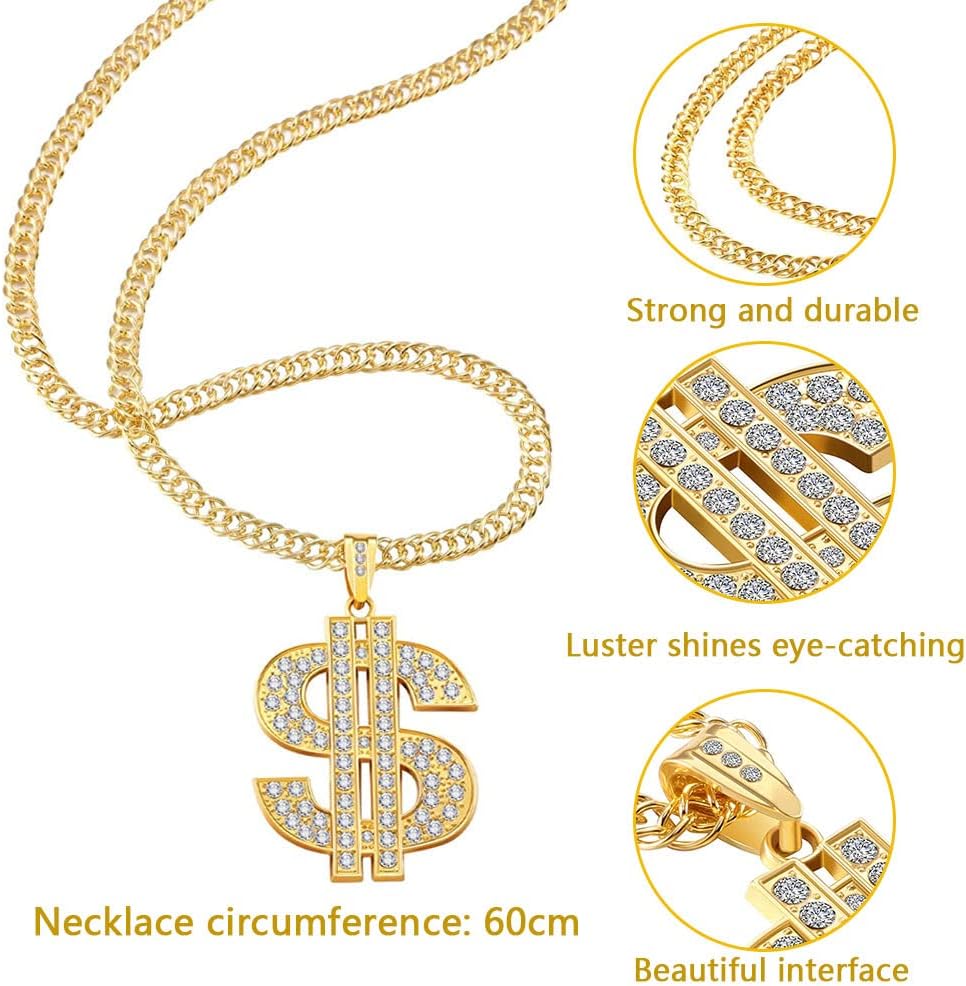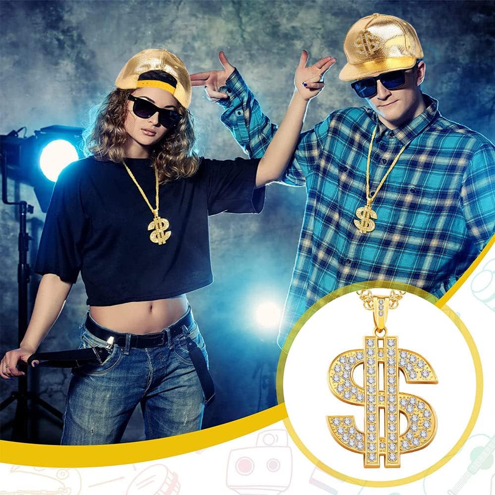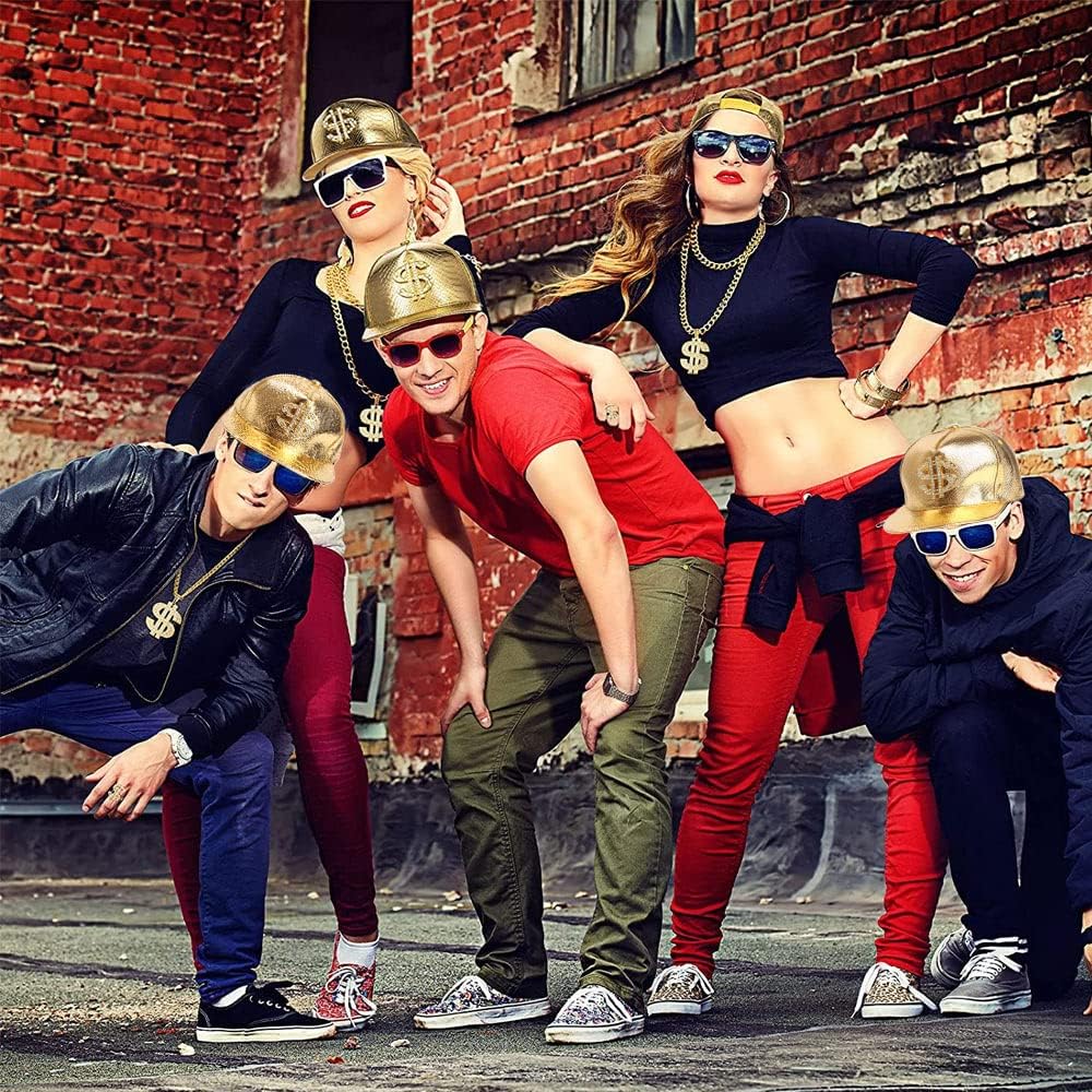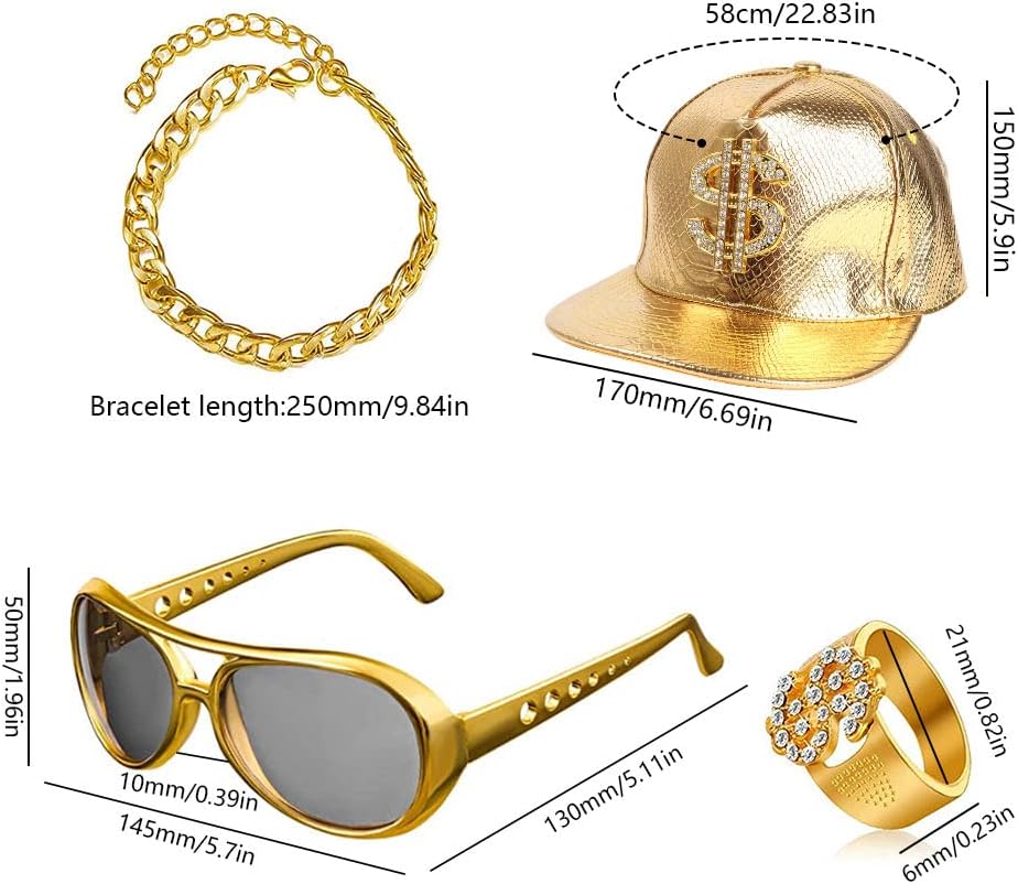 Caratteristiche: Il kit di costumi hip hop può aiutarti a adattarti a un tema degli anni '80 o '90. Perfetto per i fan dell'hip hop, questo set hip hop dorato lucido ti farà sembrare cool ed elegante e impressionerà allo stesso modo i tuoi ospiti e i tuoi ospiti. I set di vestiti hip hop sono adatti per la maggior parte degli stili di feste come carnevali, concerti, feste di trucco e feste a tema. Specifica: Collane, Bracciali e Anelli in Finto Oro: Bracciale: lungo circa 20 cm Collana: lunga circa 72 cm, segno del dollaro: 55 x 65 mm Anello: diametro interno circa 18 mm (regolabile), simbolo del dollaro: 20 x 30 mm Le catene e gli anelli sono realizzati in acciaio inossidabile dorato con strass artificiali all'esterno, i materiali di alta qualità garantiscono la robustezza e la durata degli accessori, l'eccellente lucentezza e l'aspetto estetico lo rendono l'accessorio ideale. Cappello da Baseball: Colore: Oro Dimensioni: ca. 56 - 60 cm / 22,83 - 23,62 pollici, taglia adulto. Il cappellino da baseball è realizzato in pelle sintetica, comodo da indossare anche tutto il giorno, lavabile e pieghevole. Occhiali da Sole Anni '80: Colore: Oro Dimensioni: Larghezza lente 63 mm, Altezza lente 54 mm, Ponte 15 mm, Lunghezza braccio 140 mm, Il telaio leggero è realizzato in policarbonato e acrilico per una maggiore durata. Contenuto del Pacchetto: 1 x cappello hip hop 1 x collana con il simbolo del dollaro 1 x anello con il simbolo del dollaro 1 braccialetto in oro finto 1 x occhiali hip hop Garanzia Post-vendita: Ti assicuriamo che ogni prodotto viene attentamente ispezionato e quindi consegnato a te. In caso di problemi di qualità, non esitate a contattarci.