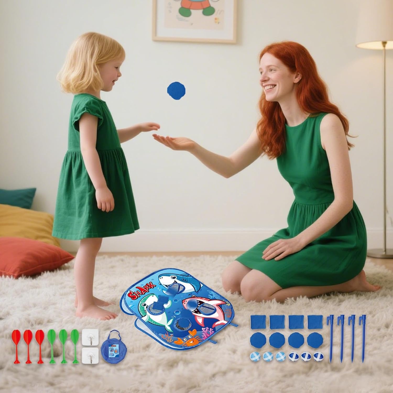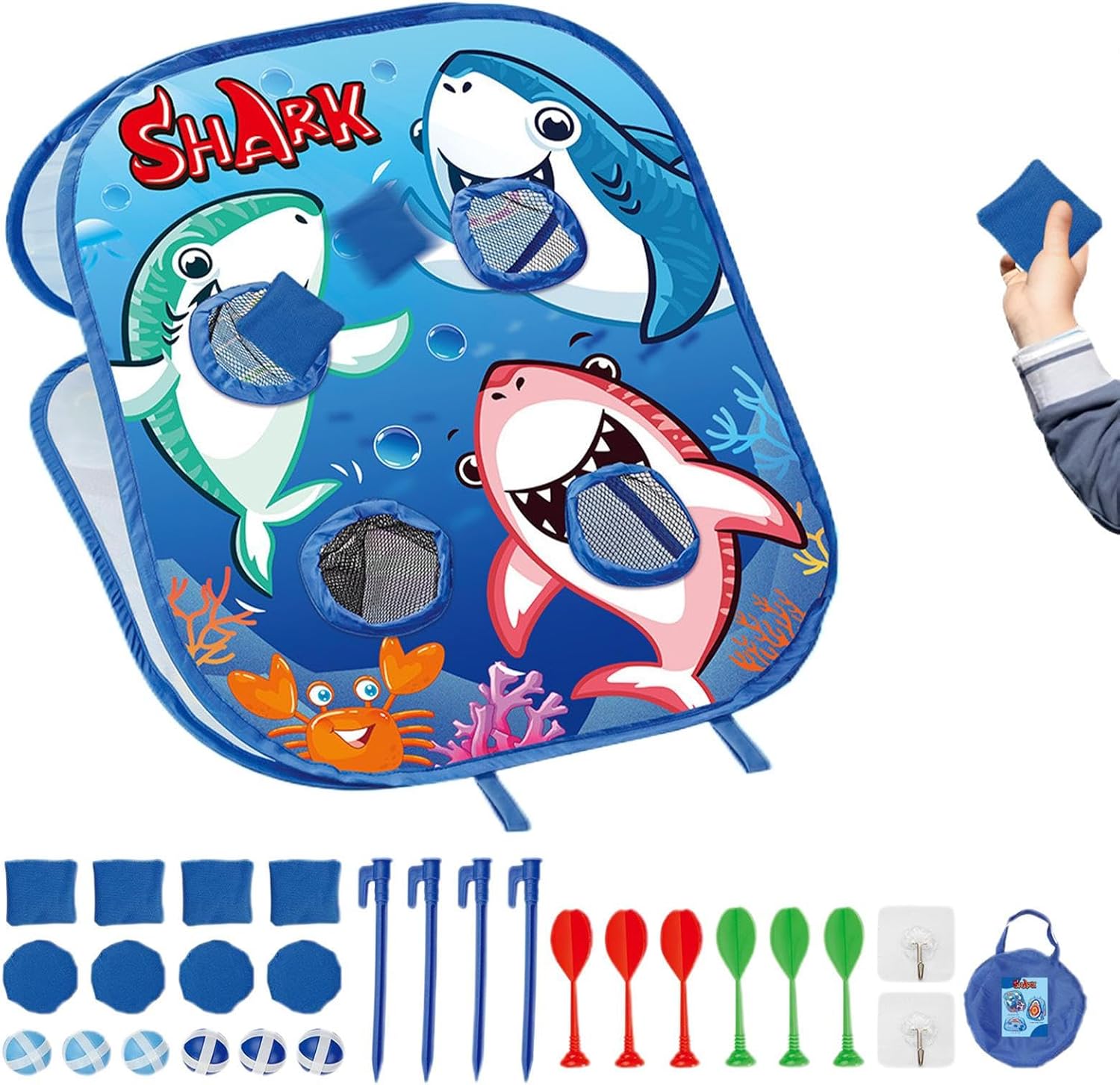 Facile da usare in ambienti interni ed esterni: con struttura leggera e semplice processo di installazione, ideale per giardini, aree residenziali e molto altro ancora, offre un'esperienza di gioco coinvolgente in diversi ambienti Coordinazione e controllo: rafforza l'integrazione sensoriale attraverso obiettivi precisi, migliora la coordinazione del corpo e allena la tecnica di lancio, il controllo della pista di lancio e la percezione spaziale in modo efficace Esperienza di gioco senza preoccupazioni: i morbidi sacchetti antiscivolo garantiscono una presa sicura, mentre il materiale durevole garantisce un uso duraturo, così i bambini di tutte le età godono il gioco in modo sicuro senza rischio di lesioni Dettagli premurosi: perfetti come giochi di festa con manuale illustrato, accessori raffinati e sacchetti di sabbia sufficienti per composizioni di gioco variabili, che garantiscono divertimento cooperativo con gli amici. Apprendimento giocoso: gioco di tiro a tema squalo per bambini 3-5 anni. I colori vivaci e il concetto accattivante risvegliano l'esplorazione durante le attività di gioco interattive.