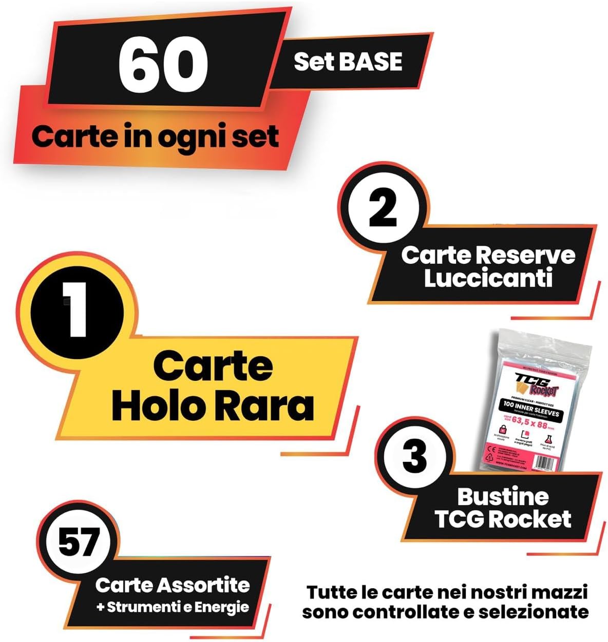 60 Carte Originali Italiane: Il set offre 60 carte autentiche, garantendo varietà e qualità senza alcun doppione. Carte Luccicanti: Include almeno 3 carte luccicanti (rare, olografiche o reverse) che aggiungono un tocco di fascino alla tua collezione. Protezione Premium: Le carte luccicanti sono protette da bustine trasparenti di alta qualità per assicurare la loro conservazione nel tempo. Ampia Selezione: Ogni carta è stata selezionata con cura per garantire una collezione variegata e interessante. Ideale per Collezionisti: Perfetto per chiunque desideri espandere la propria collezione con carte originali e rare. Perfetto per il Gioco: Le carte incluse sono ottime anche per arricchire i mazzi di gioco, rendendo le partite più emozionanti. Senza Doppioni: Ogni carta è diversa, garantendo un set vario e completo, ideale per chi vuole evitare ripetizioni.