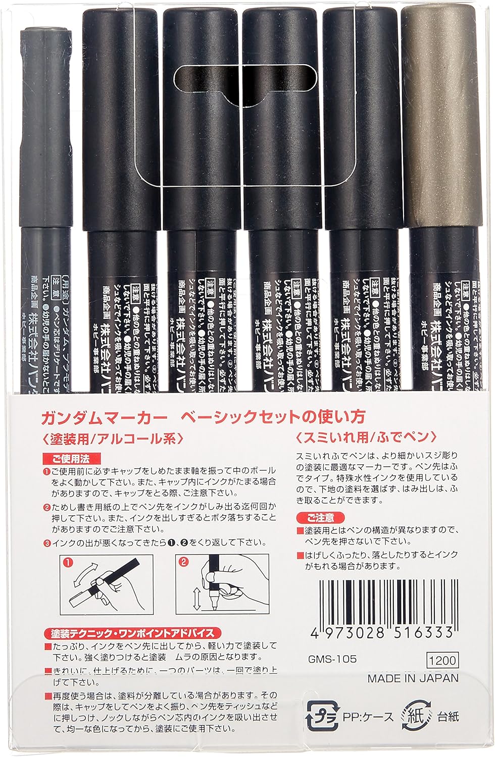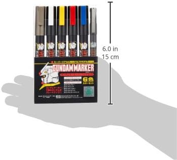 Set di sei pennarelli. Include pennarello grigio, bianco, giallo, rosso, blu e grigio a linee sottili per le linee dei pannelli. * Pennarello Gundam di base a 6 colori