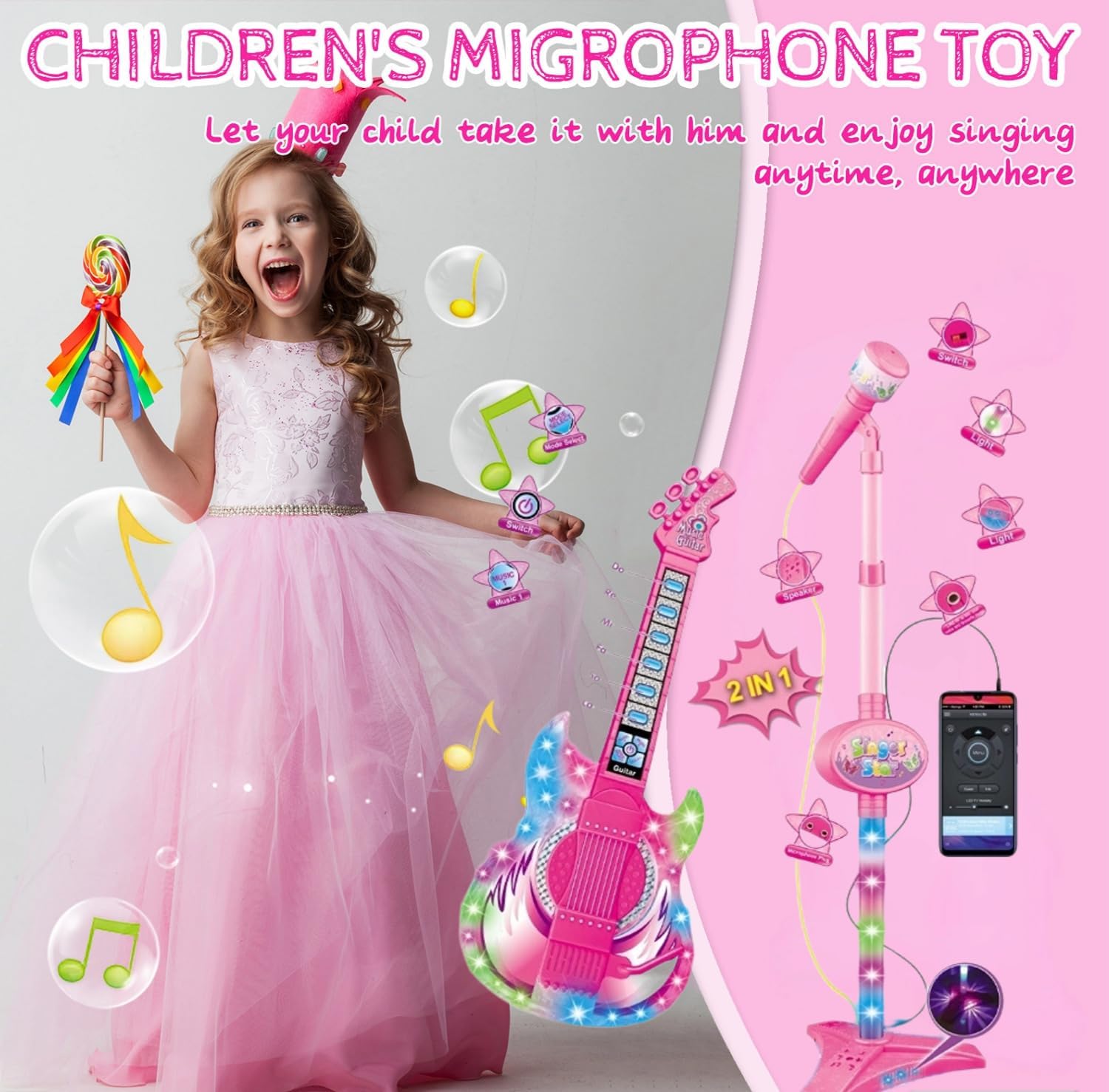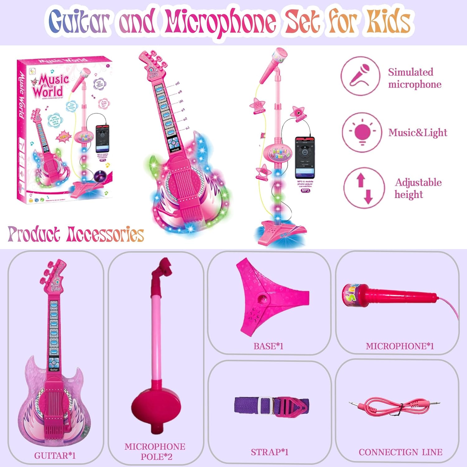 Materiale durevole e robusto: i nostri giocattoli per macchine per karaoke sono realizzati con materiali ABS di alta qualità, resistenti, non tossici, resistenti all'usura e alle cadute. Bordi lisci, non danneggeranno la mano dei bambini durante il gioco. Le dimensioni perfette e il peso leggero sono adatti ai bambini da trasportare e giocare. Un avviso!!! È un giocattolo per bambini, non uno strumento musicale professionale, non può essere accordato.,Giocattolo per l'apprendimento precoce della chitarra per bambini: la musica gioca un ruolo cruciale nello sviluppo dei bambini! La chitarra elettrica per neonati e bambini piccoli con melodia di filastrocche e luci colorate abbaglianti accompagna la crescita di ragazze e ragazzi promuovendo l'interesse dei bambini per la musica e aiutandoti a insegnare a tuo figlio i ritmi o altre teorie musicali. Il set di microfoni simula scenari di parlato e performance sempre e ovunque, migliorando la sicurezza e le abilità sociali di tuo figlio.,Set di microfoni multifunzione: porta le prestazioni di tuo figlio a nuovi livelli con il microfono e la chitarra delle nostre ragazze. Che tu voglia tenerlo in mano o toglierlo dalla base per uno spettacolo teatrale, ti sentirai una vera star. La base può essere facilmente smontata per un comodo trasporto e stoccaggio, consentendo a tuo figlio di mostrare il suo talento ovunque. Questo giocattolo musicale per cantare è perfetto per ispirare il loro amore per la musica e le performance Set chitarra e microfono per bambini: il set giocattolo per chitarra include una chitarra rosa, un microfono, un supporto regolabile da 45 cm a 90 cm e un cavo di collegamento, e una clip per microfono girevole a 180° fornisce angolazioni facili. Lascia che i bambini si scatenino come una vera superstar e soddisfino la loro voglia di esibizione, perfetto per i principianti che vogliono imparare a suonare la chitarra. Può collegare il tuo MP3 o il tuo cellulare tramite il cavo AUX incluso per riprodurre i tuoi brani. Musica! Cantare non è mai stato così divertente. Regalo ideale per ragazze e ragazzi: la chitarra elettrica è perfetta come regalo per i piccoli musicisti per aumentare l'interesse dei bambini per la musica e il senso musicale e aumentare la loro attenzione e capacità creativa. Ideale per gare di karaoke in famiglia, feste di compleanno e occasioni speciali. Il tuo piccolo musicista si innamorerà di questo set da gioco karaoke e si godrà i suoi momenti felici con la musica