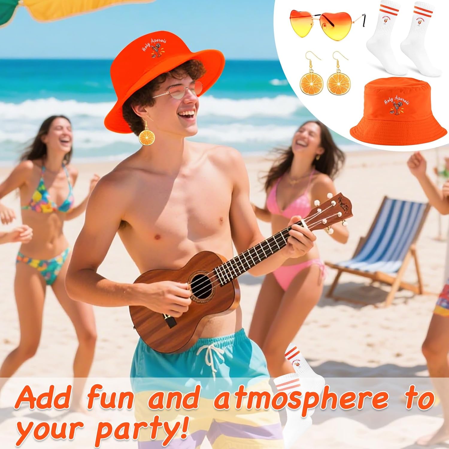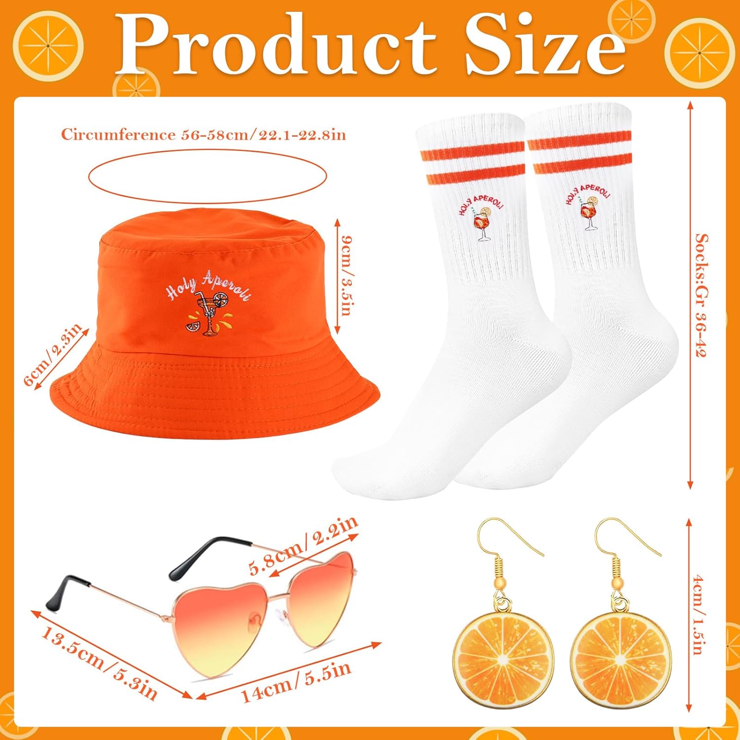 Cet ensemble de déguisement contient : - un chapeau bob orange vif avec broderie Aperol exclusive, - des lunettes de soleil rétro en forme de cœur à dégradé orangé - une paire de boucles d'oreilles rondes motif tranche d'orange et logo Aperol. - une paire de chaussettes assorties brodées, Point positif : ➕ jolie couleur flashy ➕ kit sympa pour l'été Point à améliorer : ➖ qualité des lunettes (pas sûre qu'elle protège des rayons UV) ✅ Toutefois je mets un 4 étoiles car l'idée est sympa mais il faut garder en tête que c'est un déguisement. Le chapeau est de bonne qualité et les chaussettes aussi, le reste risque de casser à l'usure.