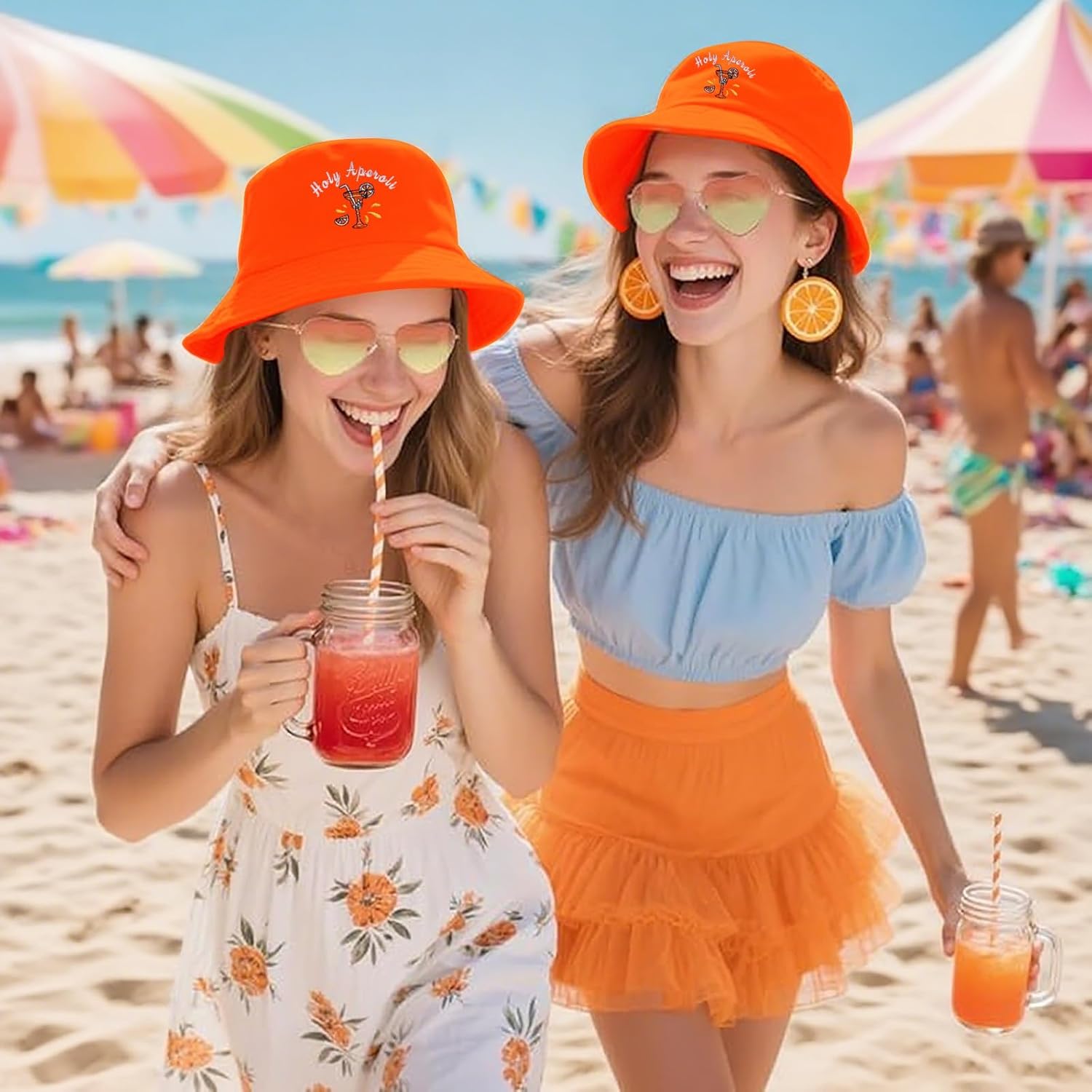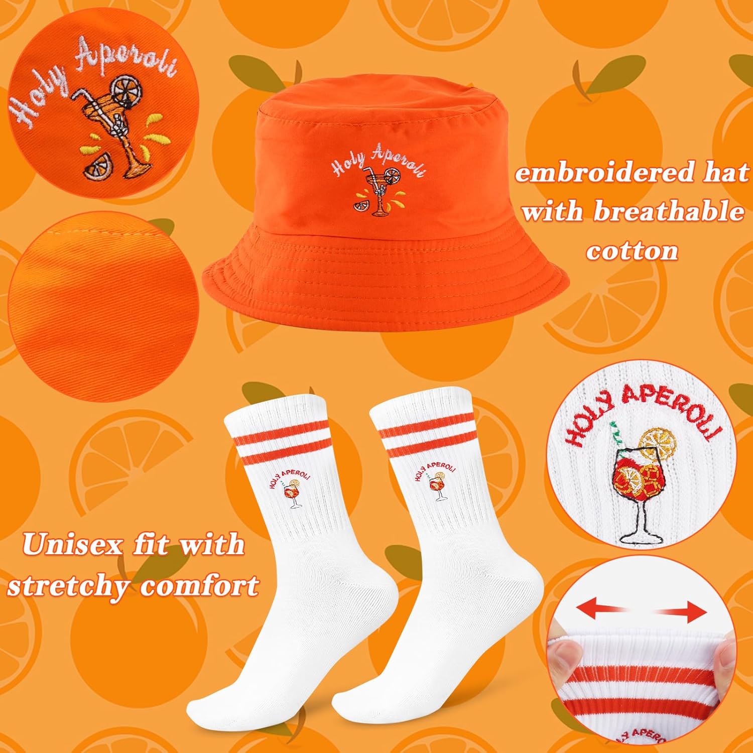 L'ensemble Aperol Spritz est visuellement très festif et attire l'attention avec ses couleurs vives et ses lunettes en forme de cœur. Le bob brodé et les chaussettes sont confortables et agréables à porter lors d'événements estivaux ou de carnavals. Les boucles d'oreilles ajoutent une touche originale et ludique à l'ensemble. Cependant, la taille du bob peut être un peu juste pour certaines têtes et les lunettes ne filtrent pas toujours bien le soleil. De plus, certains matériaux paraissent moins durables après quelques usages. En résumé, c'est un kit sympa pour l'ambiance et les photos, mais il faudra rester réaliste sur la qualité et l'ajustement.