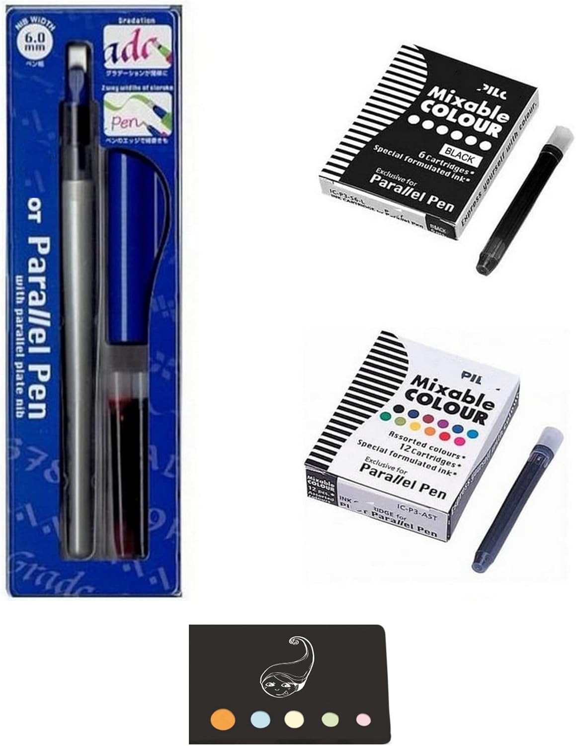 Il set comprende: penna stilografica Pilot “Parallel Pen” per calligrafia: Pennino per calligrafia in acciaio inox tagliato al laser. Ricaricabile con cartucce IC P3. Con regolatore di inchiostro. Pennino con doppia lama. Livello d’inchiostro visibile. Spessore scrittura: 6,0 mm. Con 2 cartucce (nera/rossa), detergente per pennino e cleaning converter. - Confezione con 6 ricariche di colore nero: 6 cartucce d’inchiostro nero per Parallel Pen. - Confezione da 12 cartucce di inchiostro di colori assortiti per Parallel Pen. - 1 righello segnalibro in legno Blumie Shop, a forma di gatto.