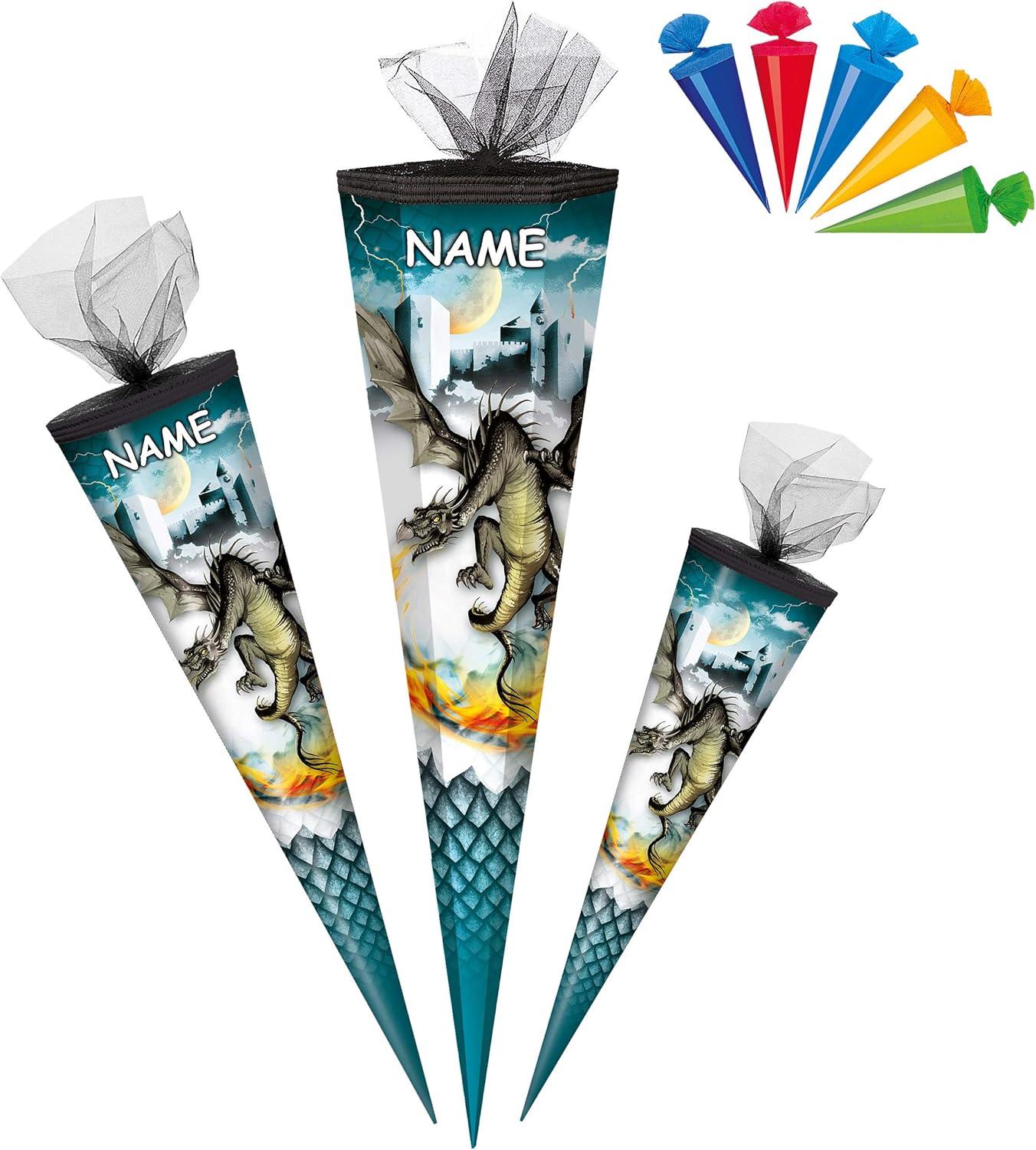 fantastico set _____ con bellissimo effetto 3D - stampa GLITTER e mica!! ____ stabile e di alta qualità - cono per la scuola ___ 50 cm di lunghezza (misurato solo il cartone) ___ forma: ROTONDO ____ il bordo superiore ha un elegante bordo intrecciato e una finitura in tulle ____ motivo: "Drago e castello del cavaliere - Drago di fuoco" + 5 pezzi - coni scolastici extra in un colorato mix di colori da appendere o decorare.... (ciascuno alto 12 cm - misurato solo il cartone) l'OCCHIO: ______ il tuo cono scolastico personalizzato ___ compreso: Individualmente con il vostro NOME DESIDERATO - il nome verrà fatto corrispondere ___ la richiesta del nome verrà effettuata - AUTOMATICAMENTE entro 4 ore - NON inviare un messaggio in anticipo ___ incl. grande effetto 3D _ fiocco in tinta - questo renderà il tuo cono scolastico ancora più bello per attirare l'attenzione ______ la consegna dei bellissimi modelli di fiocchi sarà mista (puoi vedere esempi nelle immagini) made in Germany! __ Materiale: cartone rivestito e di alta qualità - SUPER stabile! - idrorepellente! __ fantastici colori di stampa!_____ OPZIONALE è disponibile una punta in plastica abbinata, trasparente e solida da attaccare (questo rende la punta del cono scolastico molto stabile e stabile) ---- (questo articolo deve essere ordinato EXTRA al cono scolastico) e come extra: IL LOOP individuale con il nome DESIDERATO - aggiungi semplicemente l'articolo "nome desiderato" come extra nel carrello, il nome verrà poi applicato al fiocco