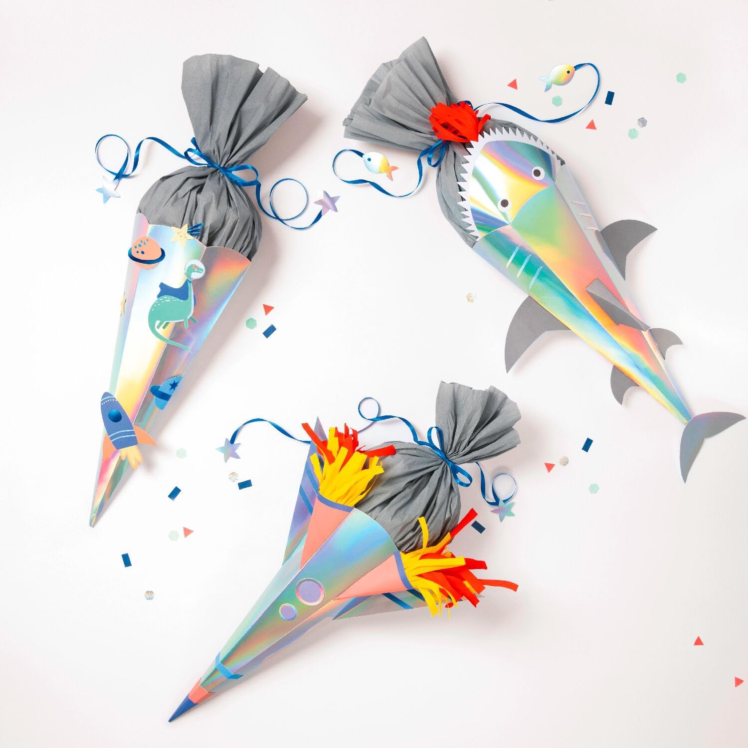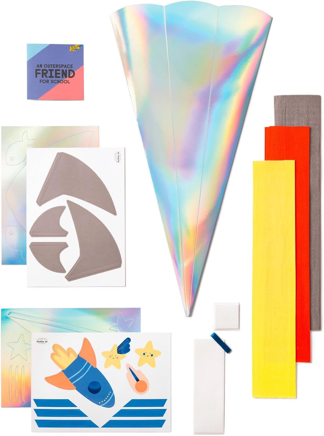1 set, 3 diverse opzioni 68 cm di lunghezza, diametro dell'apertura ca. 20 cm Con semplice chiusura a innesto per l'inserimento Indispensabile per l'inizio della scuola o dell'asilo, studio, vita lavorativa Contenuto: 1 cono scolastico vuoto, 3x carta crespa, 49 parti fustellate, nastro di raso da 60 cm, 100 cuscinetti adesivi 5 x 5 mm, 1 nastro biadesivo, istruzioni