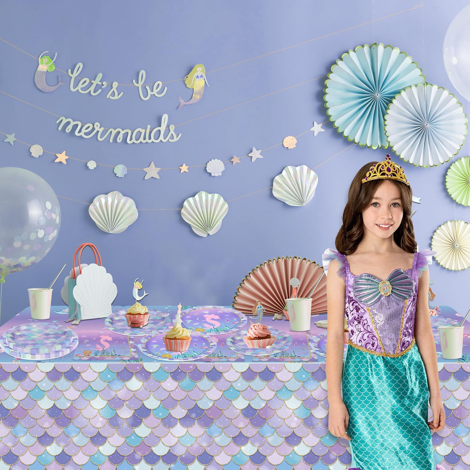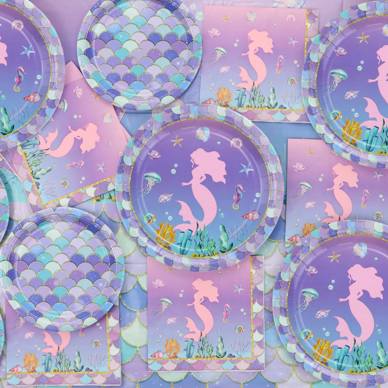 La confezione include: l'arredamento a sirena include 40 piatti piani a sirena, 40 piatti da dessert a sirena, 40 tovaglioli a sirena, 2 tovaglie. Alta qualità: realizzati in carta spessa e leggera, i nostri piatti e tovaglioli a sirena sono sicuri e durevoli. La tovaglia a sirena è realizzata in polietilene impermeabile, resistente e antimacchia. Risparmia tempo: le nostre forniture per feste di compleanno a sirena ti fanno risparmiare tempo di pulizia. Getta via gli avanzi di cibo lungo il set di stoviglie quando hai finito, risparmiando tempo ed energia per goderti la festa di compleanno! Design squisito: i nostri set di stoviglie oceaniche sottomarine sono squisitamente progettati con molte creature subacquee, sirenette e motivi a squame di pesce. Il design colorato e accattivante migliorerà l'atmosfera della festa e delizierà i piccoli ospiti. Decorazione versatile: adatto per una vasta gamma di eventi, tra cui feste di compleanno a tema sirena, baby shower sotto il mare, feste principesse, decorazioni per la casa costiera, feste di compleanno sottomarine, feste estive, riunioni di famiglia, feste barbecue e molto altro ancora.