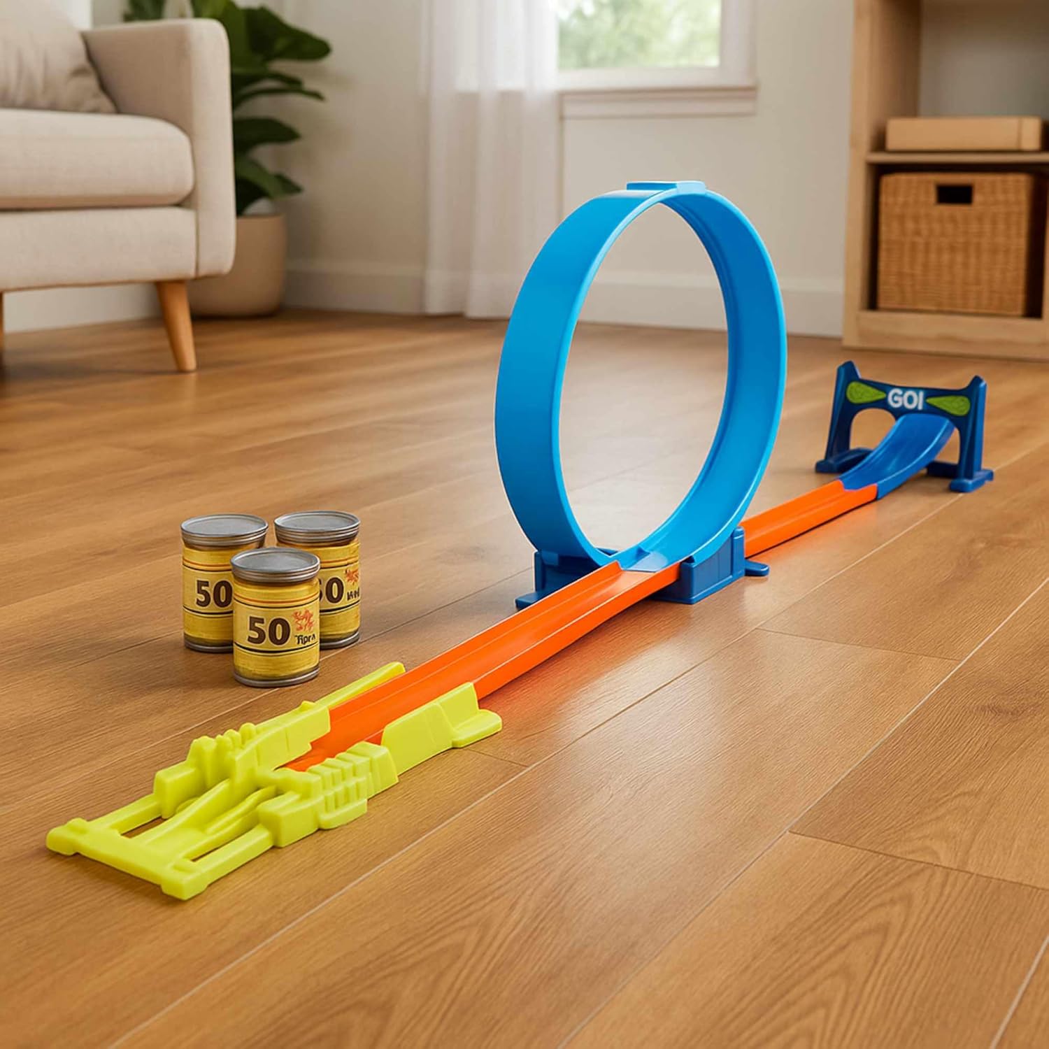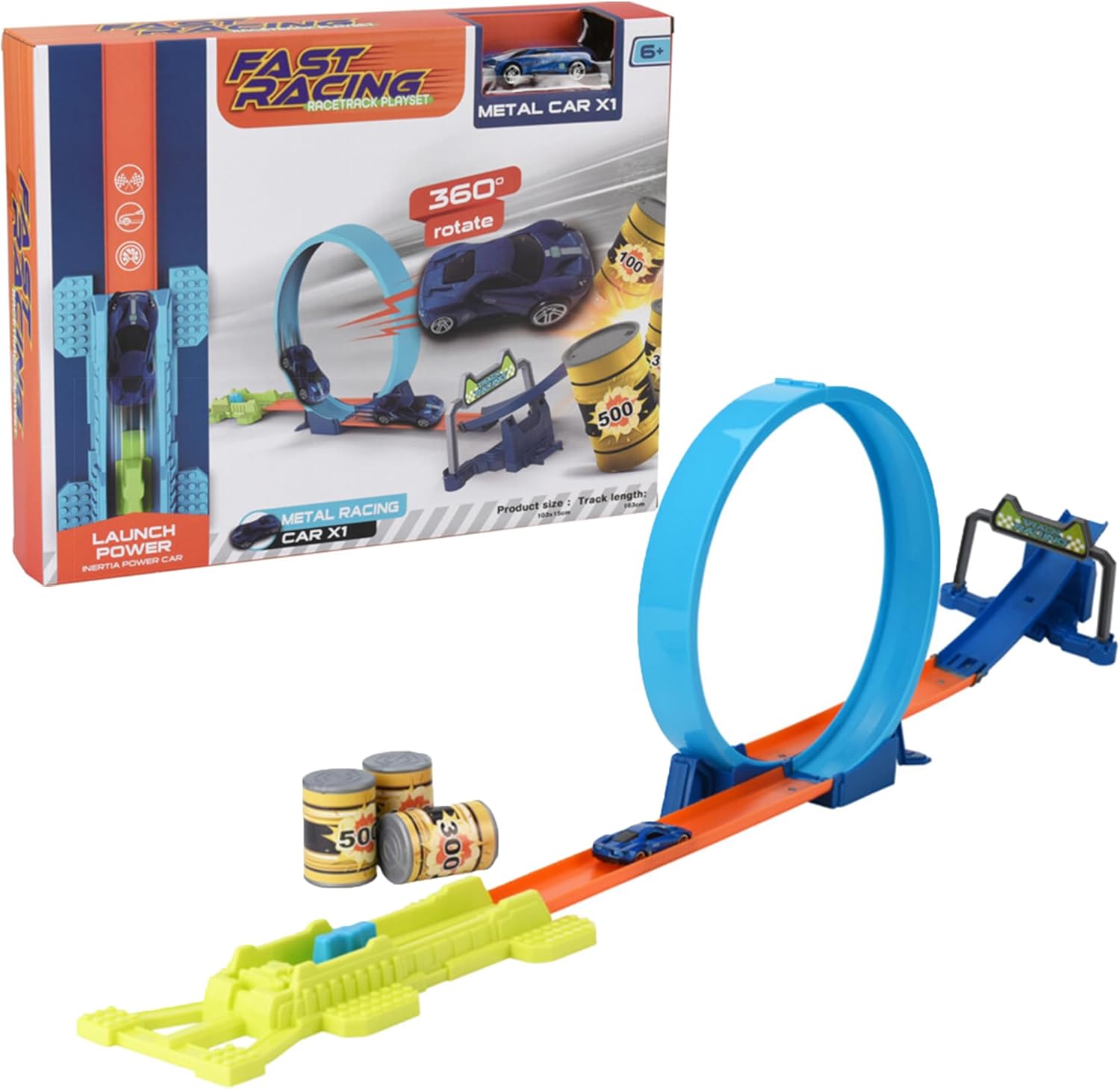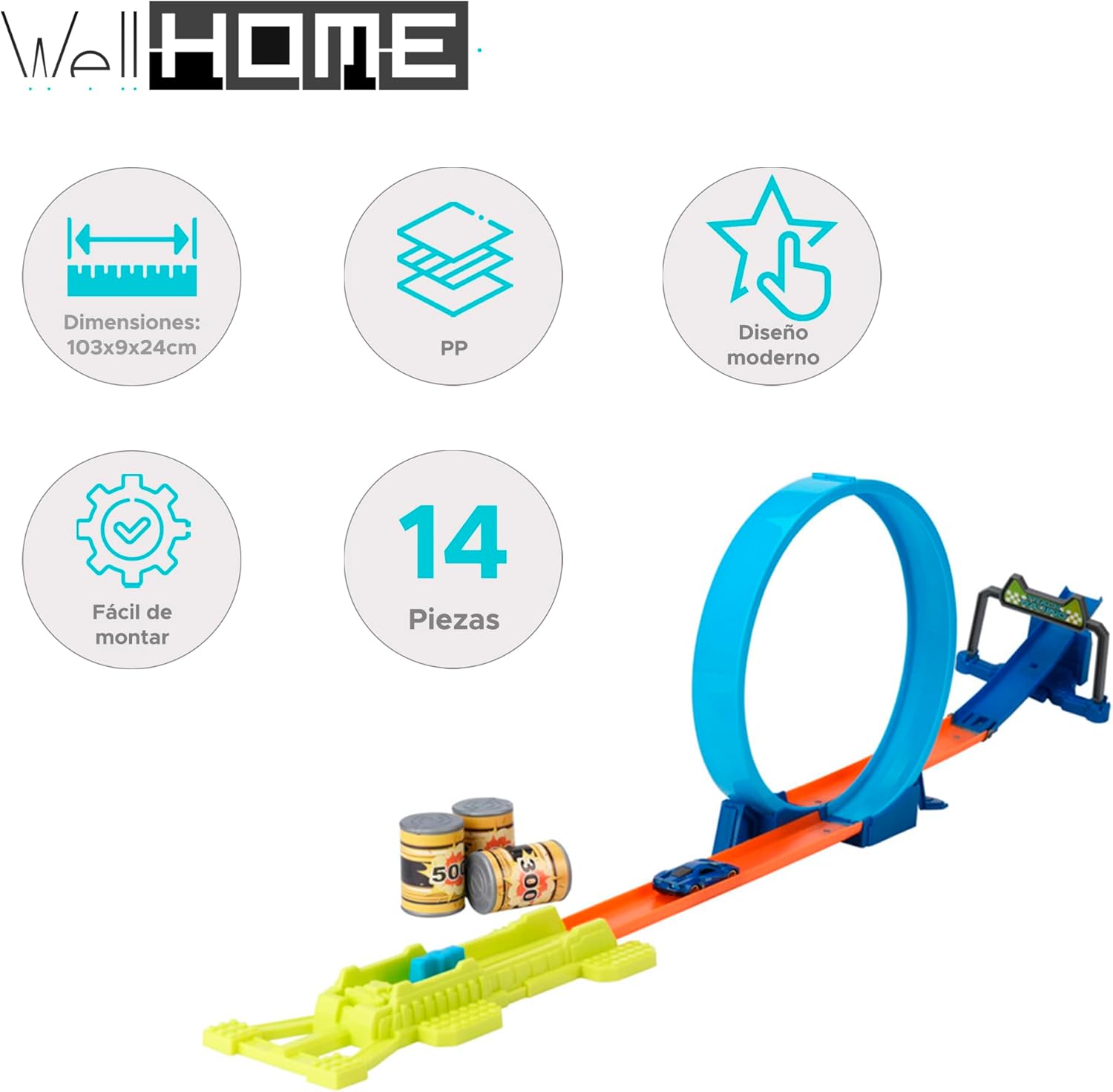 Set di 14 auto da corsa in materiale PP con 3 diversi design. Include una macchina blu, un'auto bianca, un'auto nera e una carta bianca. La dimensione assemblata varia tra 94x24cm e 103x15cm con lunghezze della pista che vanno da 63cm a 97cm. Ogni auto ha una dimensione di 7,7 x 3,2 x 2 cm e pesa 250 grammi. Viene fornito con una distribuzione dei colori: 5 in bianco, blu e nero e 6 in arancione.