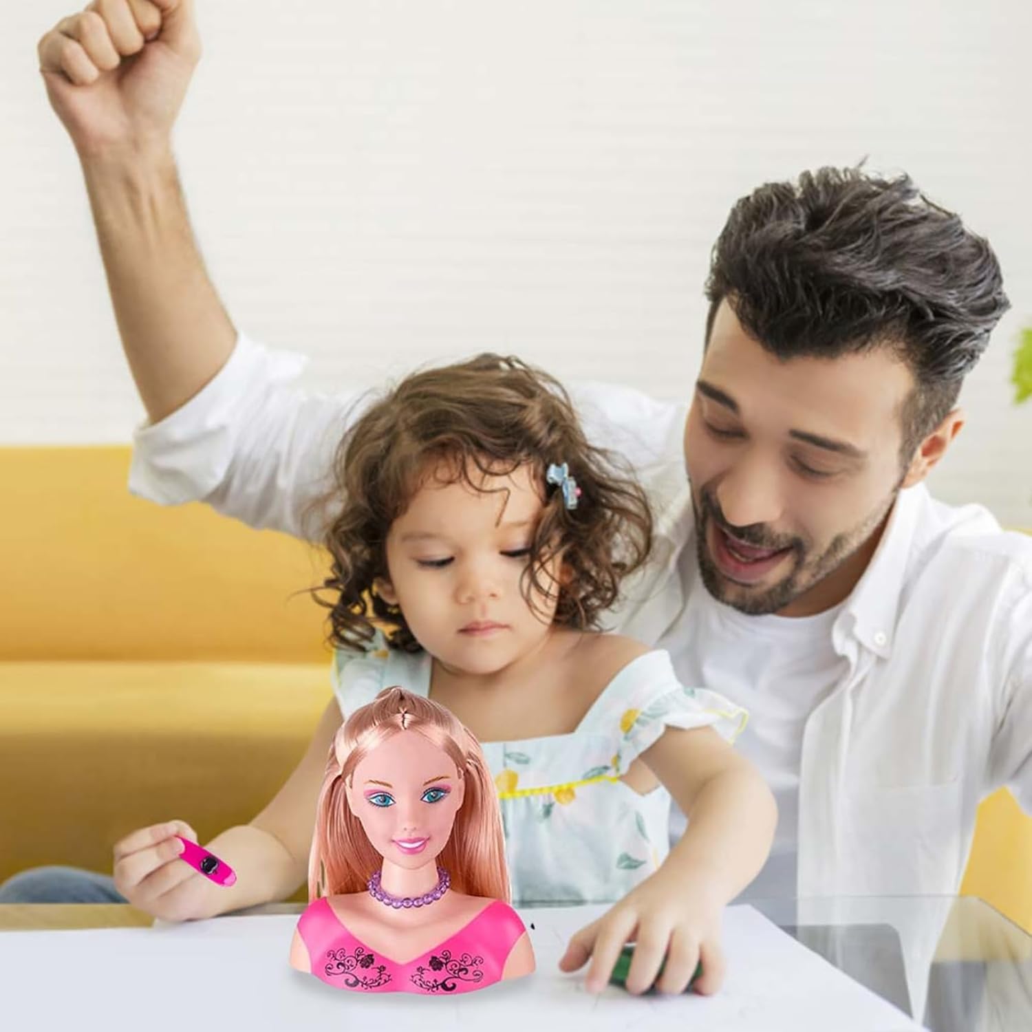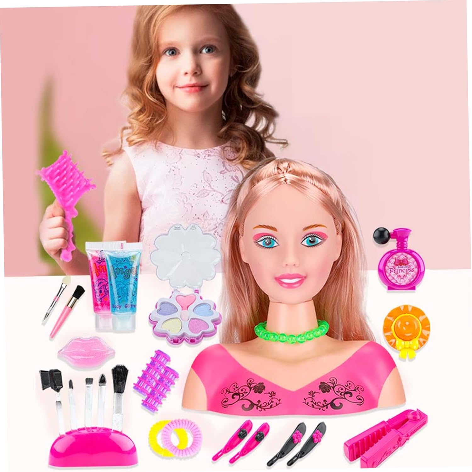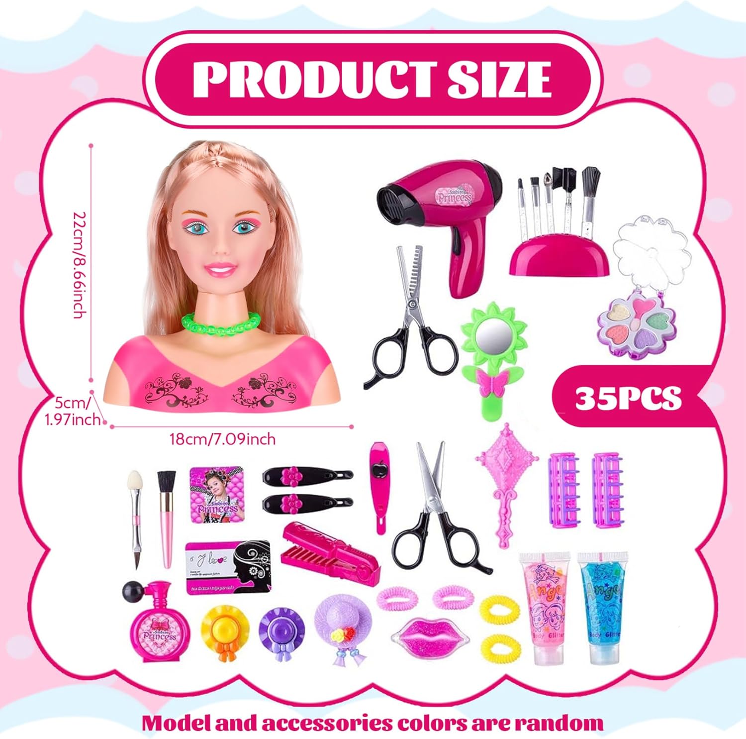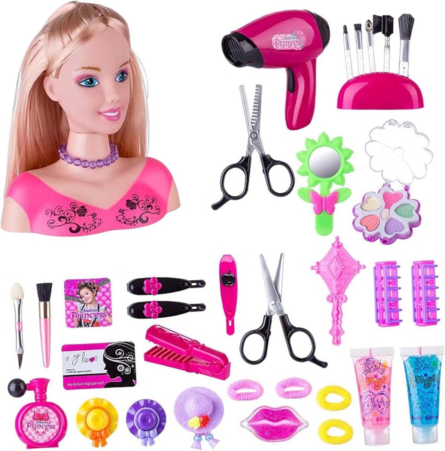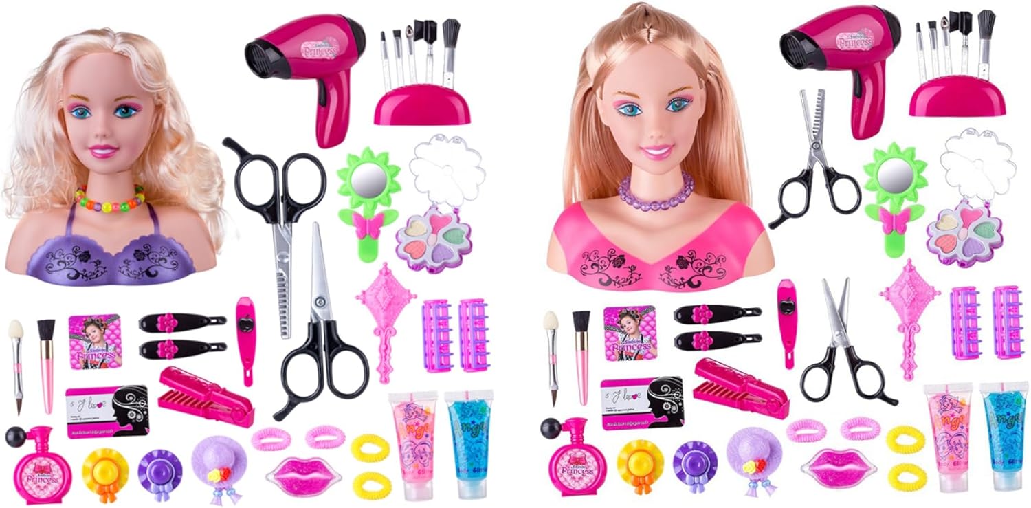 Regalo ideale per le ragazze: progettato per i bambini, questo set di giocattoli per il trucco è un regalo eccellente per compleanni, Natale o Ringraziamento..Sparca gioia e creatività nelle ragazze, permettendo loro di indulgere nella loro passione per la bellezza e lo stile. Set di styling completo incluso: Il set include tutto ciò che il bambino ha bisogno per creare acconciature meravigliose, con una bambola con capelli morbidi, un pettine, un asciugacapelli, specchi, pennelli per il trucco, rossetto e altro ancora!.Con una varietà di accessori con cui sperimentare, i bambini possono davvero scatenare il loro potenziale di stile. Divertimento per l'acconciatura interattiva: questa testa di bambola per il set di acconciature è dotata di capelli morbidi e gestibili che consentono ai bambini di esplorare la loro creatività progettando acconciature uniche..L'asciugatrice realistica aggiunge un ulteriore strato di divertimento, simulando un'esperienza di salone reale se alimentata da 2 batterie triple-A (non incluse). Dimensioni perfette per i più piccoli: misura di 8,6 pollici di altezza e 7 pollici di larghezza, questa testa di bambola compatta è delle dimensioni giuste per i bambini..Facile da gestire e giocare, è progettato per le mani piccole, rendendo un'ottima scelta per i più piccoli per godersi ore di divertimento in stile. Painò educativo completo: con 35 accessori colorati inclusi, questo set di giocattoli per le bambole non solo intrattiene, ma promuove anche il gioco educativo..Incoraggia il pensiero fantasioso e la creatività, migliorando al contempo il coordinamento degli occhi per bambini mentre modellano e accessori.