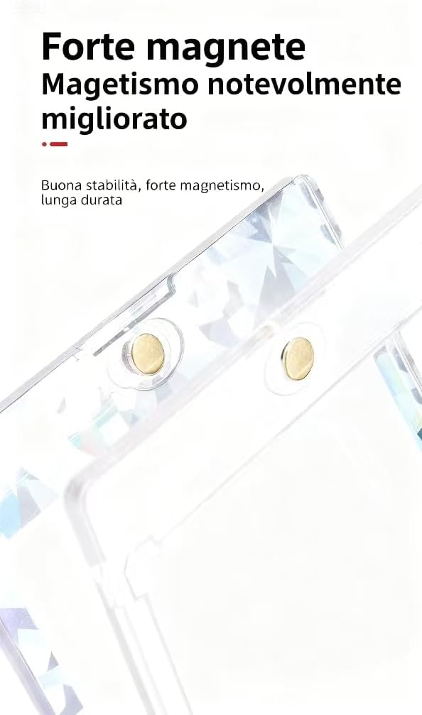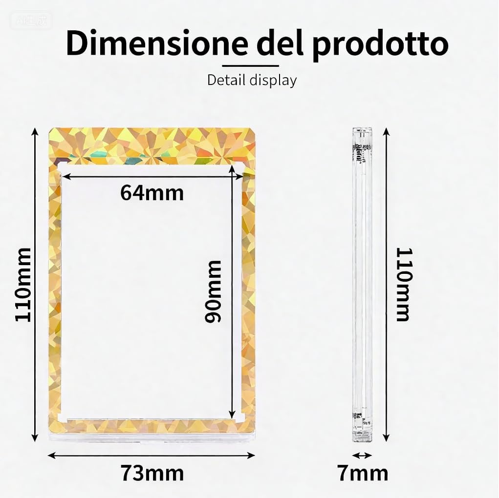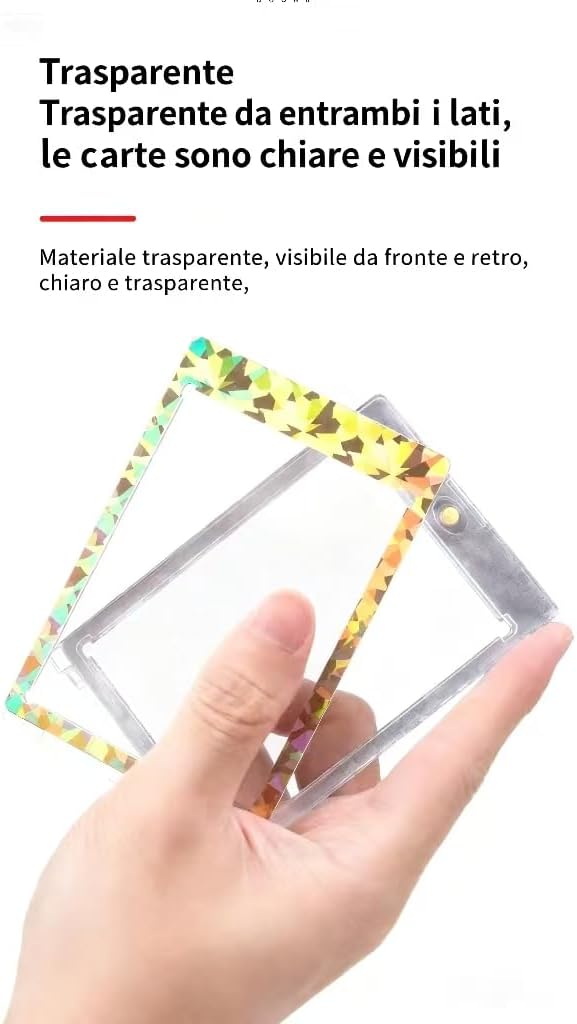 Protezione Completa delle Carte Mantieni le tue carte da gioco e da collezione al sicuro da graffi, polvere e piegature con custodie rigide, morbide e magnetiche Materiali di Alta Qualità Realizzati in plastica trasparente, PVC privo di acidi e pelle PU resistente all’acqua per garantire una protezione duratura Compatibilità Universale Adatti per carte Pokemon, Magic The Gathering, YuGiOh, Vanguard, sport e altre carte da collezione standard Colleziona ed espone le tue carte Disponibili holder magnetici da 35PT con supporto, ideali per soddisfare con flessibilità diverse esigenze di collezione ed esposizione Facili da Usare & Collezionare Design trasparente e pratico per una rapida identificazione delle carte. Ideale per collezionisti, tornei e viaggi