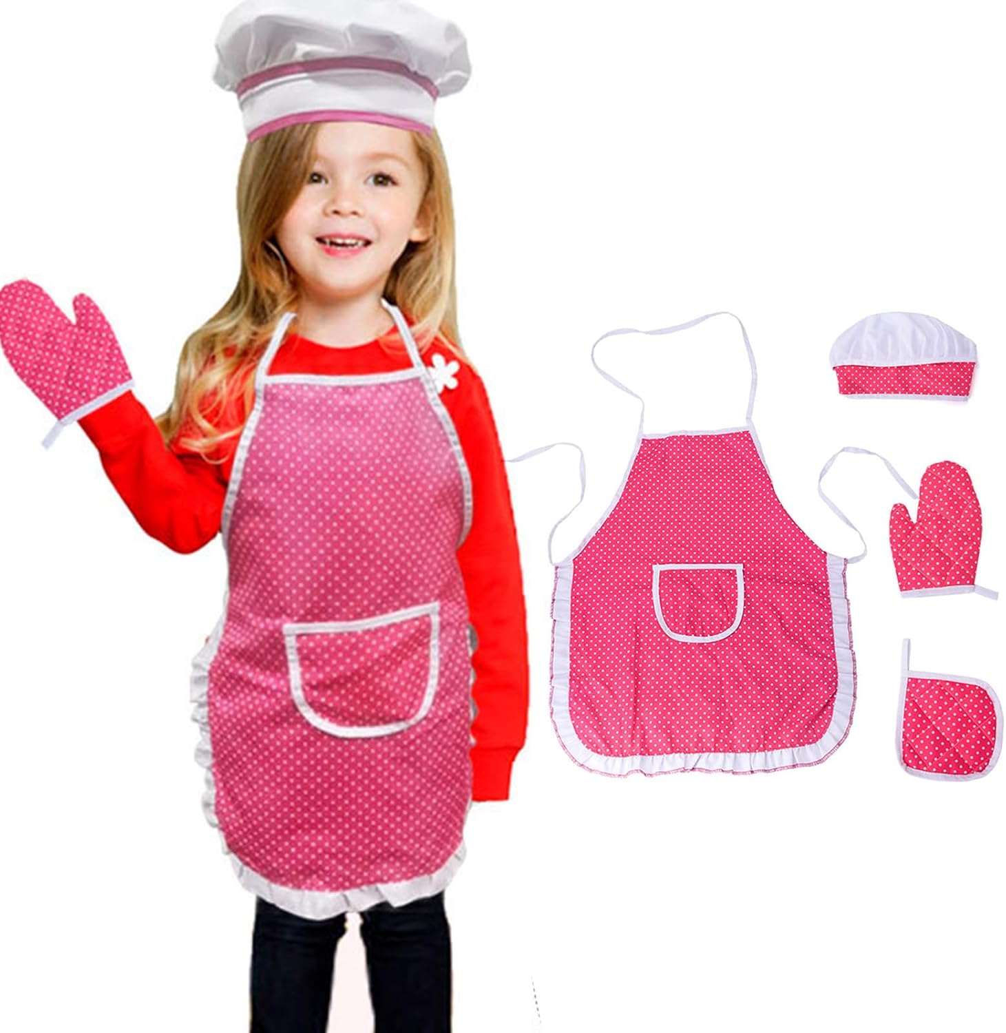 Set da cucina e cottura per bambini, per bambini, cuochi, giochi di ruolo, include grembiule da torta, cappello da chef, guanto da cucina per ragazzi e ragazze Caratteristiche: Materiali atossici. Realizzati con materiali privi di bordi rigidi, sicuri per i bambini. Si consiglia il lavaggio a mano e il lavaggio delicato in lavatrice. Il kit da cucina per bambini include grembiule con cinghie regolabili, cappello da chef, tappetino caldo, guanto da forno soddisfa la maggior parte delle esigenze. Grembiule per bambini con cinghie regolabili, adatto per la maggior parte delle circonferenze della vita. Cappello da chef con fascia elastica per i guanti da forno sono riempiti di cotone per scottare. Giochi di ruolo. Questo costume da forno offre ai bambini la possibilità di giocare come chef, per imparare come funzionano gli chef. insegnare ai bambini cibo e cucinare e stimolare il loro interesse per la cucina. Regalo di festa. Gioco di ruolo del gioco preferito dei bambini. Il bambino adorerà questo costume da chef e felice di giocarci! Specifiche tecniche: Materiale: poliestere misto cotone. La confezione include: Set Chef per bambini Nota: Considerare un margine di errore di 1-2 cm dovuto alla misurazione manuale. A causa delle differenze tra i diversi monitor, l'immagine potrebbe non rispecchiare il colore reale dell'articolo.