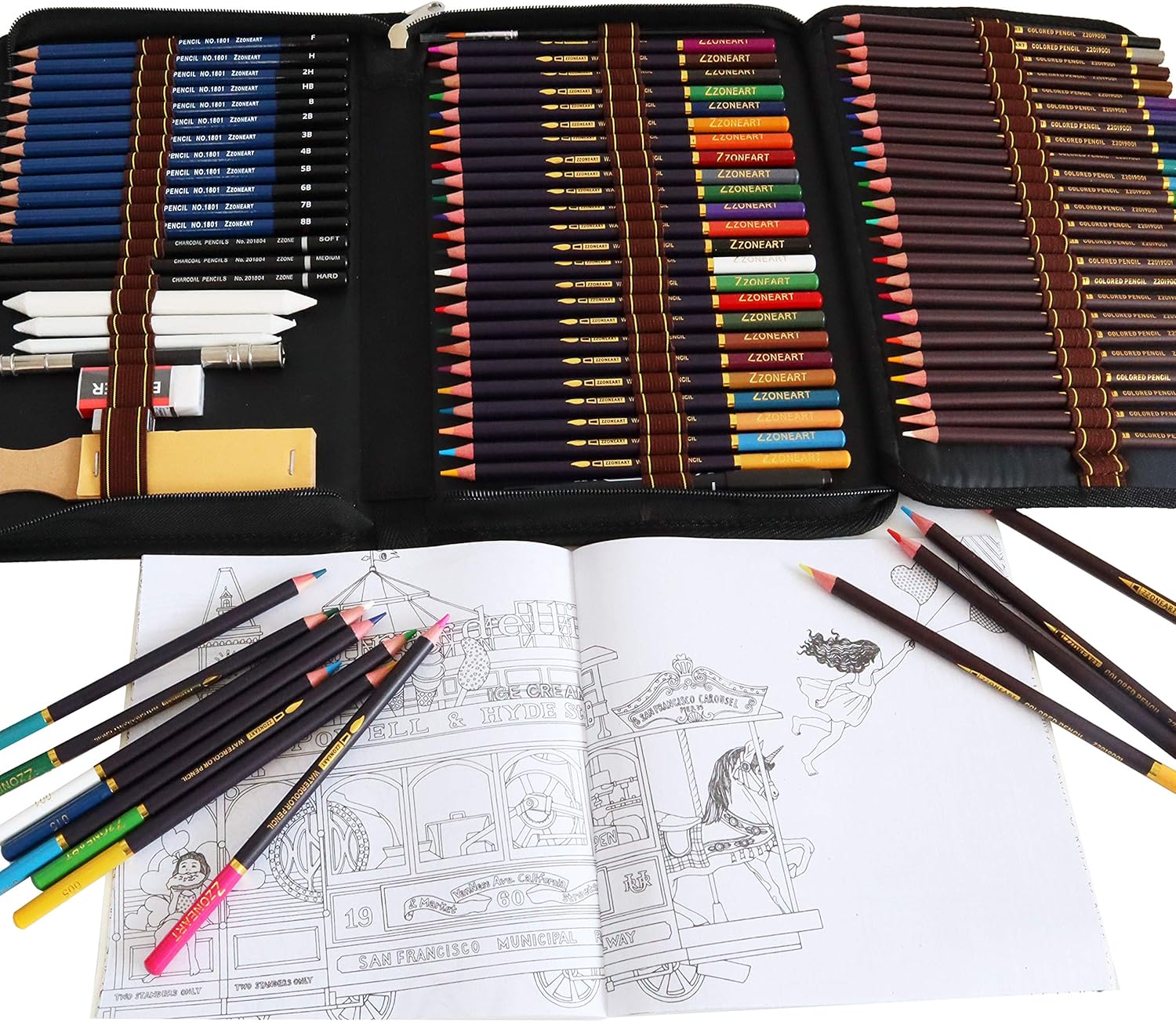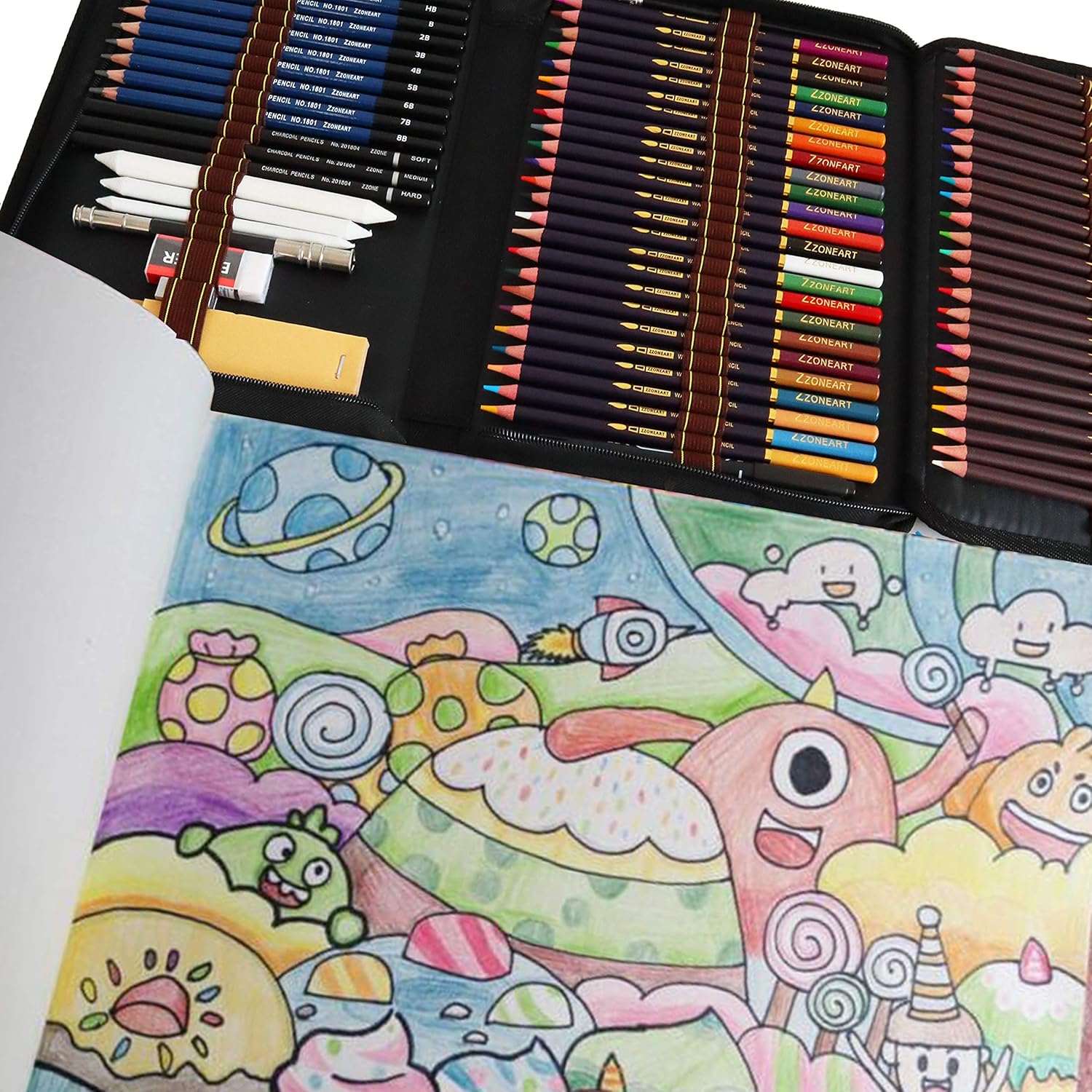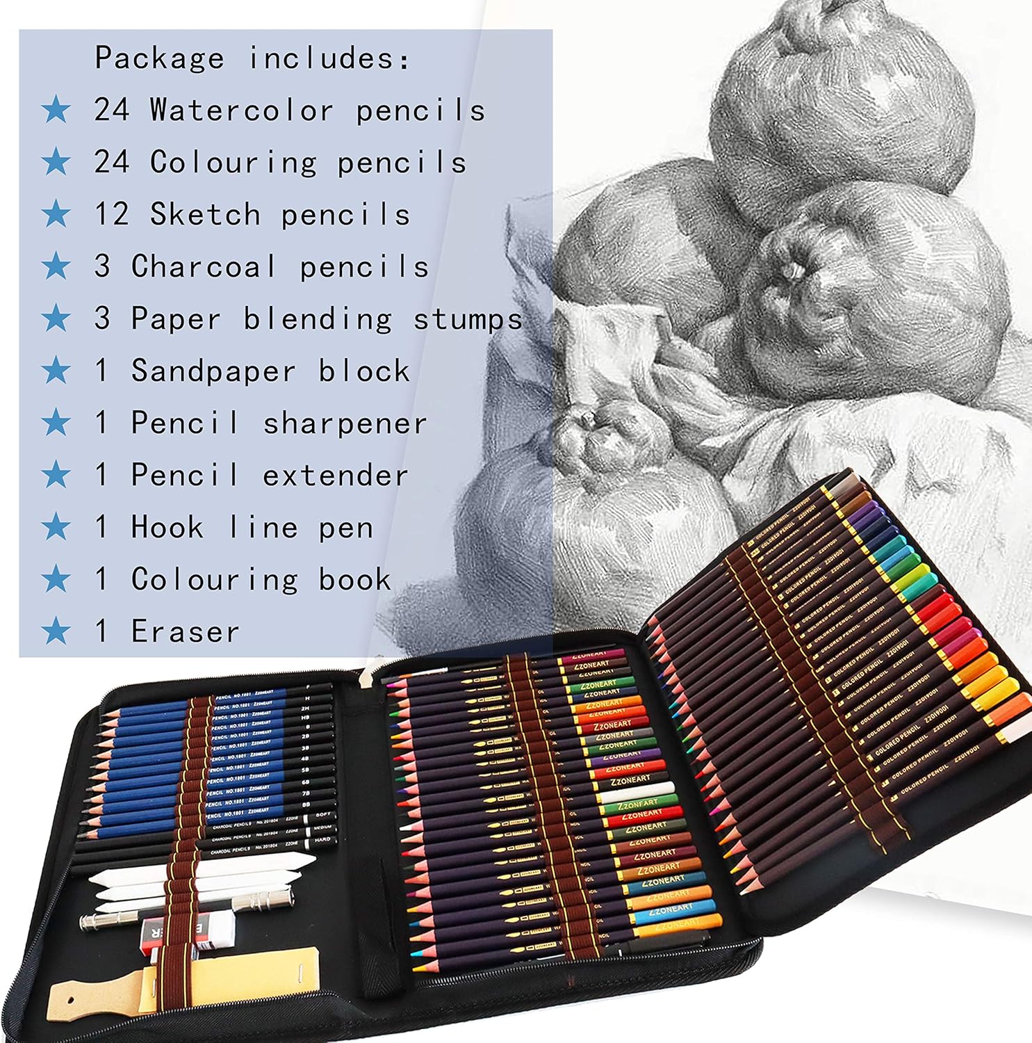 1. Set per artisti professionisti: 72 strumenti di disegno tutto in uno, tra cui 24 matite acquerellabili, 24 matite colorate, 12 matite per schizzi, 3 matite a carboncino, 3 monconi per sfumare la carta, 1 tampone di carta vetrata, 1 temperamatite, 1 gomma, 1 estensore per matita, 1 penna a gancio, 1 libro da colorare. 2. Incredibilmente versatile - Set di matite versatile - Un set artistico davvero versatile progettato per scrivere, disegnare, colorare e fare schizzi per la scuola, l'aula e l'uso quotidiano. 3. Sicuro e non tossico: matite in legno originali. Realizzato in materiale ecologico, innocuo per la salute. Matite colorate con colori ricchi e chiari, scrittura fluida con ispirazione, colore uniforme, non facile da sbiadire e bastoncini di alta qualità per artisti di tutti i livelli. 4. Astuccio per matite adatto ai viaggi - Viene fornito con un astuccio portatile con cerniera con slot individuali adatti per organizzare bene ogni matita e tutti gli altri accessori, proteggere bene le mine da eventuali danni. 5. Regalo perfetto: meravigliosi riempitivi per calze di Natale, regalo di compleanno o di Capodanno per artisti professionisti e dilettanti, bambini, studenti, amici o familiari interessati a progettare, disegnare, disegnare, colorare e dipingere.