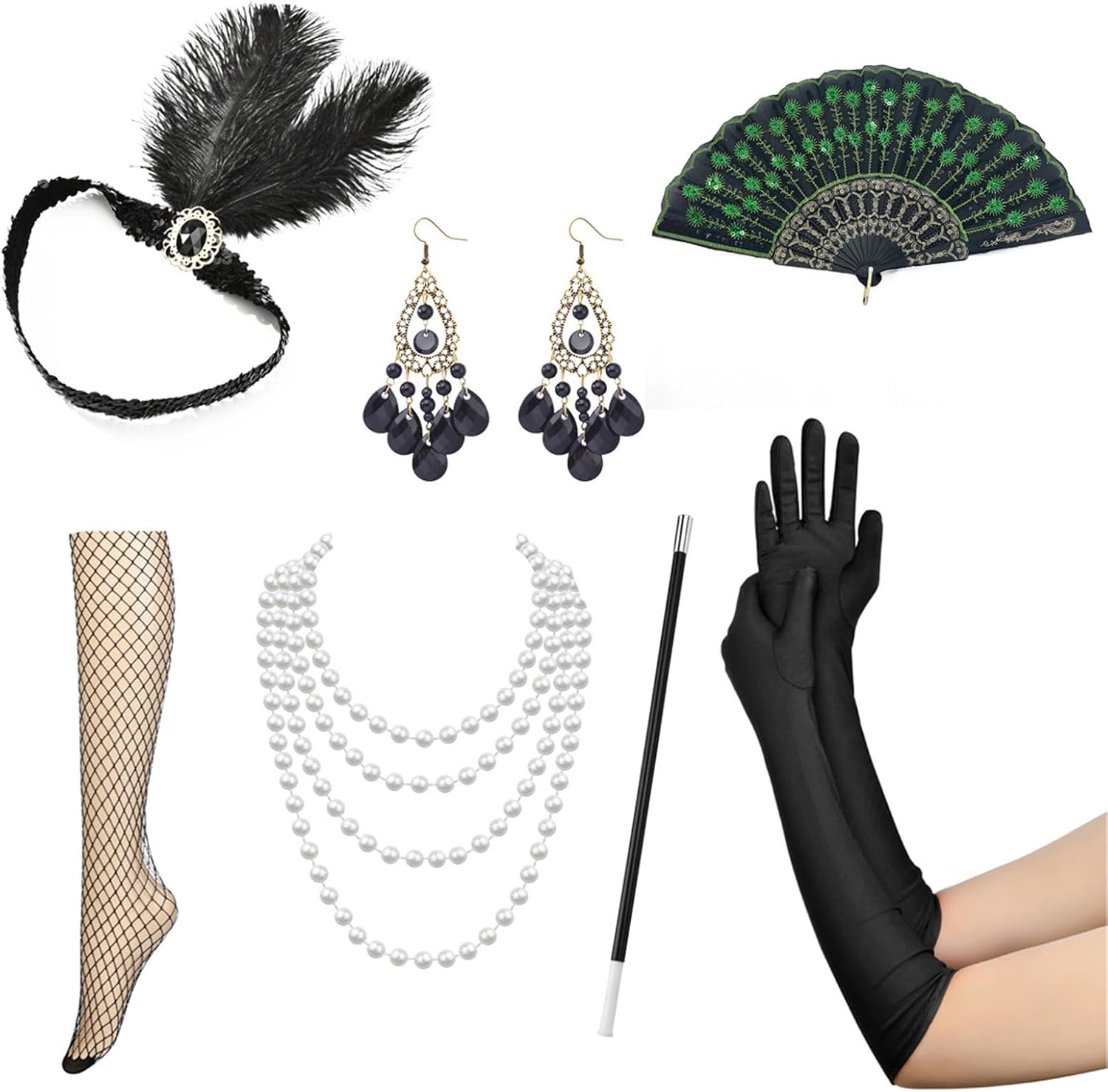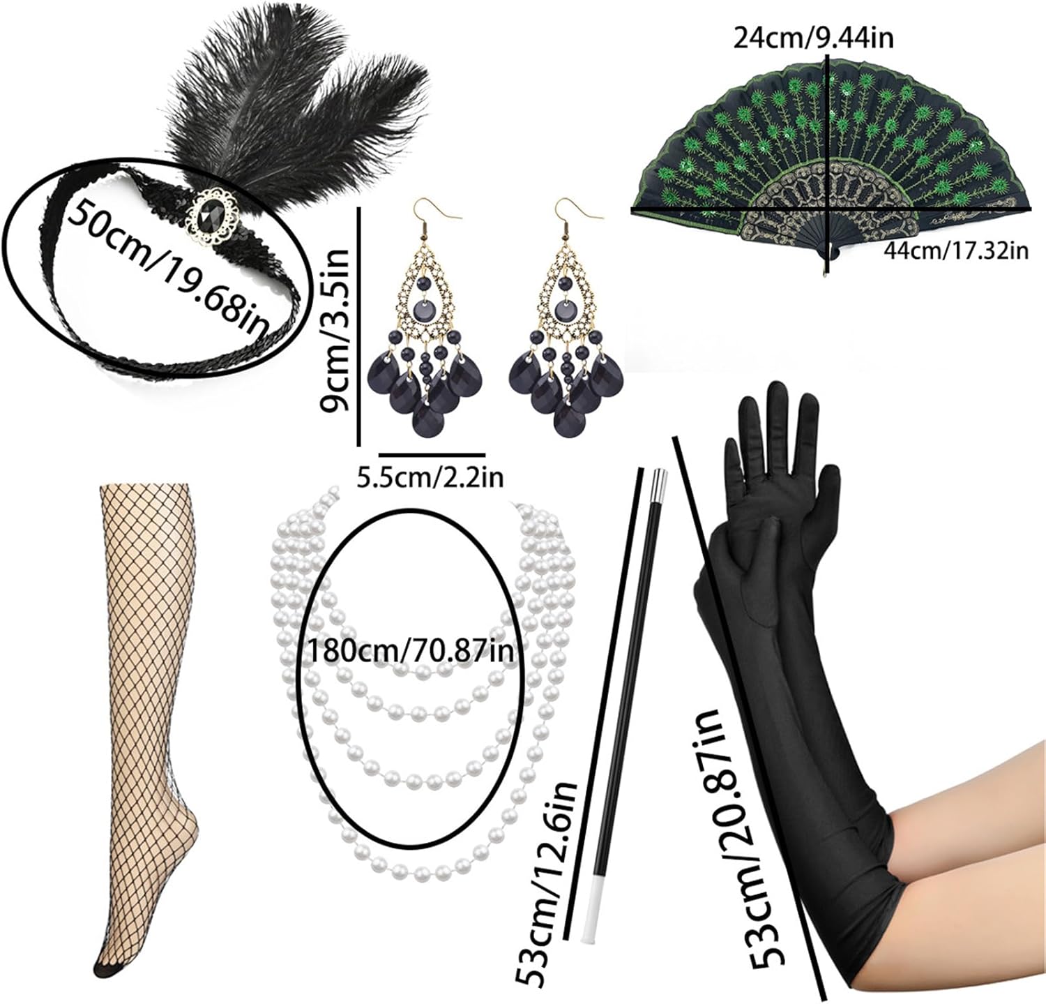 Set di accessori per costume vintage anni '20, con fascia in raso, guanti, collana di perle, porta sigarette nero Caratteristiche: Distinguiti al tuo prossimo con il nostro Vintage Dress Up 1920s Costume Donna Risvolto Accessori Per gli appassionati di GreatGatsby, questo set di accessori include una fascia con piume ed eleganti guanti lunghi in raso. Realizzato con materiali, il design senza tempo di questo copricapo anni '20 / '30 aggiunge un tocco di eleganza a qualsiasi flapperensemble. Questo set di accessori è adatto per adolescenti e adulti che amano partecipare a feste a tema o eventi cosplay. Il nostro Vintage Dress Up 1920s Costume Donna Risvolto Accessori sono per varie occasioni, tra cui eventi, feste di Halloween, balli e spettacoli teatrali. Aggiungi un tocco di glamour e classe ai tuoi outfit con questi accessori di ispirazione retrò. Specifiche tecniche: :Misto Dimensioni della fascia: circa 56-60 cm. Quantità: 1 set (fascia, guanti in raso, collana di perle finte, porta sigarette, orecchini, calze, ventaglio). La confezione include: 1 set di accessori retrò anni '20. Nota: A causa dei problemi di effetti di luce e angolazioni, ci saranno alcune tolleranze nel prodotto, si prega di capire. Si prega di considerare un margine di errore di 0-1 cm a causa della misurazione manuale