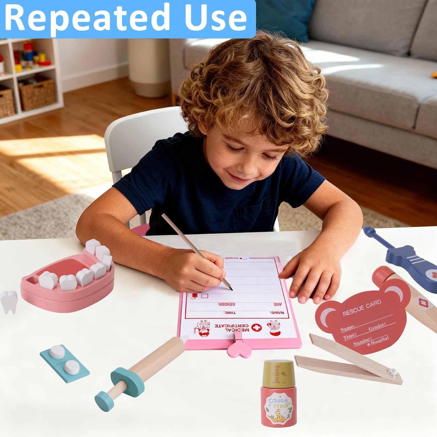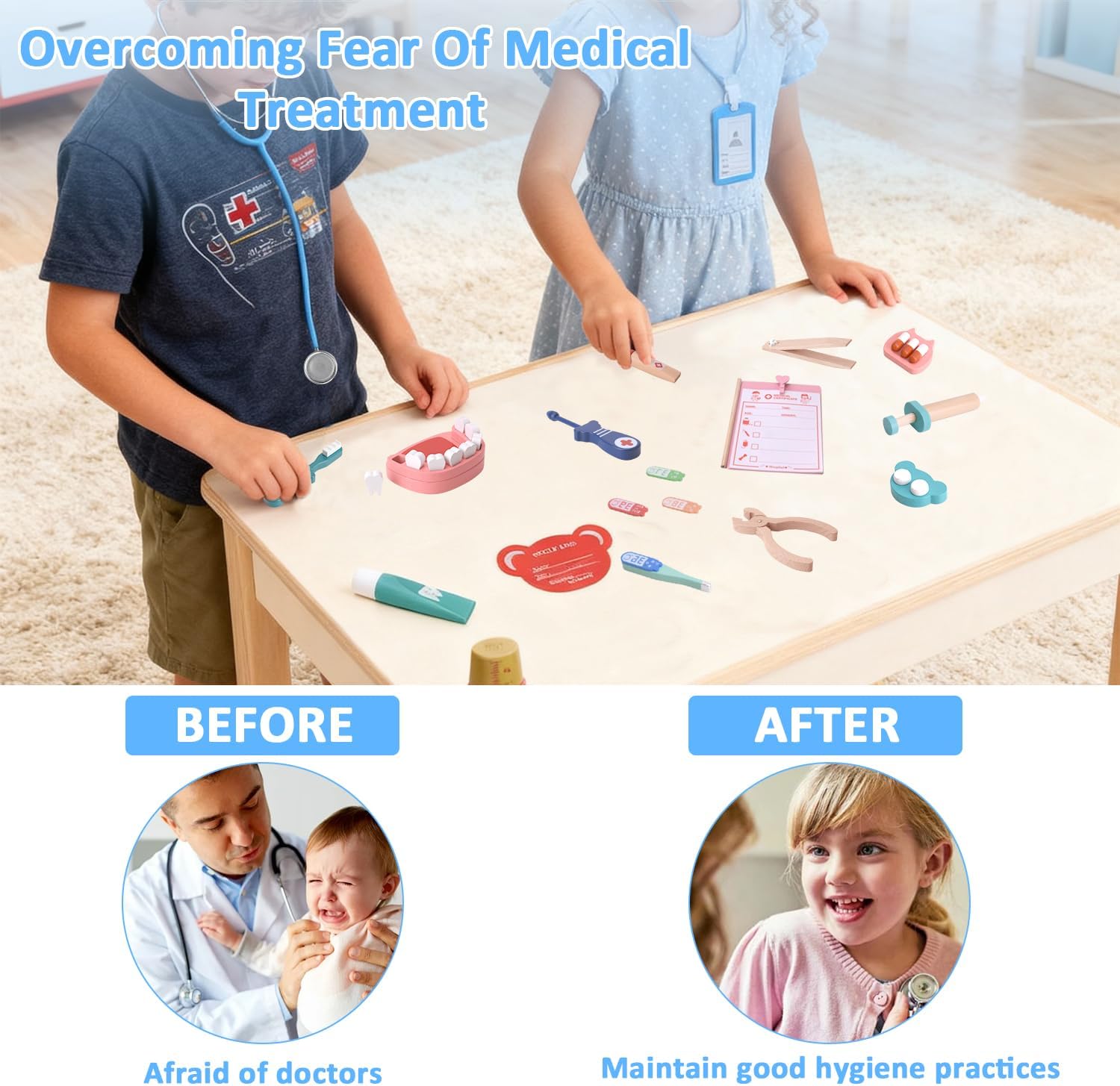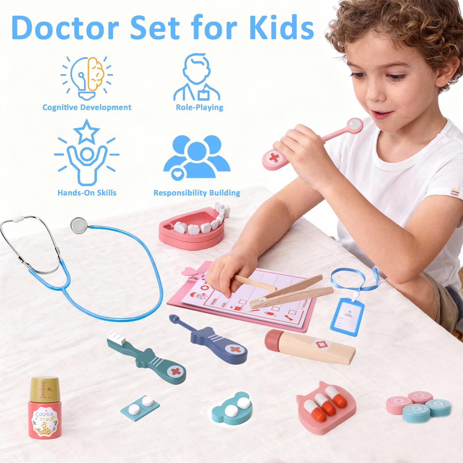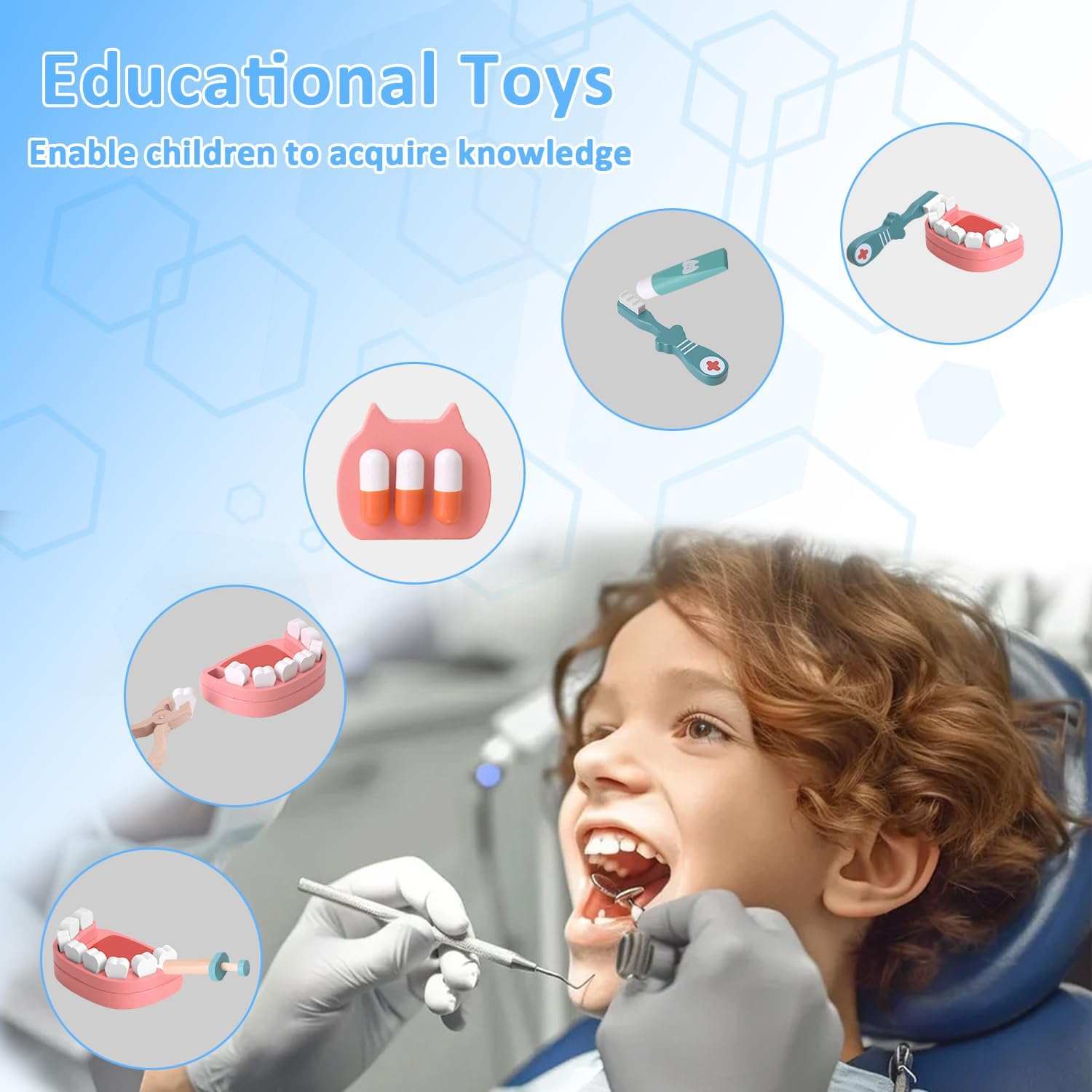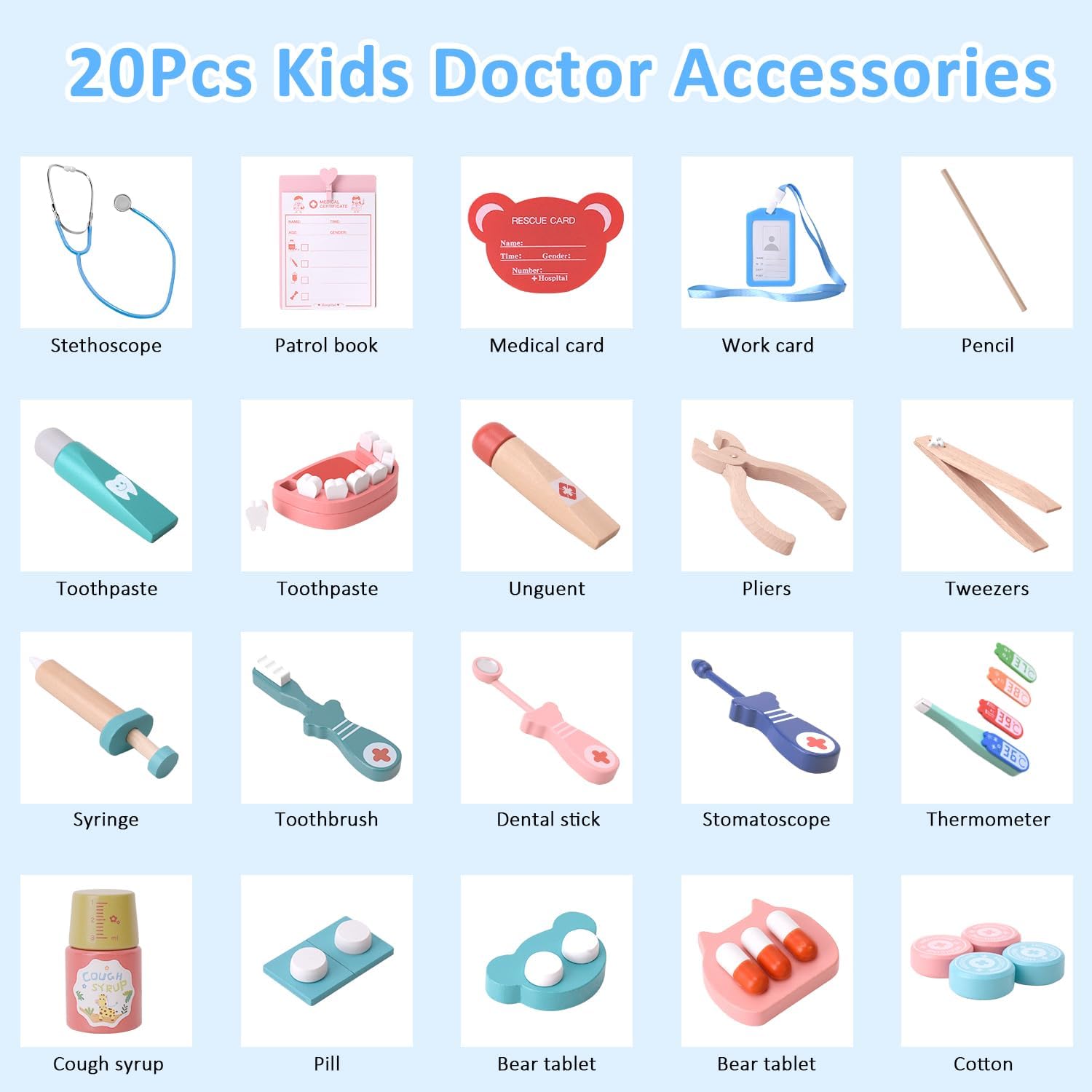 [Set da gioco da dentista in legno da 20 pezzi]: questo set di giocattoli dentistici contiene 20 pezzi realistici in legno come uno specchio dentale, una pinza, uno spazzolino da denti, un dentifricio, un modello dentale e molto altro ancora. Perfetto per i bambini per scoprire le cure dentistiche attraverso un gioco di ruolo fantasioso. [Design sicuro e durevole in legno]: questo kit dentista per bambini è realizzato in legno non tossico di alta qualità con bordi lisci e arrotondati, durevole e garantisce un gioco sicuro. Non contiene piccole parti taglienti o rimovibili ed è quindi ideale per bambini dai 3 anni in su. [Gioco di ruolo educativo]: incoraggia l'apprendimento attraverso il divertimentQuesto kit dentista aiuta i bambini a superare la paura delle visite dentistiche sviluppando le loro capacità motorie, creatività e fiducia sociale. Un ottimo strumento per trasmettere l'importanza dell'igiene orale. [Strumenti dentali realistici per giochi di ruolo]: gli strumenti realistici e realistici e i denti rimovibili suscitano la curiosità e rendono i giochi di ruolo più emozionanti per visitare il dentista. Ideale per giochi individuali o di gruppo, promuove l'apprendimento cooperativo e la comunicazione. [Il regalo perfetto per ragazzi e ragazze]: un regalo premuroso per compleanni, Natale o altre occasioni speciali. Senza accessori ingombranti come costumi o valigie, è compatto, facile da riporre e pronto per ore di gioco creativo in casa.