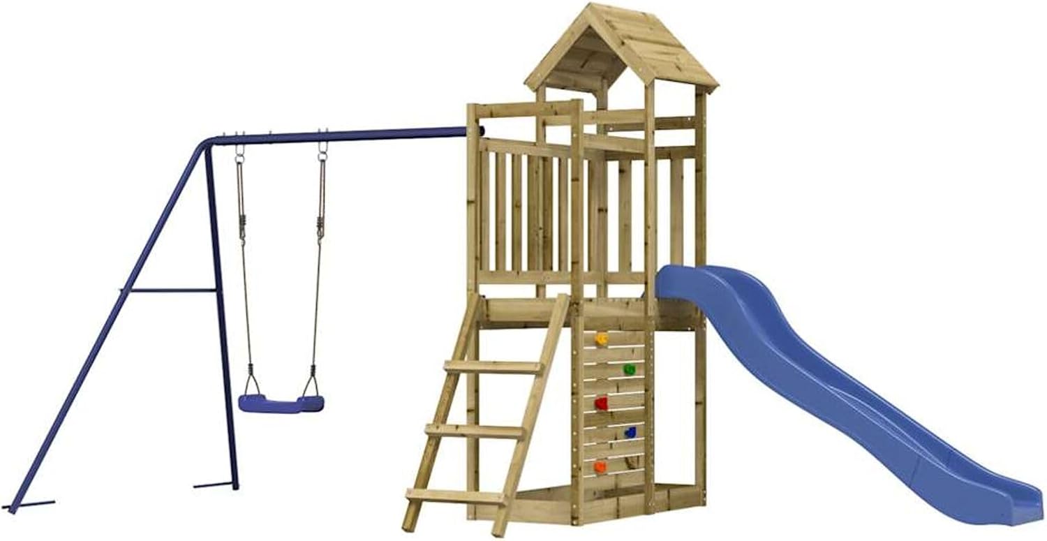 Questo set da gioco per esterni in legno trasforma il vostro cortile in un parco giochi per avventure fantasiose. Materiale resistente: questo parco giochi con scivolo è realizzato in legno di pino impregnato sottovuoto. Il legno massello di pino è un bellissimo materiale naturale. Il legno di pino ha le venature dritte e i nodi conferiscono al materiale il suo caratteristico aspetto rustico. L'impregnazione è un processo di conservazione eseguito utilizzando le autoclavi.