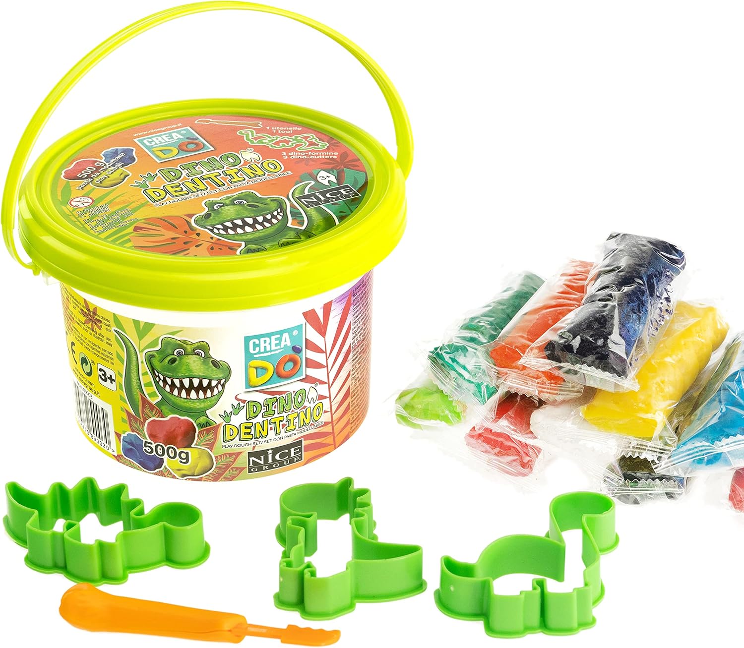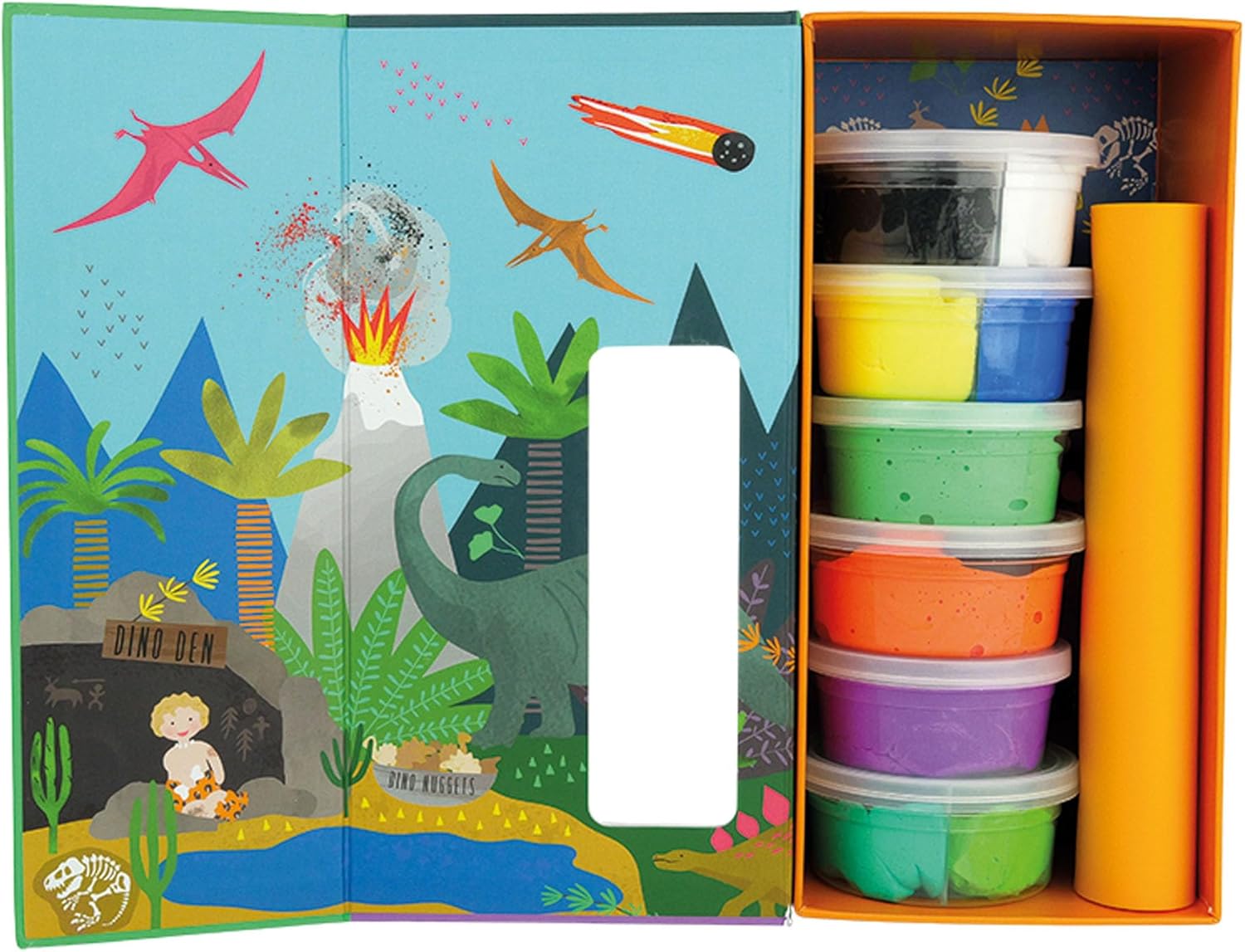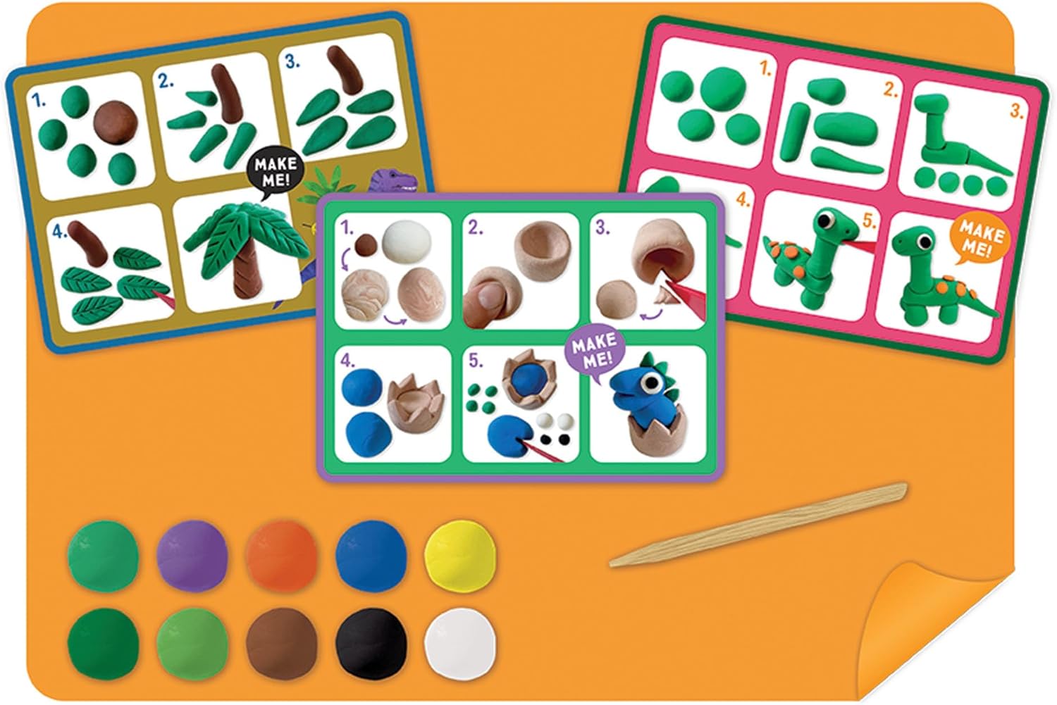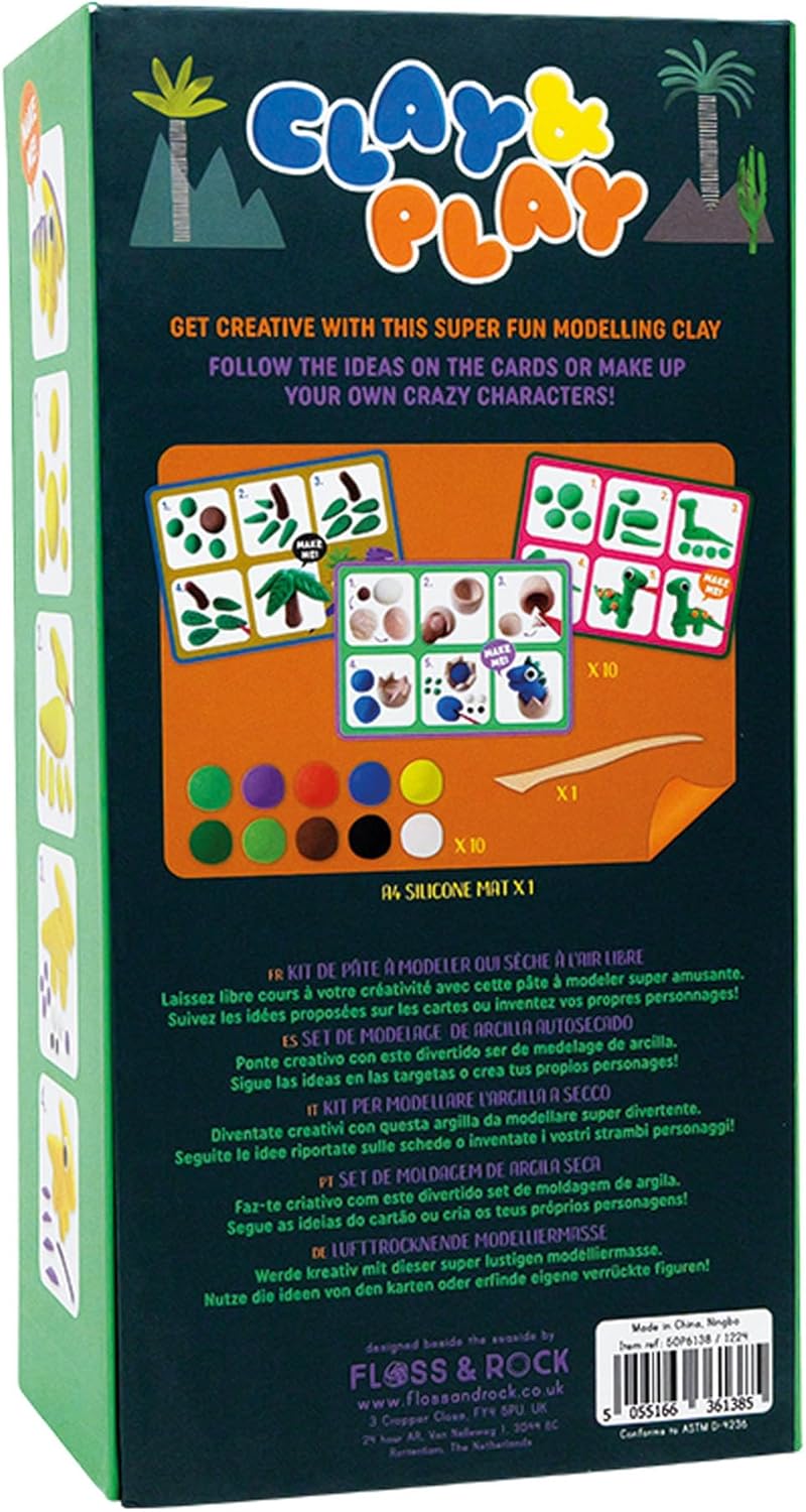 Crea 10 figure di dinosauri ruggenti in argilla Include 6 vasetti di 10 colori vivaci di argilla essiccata all'aria Guida passo passo con 5 schede di istruzioni fronte-retro Viene fornito con un tappetino in silicone e uno stilo in legno Imballaggio ecologico, senza BPA e riutilizzabile