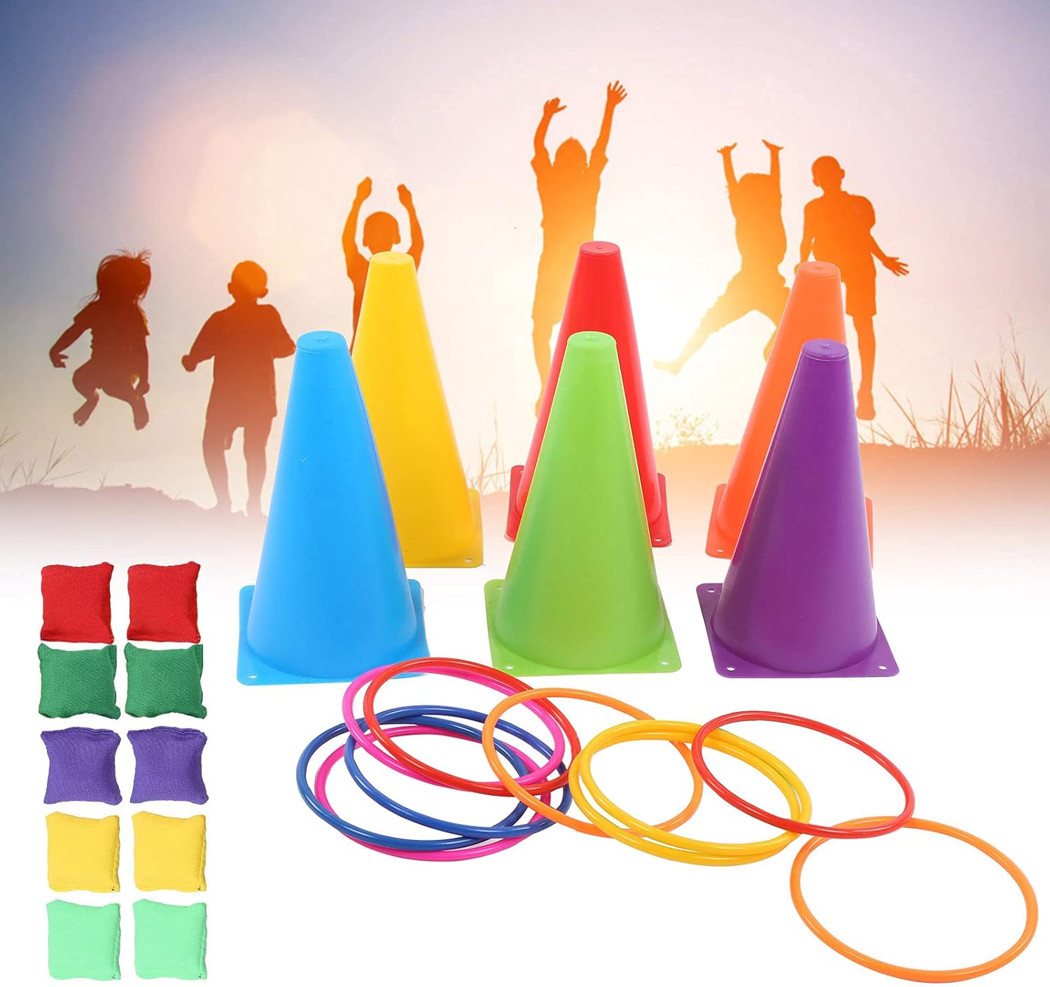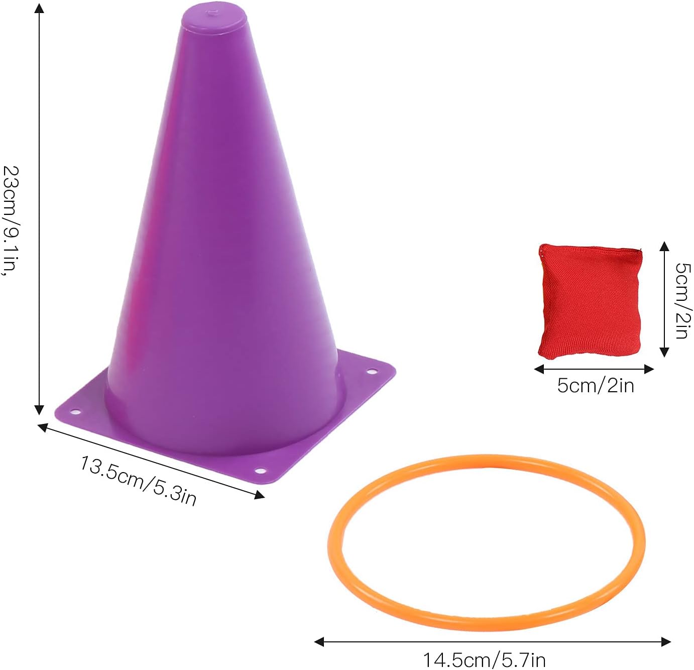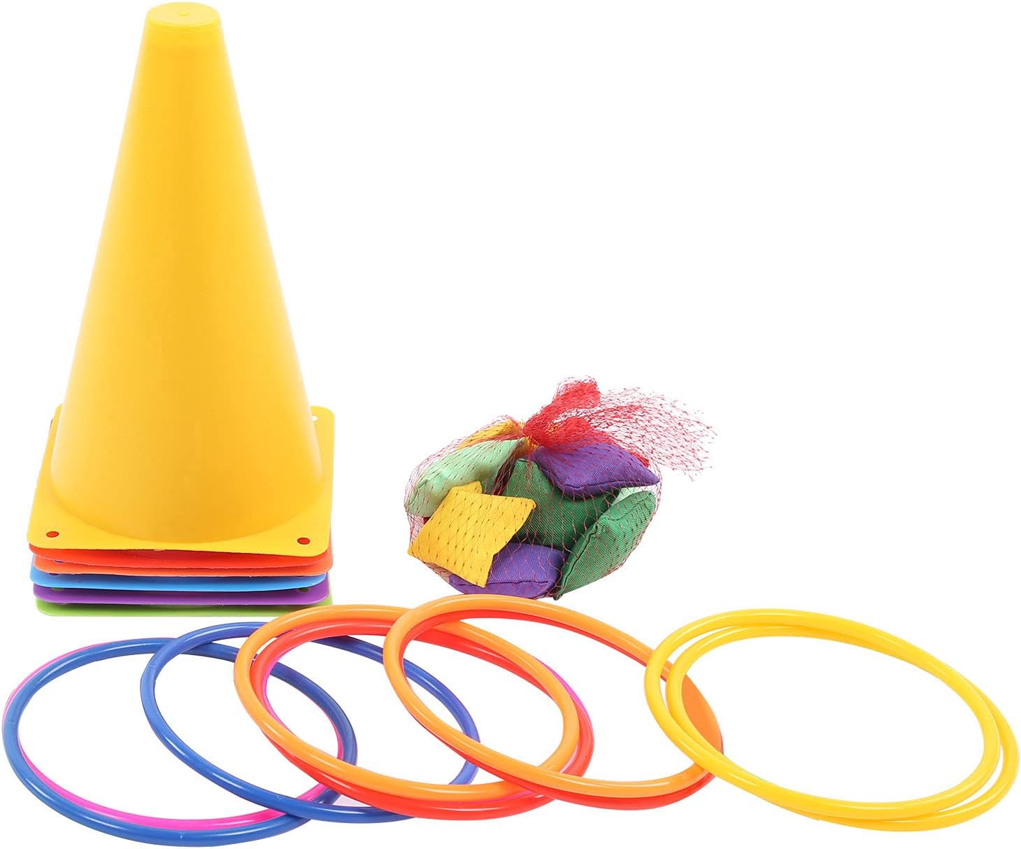 Materiale PE di alta qualità, resistente all'usura e durevole. Lo stress può essere una deformazione naturale, una durezza moderata, non facile da ferire la mano. 2. Adattabilità: il design dai colori vivaci garantisce visibilità e usabilità in condizioni di sole o pioggia, adattabile a vari ambienti senza limitazioni di sito. 3. Sviluppo delle abilità: migliora la precisione del lancio dei bambini e supporta l'interazione genitore-figlio per rafforzare i legami emotivi durante il gioco. 4. Caratteristiche di sicurezza: coni morbidi di sicurezza leggeri e compatti, cerchi colorati e sacchi di sabbia danno priorità alla sicurezza dei bambini durante le attività. 5. Uso multifunzione: set di attrezzature da gioco 3-in-1 ideale per feste, giochi al coperto e attività ricreative all'aperto.