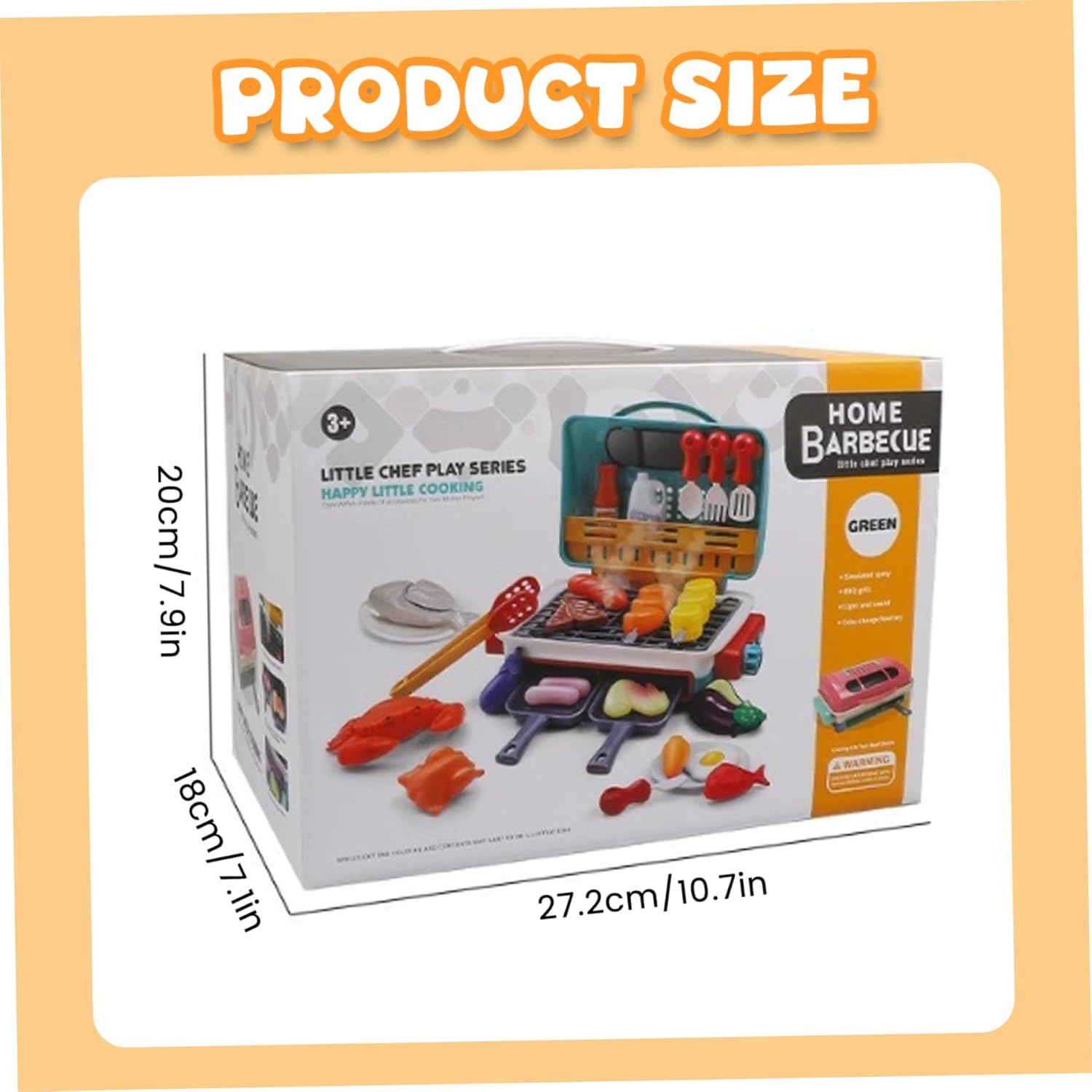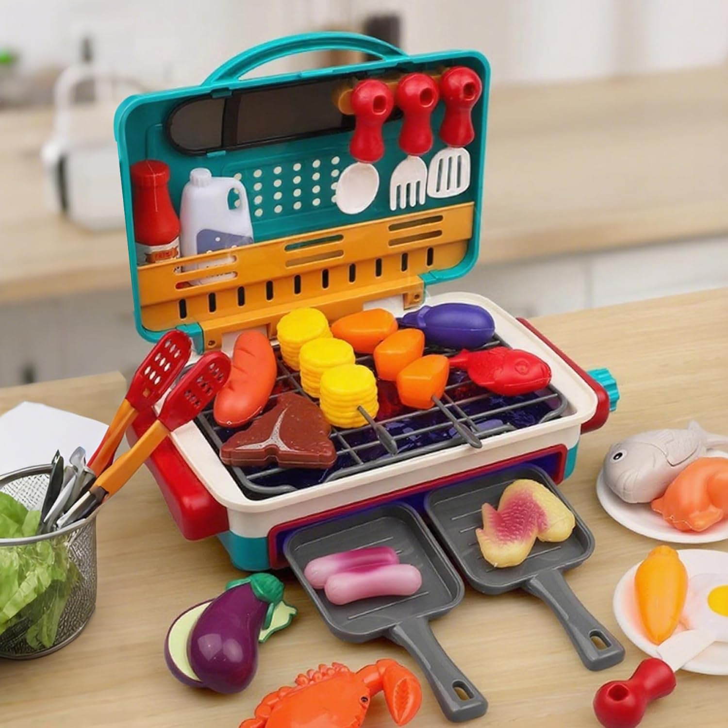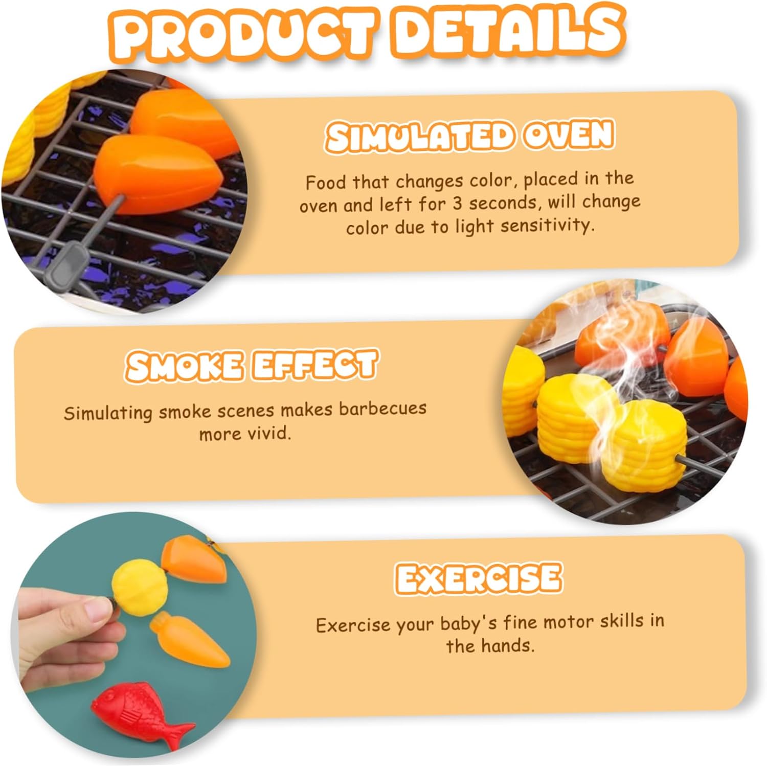 Divertimento alimentare che cambia colore: include salsicce, di pollo e pesce che cambiano magicamente colore quando vengono posizionati sulla griglia e tornano alla normalità dopo il raffreddamento, rendendo la cucina finta emozionante e interattiva. Esperienza grill realistica: presenta una griglia simulata con effetti di luce e fumo, creando una scena barbecue realistica che migliora il gioco sensoriale e l'immaginazione dei bambini. Design educativo e sicuro: incoraggia lo sviluppo delle capacità motorie e il pensiero creativo mentre è realizzato con materiali lisci e sicuri per i bambini..La porta per il riempimento dell'acqua e i dettagli realistici rendono ogni momento di gioco divertente e sicuro. Doppia modalità di gioco: offre due modalità coinvolgenti: la modalità barbecue a spruzzo con fumo e la modalità griglia a luce viola, che intrattiene i bambini con varie opzioni di gioco ed effetti visivi. Set completo da 35 pezzi: viene fornito con griglia, spiedini, posate, vassoio, piatti, pinze e cibo da gioco, offrendo ai bambini tutto ciò di cui hanno bisogno per ricreare un'esperienza barbecue completa.