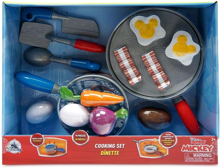 Il set Disney Store autentico, originale, autentico include 14 pezzi: padella, casseruola, carota, patata, cipolla, due gusci d'uovo, due uova al sole, due fette di pancetta e tre utensili Premi il grilletto sulla padella per avviare uova e pancetta Premi il grilletto sul manico per creare azioni di cottura Carota magnetica, cipolla e patata divise a metà