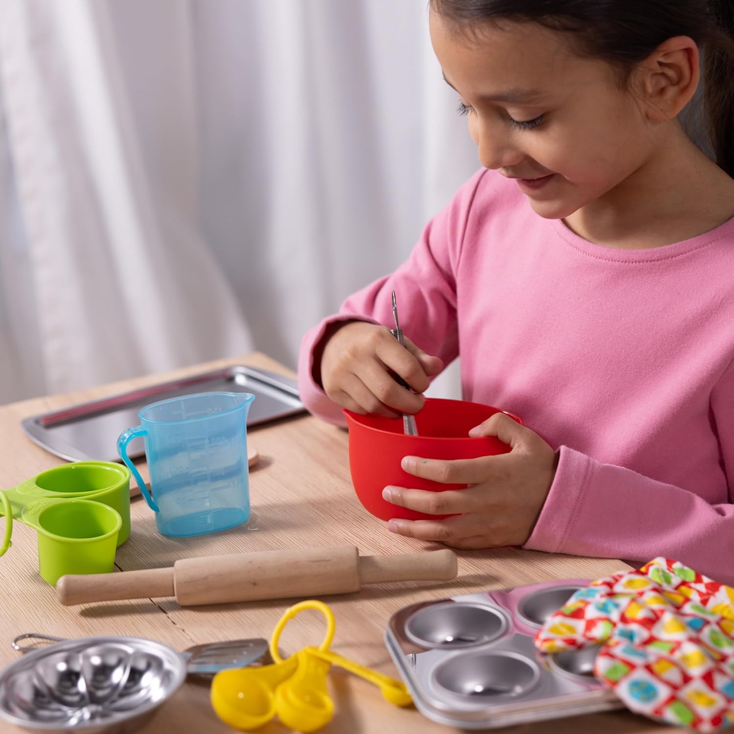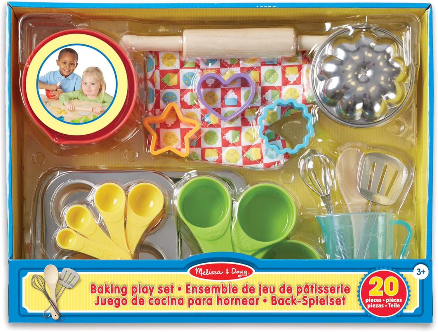 20 utensili da cucina per uso alimentare lavabili in lavastoviglie Utensili realizzati in acciaio inossidabile di grosso spessore, legno massiccio e plastica priva di BPA Include guanto da forno, misurini e tazze, frusta, spatola, ciotola, teglia per muffin e altro ancora! Include una divertente ricetta per l'impasto con cui mescolare e giocare. La migliore collezione di accessori da cucina giocattolo