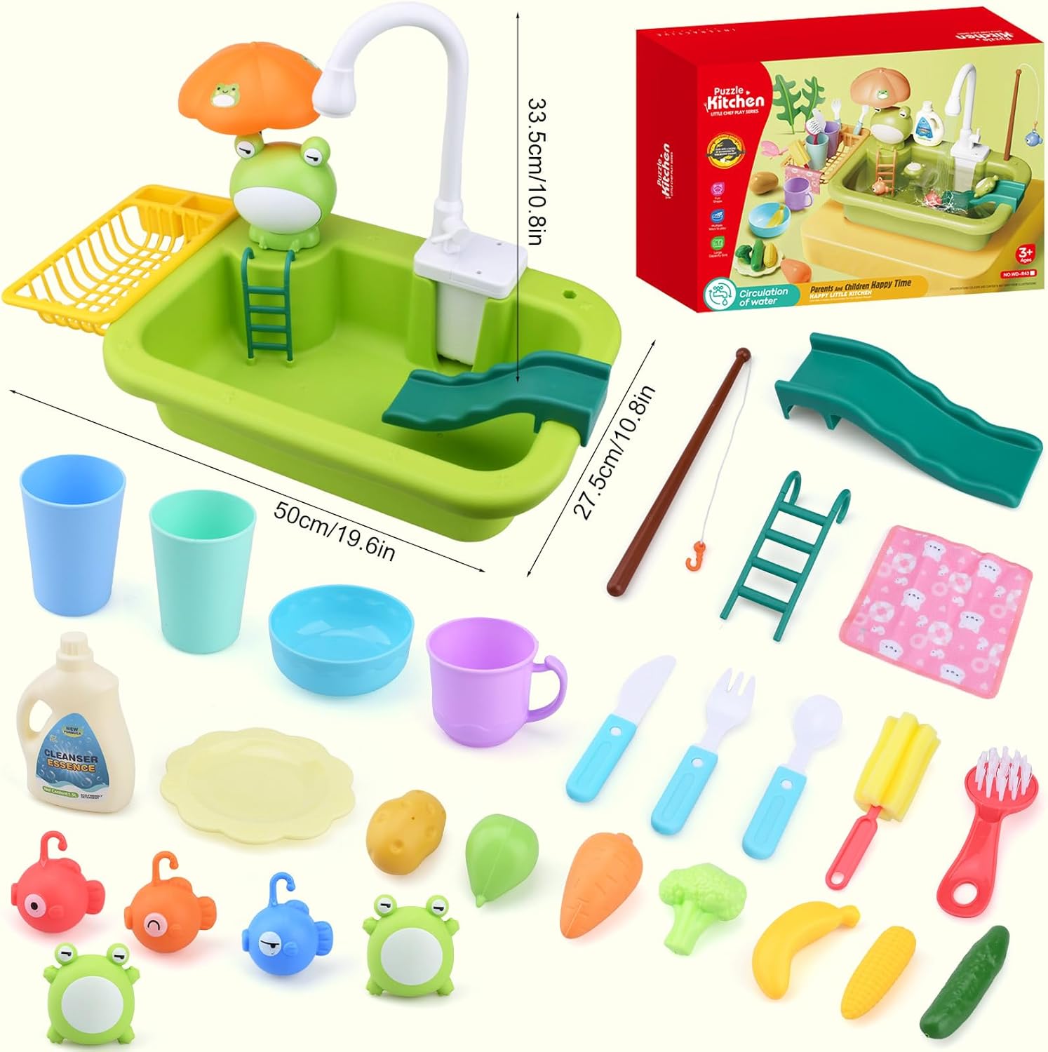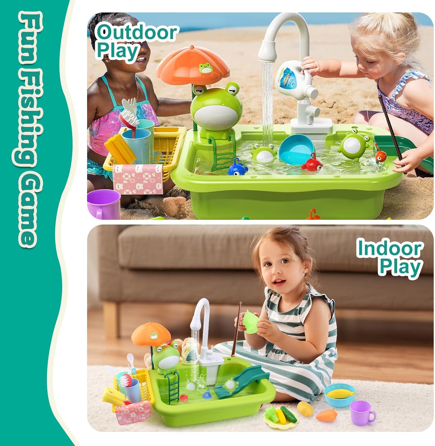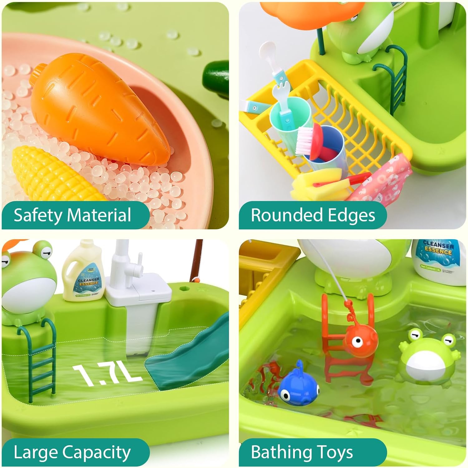 SET GIOCATTOLI PISCINA PER BAMBINI: Il set comprende una rana, una canna da pesca, frutta e verdura, tazze, ciotole, forchette, piccoli pesci, un secchio di detersivo per piatti, una spazzola per la pulizia, un panno per la pulizia e accessori giocattolo dall'aspetto molto elegante, colori brillanti e immagini vivide. Divertente giocattolo per bambini per simulare la cucina e il bagno. MATERIALI E PRODUZIONE DI ALTA QUALITÀ: realizzati in plastica di alta qualità, non tossica, innocua, inodore, sicura e durevole. Inoltre, i giocattoli sono sottoposti a severi controlli di qualità, sono finemente lucidati e hanno angoli arrotondati, il che riduce il rischio di lesioni per i bambini durante il gioco e garantisce maggiore sicurezza ai genitori. AIUTA I BAMBINI A CRESCERE: Questo giocattolo da lavandino non può essere utilizzato solo con le canne da pesca, ma può anche essere combinato con diversi giocattoli per rendere l'esperienza di gioco più varia. Migliora la coordinazione occhio-mano dei bambini, attiva il loro pensiero e aiutali a crescere STOCCAGGIO EFFICIENTE E FACILE DA PULIRE: il set da gioco per lavello per bambini è dotato di un piccolo ripiano e un lavandino, che possono facilmente riporre tutti i giocattoli senza occupare spazio aggiuntivo. Il rubinetto è dotato di sistema di circolazione dell'acqua e può essere ruotato di 90° per lavare diverse zone. Molto facile da riporre e pulire. REGALO EDUCATIVO PER BAMBINI: è un ottimo regalo per ragazzi o ragazze di 3, 4, 5, 6, 7, 8 anni per compleanni, estate, vacanze, famiglia o vacanze. Non solo li rende felici, ma li aiuta anche ad acquisire molte potenziali conoscenze.