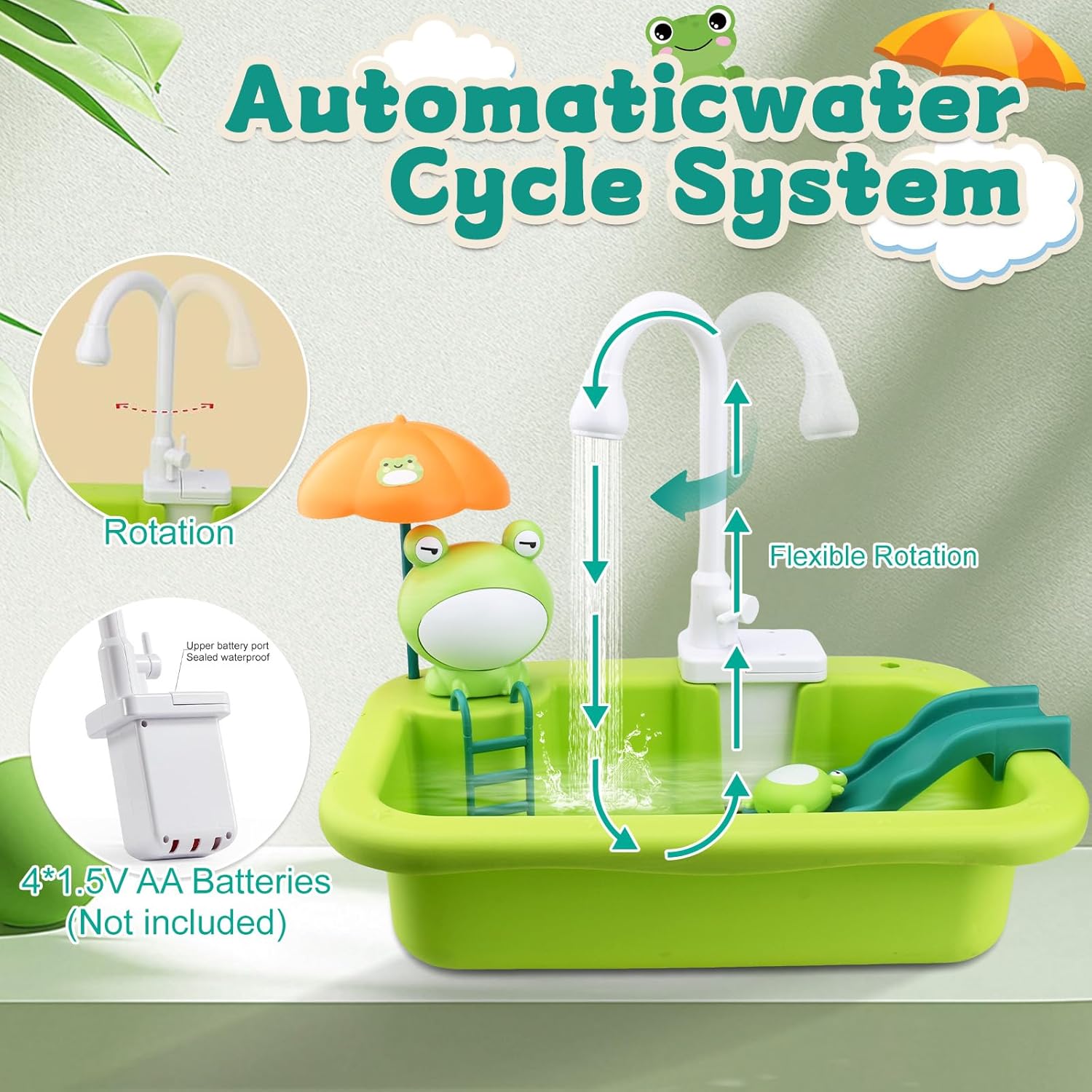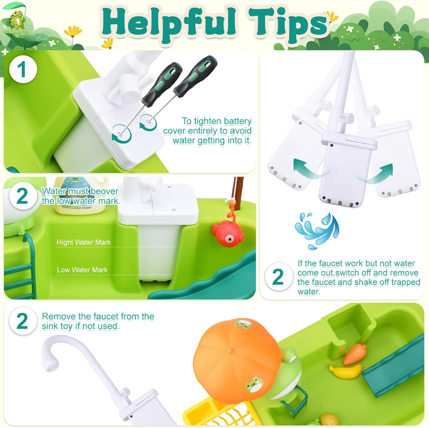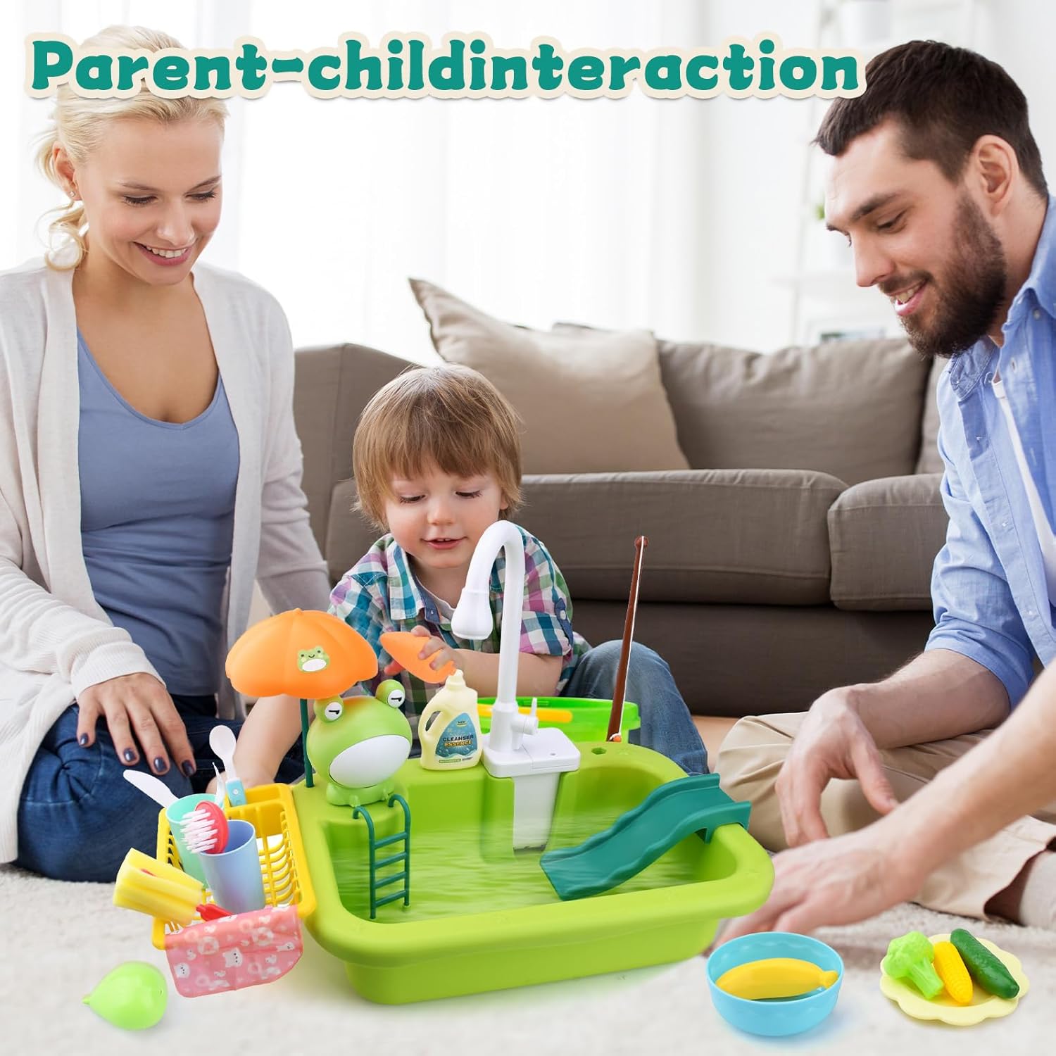 SET GIOCATTOLI PISCINA PER BAMBINI: Il set comprende una rana, una canna da pesca, frutta e verdura, tazze, ciotole, forchette, piccoli pesci, un secchio di detersivo per piatti, una spazzola per la pulizia, un panno per la pulizia e accessori giocattolo dall'aspetto molto elegante, colori brillanti e immagini vivide. Divertente giocattolo per bambini per simulare la cucina e il bagno. MATERIALI E PRODUZIONE DI ALTA QUALITÀ: realizzati in plastica di alta qualità, non tossica, innocua, inodore, sicura e durevole. Inoltre, i giocattoli sono sottoposti a severi controlli di qualità, sono finemente lucidati e hanno angoli arrotondati, il che riduce il rischio di lesioni per i bambini durante il gioco e garantisce maggiore sicurezza ai genitori. AIUTA I BAMBINI A CRESCERE: Questo giocattolo da lavandino non può essere utilizzato solo con le canne da pesca, ma può anche essere combinato con diversi giocattoli per rendere l'esperienza di gioco più varia. Migliora la coordinazione occhio-mano dei bambini, attiva il loro pensiero e aiutali a crescere STOCCAGGIO EFFICIENTE E FACILE DA PULIRE: il set da gioco per lavello per bambini è dotato di un piccolo ripiano e un lavandino, che possono facilmente riporre tutti i giocattoli senza occupare spazio aggiuntivo. Il rubinetto è dotato di sistema di circolazione dell'acqua e può essere ruotato di 90° per lavare diverse zone. Molto facile da riporre e pulire. REGALO EDUCATIVO PER BAMBINI: è un ottimo regalo per ragazzi o ragazze di 3, 4, 5, 6, 7, 8 anni per compleanni, estate, vacanze, famiglia o vacanze. Non solo li rende felici, ma li aiuta anche ad acquisire molte potenziali conoscenze.