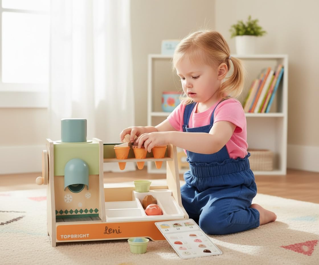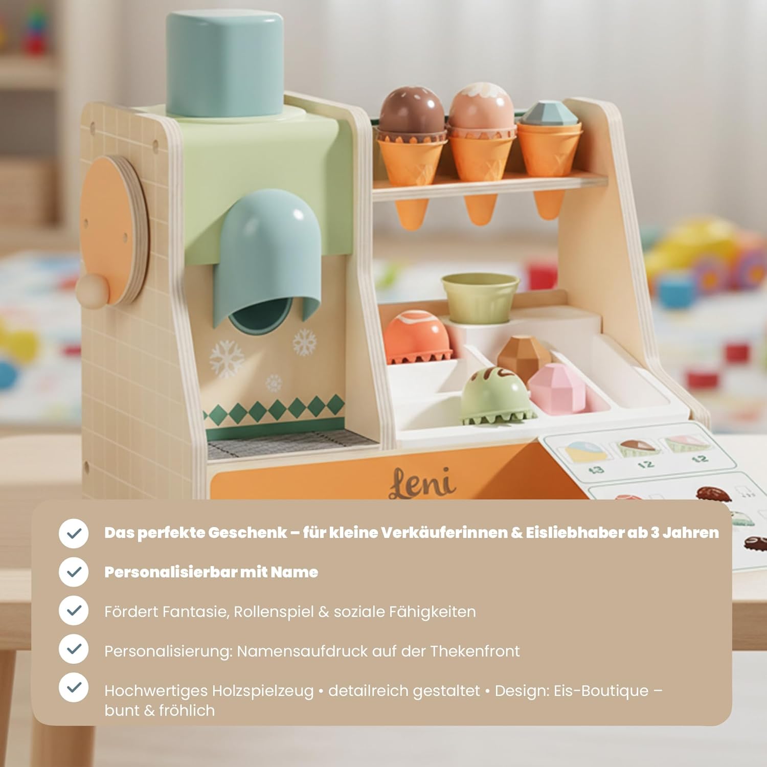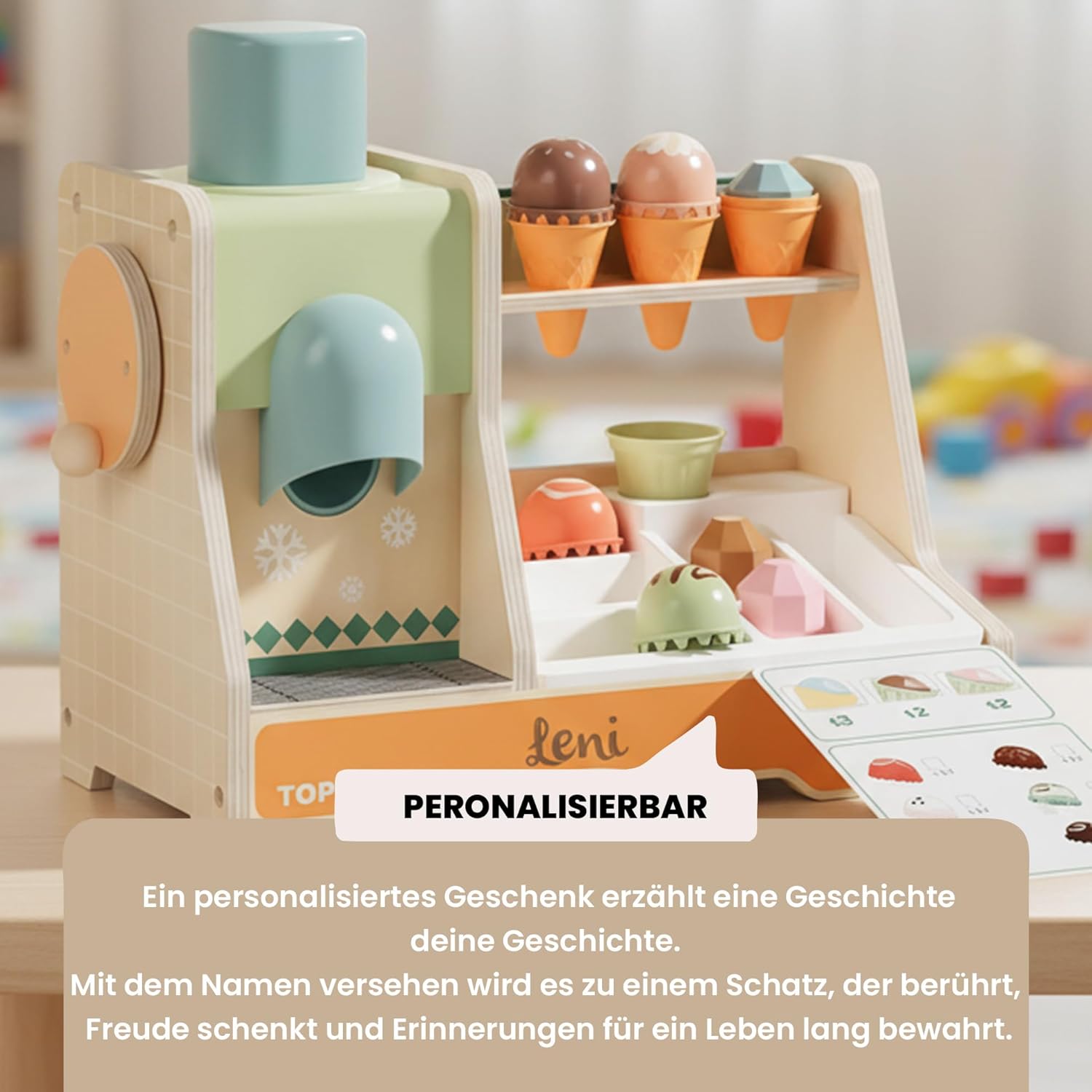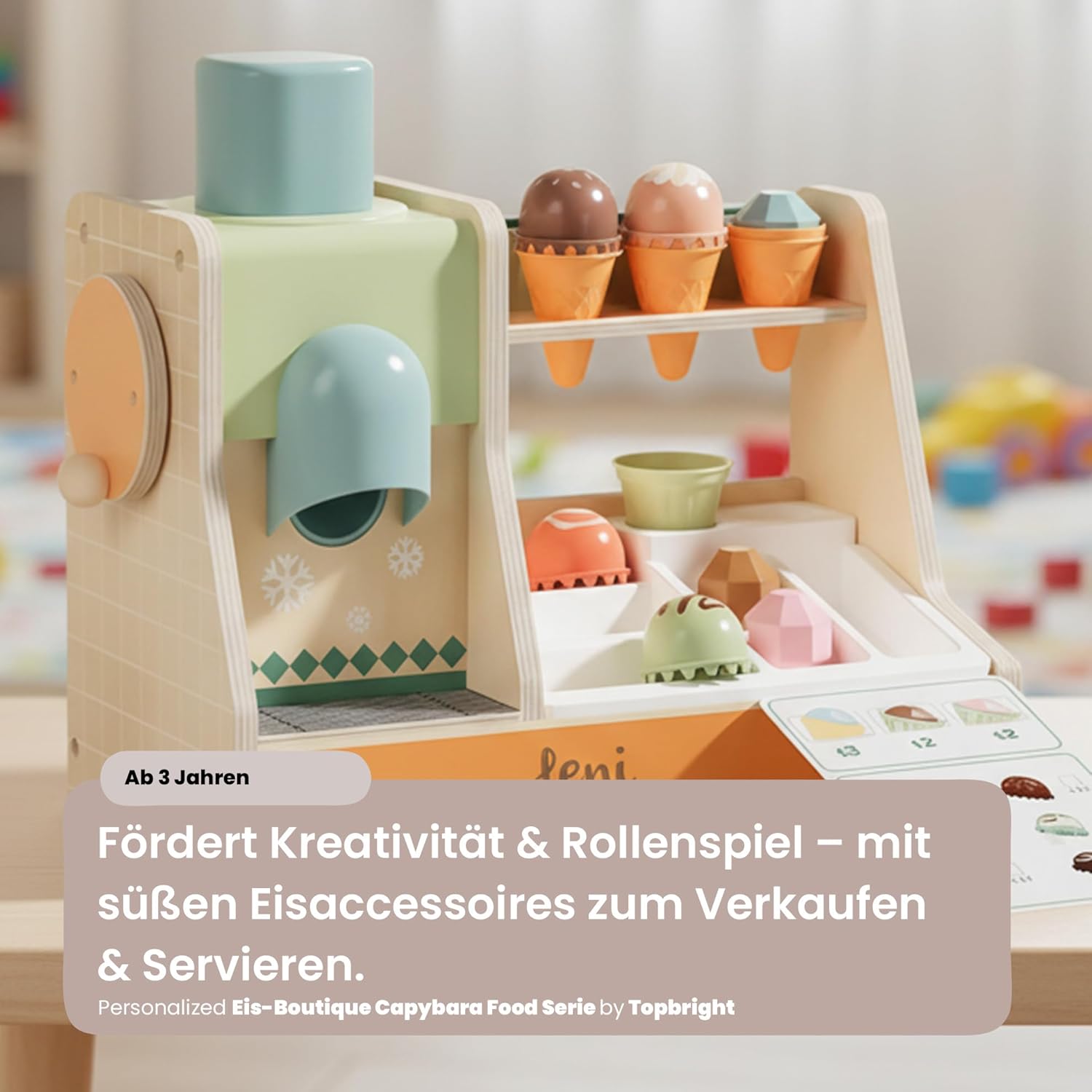 Immergiti nel mondo di una gelateria: la gelateria BOUTIQUE di TOPBRIGHT invita i bambini a partire dai 36 mesi a riprodurre la vivace atmosfera di una gelateria. Create le vostre creazioni di gelato ruotando la manovella per il gelato lasciando cadere palline di ghiaccio in waffle e completando le palline con diversi condimenti. Gioco educativo: carte d'ordine e denaro di gioco supportano giocosamente il primo conteggio e semplici addizioni. Porzionare, impilare e decorare le creazioni di ghiaccio allenano in modo mirato la coordinazione occhio-mano e le capacità motorie dei piccoli venditori di ghiaccio. Gioco realistico: un banco di spesa realizzato con amore con una lavagna scrivibile, un simpatico capybara, carte d'ordine e denaro per giocare attivamente comunicativamente. Design creativo: diversi condimenti e un porzionatore per gelato stimolano l'immaginazione e invitano i bambini a creare sempre nuove creazioni di gelato. Divertimento durevole: le palline di ghiaccio e i waffle hanno la dimensione ideale per le mani dei bambini piccoli. La gelateria è realizzata in legno certificato FSC, gli accessori per il gelato sono realizzati in plastica di alta qualità. In questo modo è assicurato un divertimento duraturo. Questo rende la gelato BOUTIQUE un ottimo regalo per Natale, Pasqua o compleanno per bambini a partire dai 3 anni.