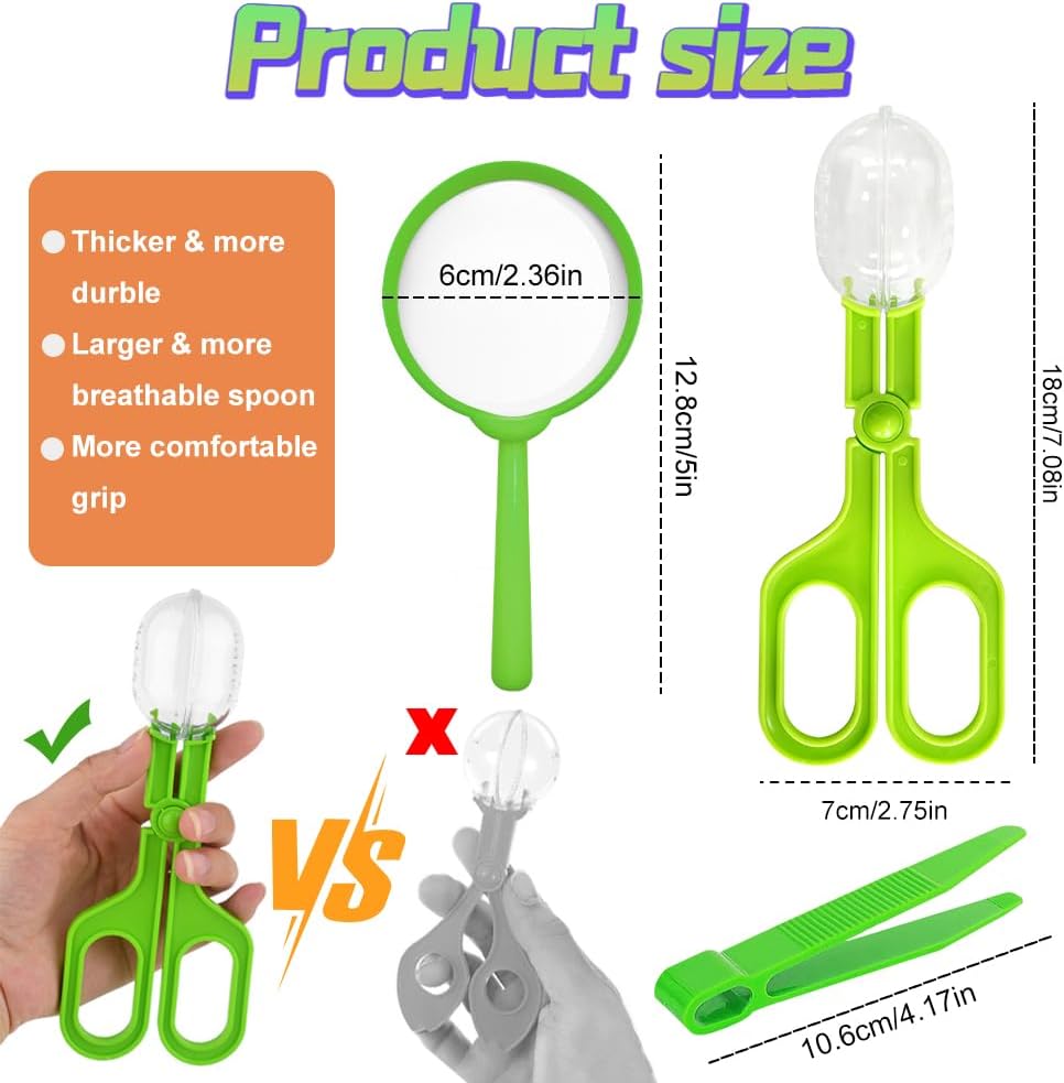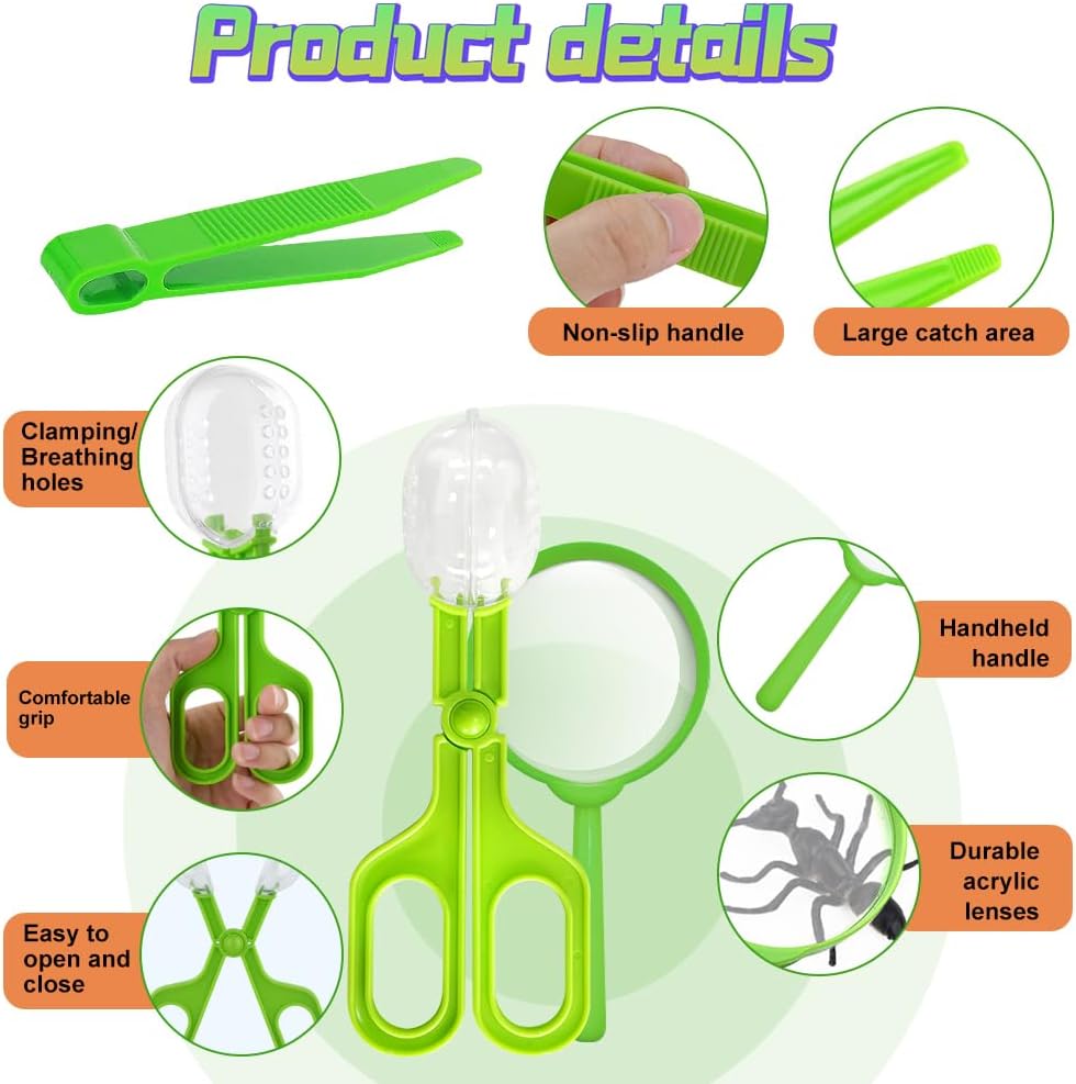 🌿 Set da ricercatore per bambini: ti forniamo due set di cattura insetti per bambini, ogni set contiene una clip per insetti a capsula a forma di forbice, una pinzetta e una lente d'ingrandimento. Un fantastico set di ricerca per bambini, pensato soprattutto per i bambini dai 3 agli 8 anni! Lasciate che i vostri bambini si avvicinino alla natura, imparino e osservino gli animali e acquisiscano maggiori conoscenze. 🐞 Set di ricerca accurata per i bambini: la clip per insetti è dotata di fori di ventilazione in modo che i piccoli insetti possano respirare e sopravvivere meglio. Le pinzette possono aiutare i bambini a catturare facilmente piccoli insetti senza ferirsi. La lente d'ingrandimento permette ai bambini di osservare da vicino le attività quotidiane degli animali in cattività. 🐛 Giocattolo da esploratore durevole: il set da esploratore per bambini è realizzato principalmente in plastica di alta qualità, robusta e durevole, non facile da rompere e rompere, sicura e inodore. Stimola lo spirito di scoperta dei bambini e consenti ai bambini di migliorare continuamente le proprie capacità cognitive ed espandere il proprio pensiero durante il gioco! 🍁DIMENSIONE adatta: dimensioni delle forbici per insetti: 7,3*2,7 pollici e dimensioni della lente d'ingrandimento per bambini: 5,1*2,4 pollici, dimensioni delle pinzette per bambini: 4,2*0,5 pollici. Misura perfetta per le mani dei bambini. Consenti ai bambini di catturare con successo farfalle, cavallette, ragni, formiche, coccinelle e altri piccoli animali nell'esplorazione del campeggio nel parco sul retro e diventare esploratori nella vita. 🐝 Ottimo regalo per i bambini: l'acchiappa insetti per bambini è un eccellente regalo di compleanno, regalo di festa o regalo di esplorazione all'aria aperta per tuo figlio, figlia o nipote. Incoraggia i bambini ad avere la curiosità e la mobilità necessarie per esplorare il mondo e scoprire attivamente le meraviglie della natura.