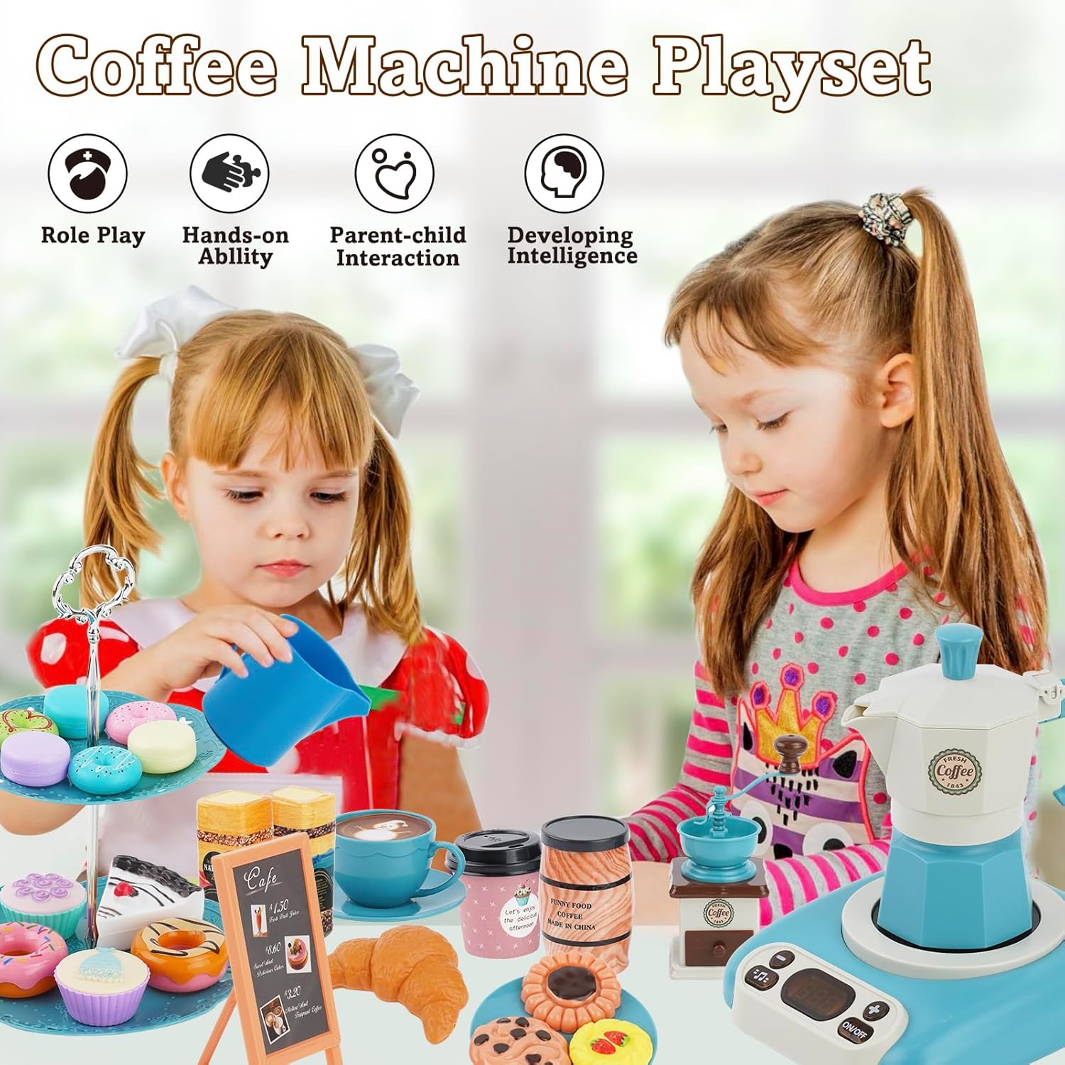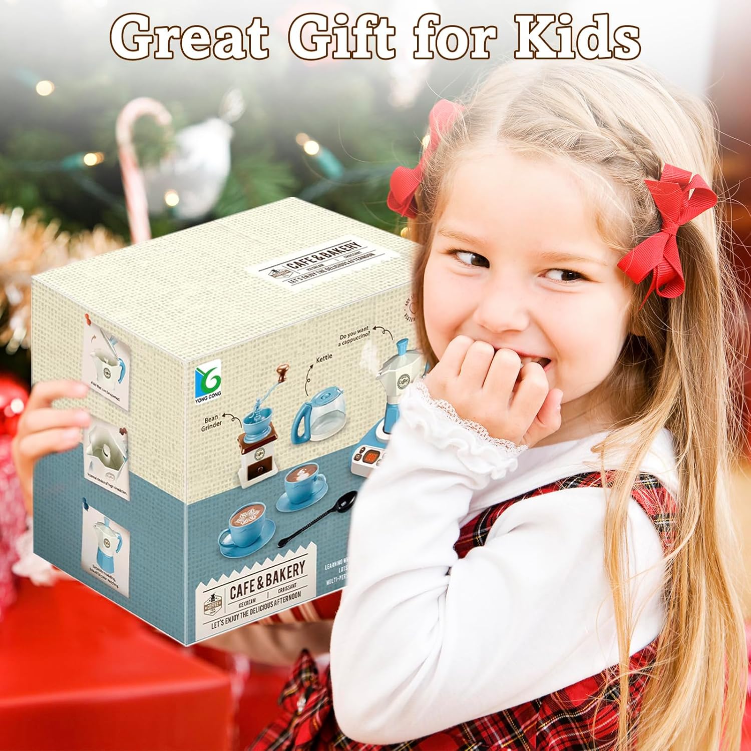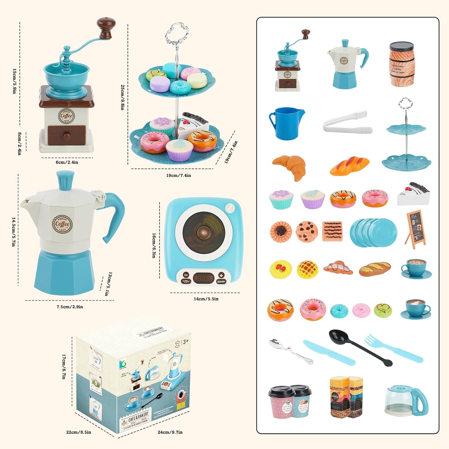 Set da tè per bambini: set da tè da 41 pezzi, include un set per la macchina del caffè: 1 barile per il caffè,1 caffettiera,3 gelati, 1 macinacaffè,2 tazze da caffè,2 bicchieri di carta per il caffè,1 barattolo per il caffè,1 cucchiaio,3 piatti, 1 pinza per alimenti,1 tavola decorativa, 1 scatola regalo,set da dessert con cibo finto, include 2 coltelli, 2 forchette,1 alzatina per torte a 2 livelli,17 dessert. Ottimo per giochi di ruolo e di finzione,crea ore di divertimento per i bambini. Sicuro e durevole: il set da tè finto è realizzato in materiale ABS sicuro, è resistente e ha i bordi lisci. Lascia che i bambini si divertano per infinite ore con i genitori e gli amici. Divertimento senza fine e stimola la creatività: questo set da tè giocattolo assicura che le vostre bambine siano completamente attrezzate per dedicarsi a ore di gioco di finzione fantasioso. Aiuta a migliorare le loro capacità comunicative e linguistiche, stimola l'immaginazione, la creatività e la coordinazione occhio-mano. Set realistico per macchina da caffè e dessert: questi finti dessert sono attraenti come il cibo vero, rendendo i bambini più interessati a questi giocattoli per dessert. Il frullatore per caffè può simulare il processo di macinatura del caffè, incoraggiando le capacità pratiche dei più piccoli. Miglior regalo: fantastico set da tè finto per bambine! Questo set è perfetto come regalo di Natale, Halloween, compleanno, Pasqua, attività scolastiche, ecc. È un set da tè giocattolo così portatile che le bambine possono giocare sia in casa che all'aperto.