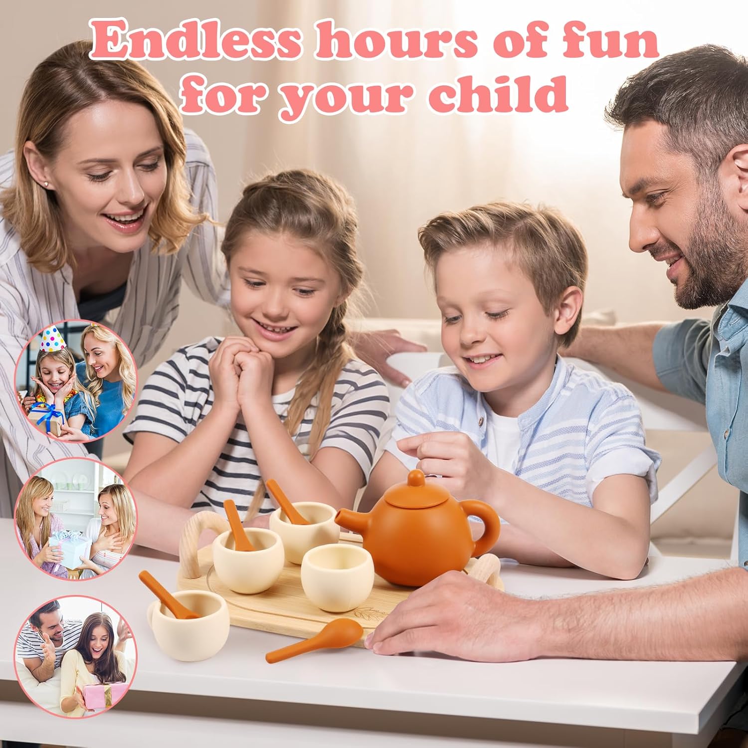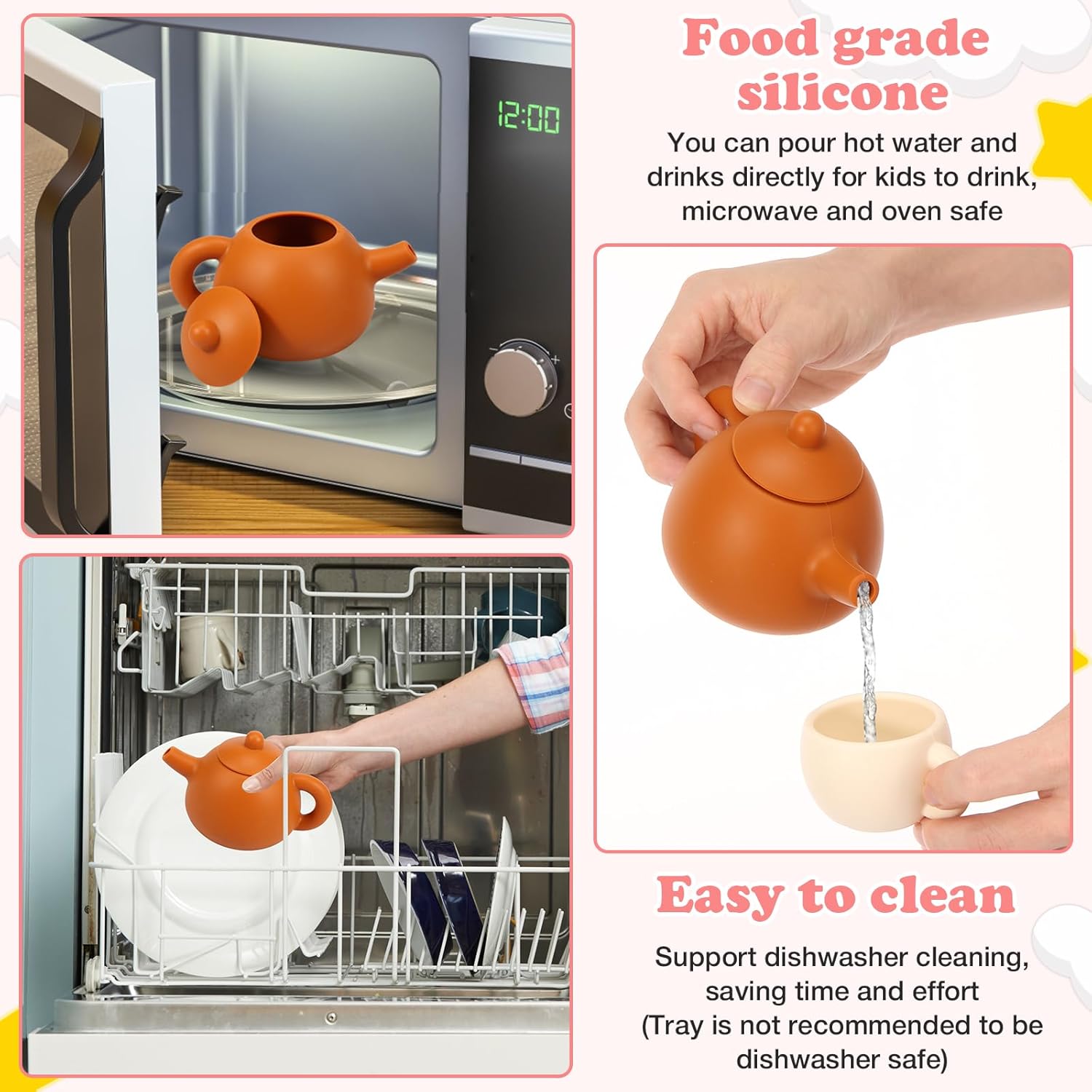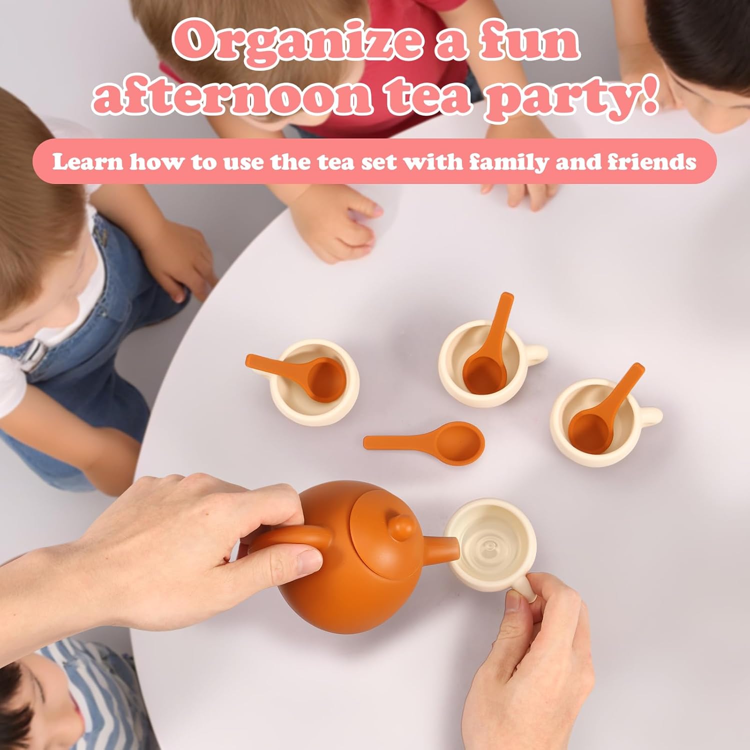 Materiale sicuro: la teiera, le tazze e i cucchiai sono realizzati in silicone, resistente al calore, sicuro, durevole e adatto alla masticazione. Possono conservare acqua calda e bevande direttamente per i bambini e sono adatti al microonde e al forno. Il vassoio è in legno e garantisce sicurezza durante il gioco. Design realistico: caratterizzato da un design realistico e naturale in tinta unita. Non è solo un giocattolo divertente, ma anche una decorazione creativa per la cameretta dei bambini o l'asilo. Idea regalo creativa: i bambini giocheranno a fingere di servire il tè pomeridiano e si divertiranno per ore. Ideale per compleanni, festa dei bambini, Natale e Ringraziamento. Pulizia: le parti in silicone (teiera, coperchio, tazza, cucchiaio) sono lavabili in lavastoviglie; il vassoio in legno deve essere lavato a mano. Promuove le abilità di vita: questo set da tè da gioco altamente realistico funge da giocattolo in età prescolare e aiuta i bambini a migliorare le abilità di vita di base, le abilità sociali, la coordinazione occhio-mano, l'indipendenza e la fiducia in se stessi, promuove la creatività e l'immaginazione. Set da tè per bambini da 11 pezzi: include 1 vassoio in legno, 1 teiera in silicone, 1 coperchio per teiera in silicone, 4 tazze in silicone e 4 cucchiai in silicone. I bambini potranno trascorrere meravigliosi pomeriggi con questo set.