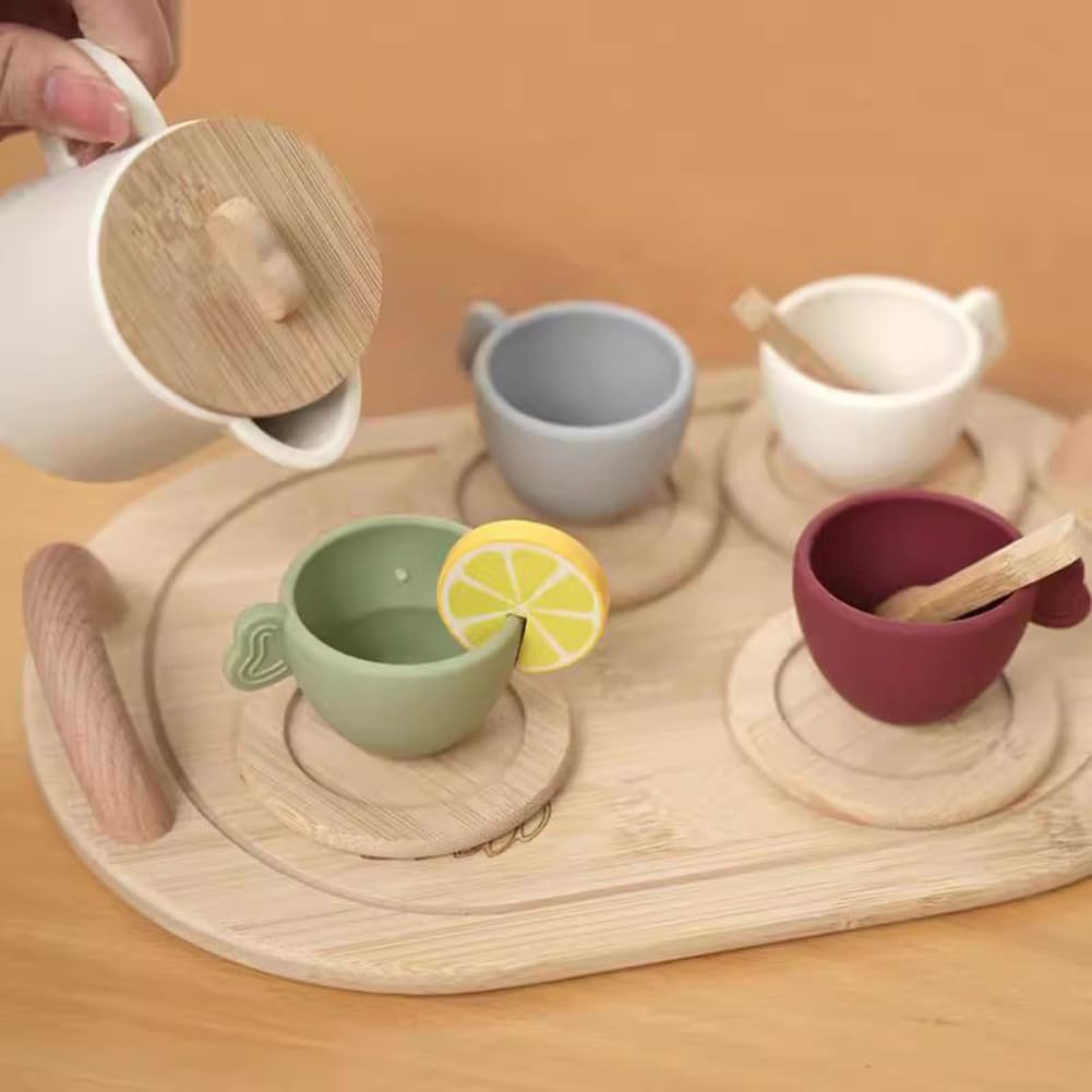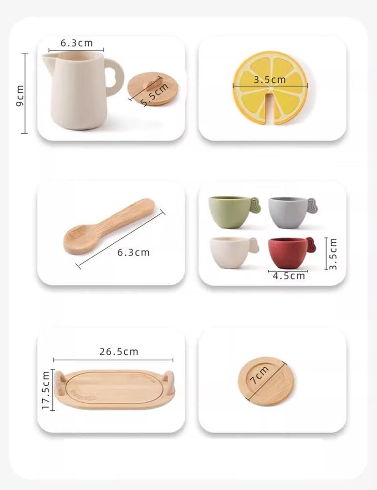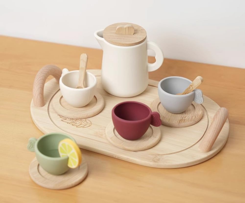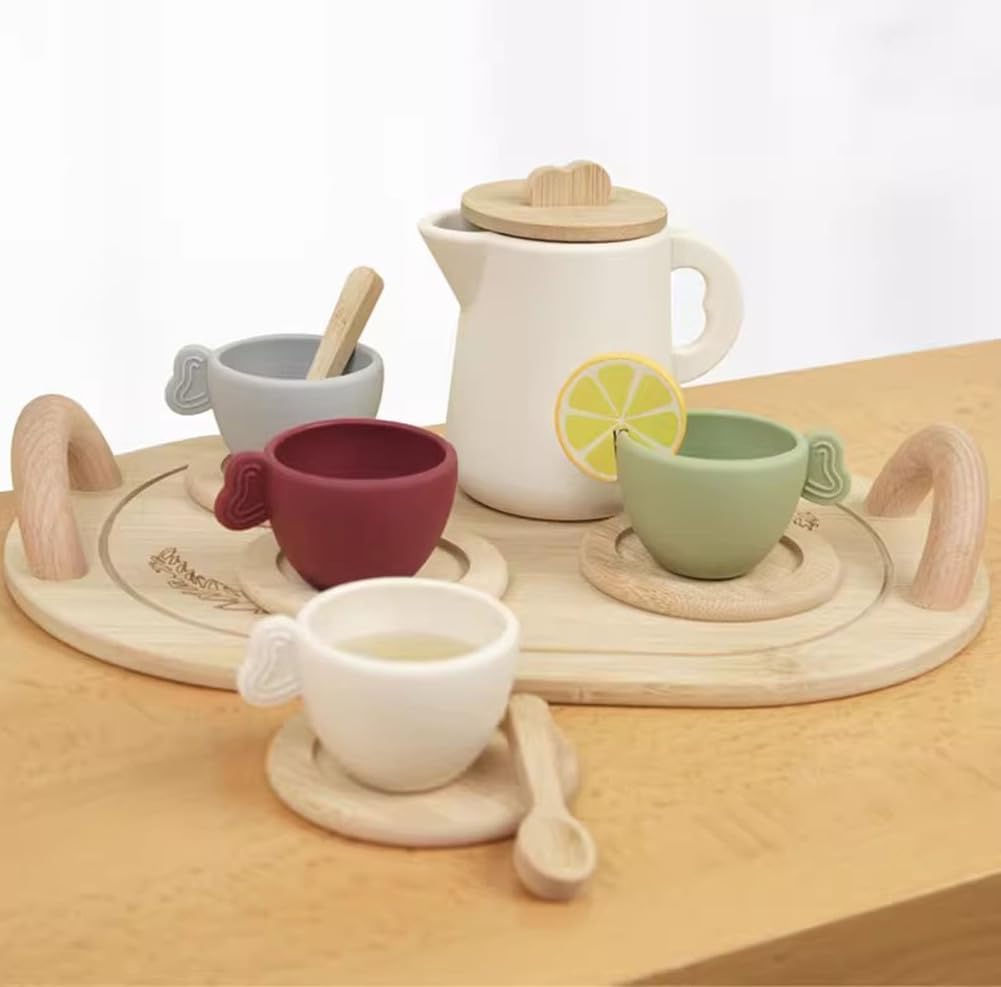 Composizione del sussidio didattico: teiera, limone, cucchiaio *2, tazze da tè *4, vassoio, tazze e piattini *4. Scene di gioco di ruolo realistiche: servizio da tè per bambini con design naturale in tinta unita e set unico in una squisita confezione regalo. Lascia che i bambini siano più immersi nella scena durante il gioco e si divertano con il gioco di ruolo. Giocattoli educativi: le situazioni di vita reale ispirano i bambini a pensare in modo creativo durante l'infanzia. Questo set da tè aiuta i bambini ad apprendere le abilità di base, tra cui il riconoscimento delle forme, la categorizzazione e l'ordinamento. Esercita anche la coordinazione occhio-mano, migliora la socializzazione con gli amici e favorisce l'immaginazione nei bambini piccoli. Materiale siliconico per uso alimentare: sicuro e sano, inodore, morbido e delicato sulla pelle, resiliente e indeformabile, resistente agli urti, durevole e facile da pulire. Età applicabile: 3 .