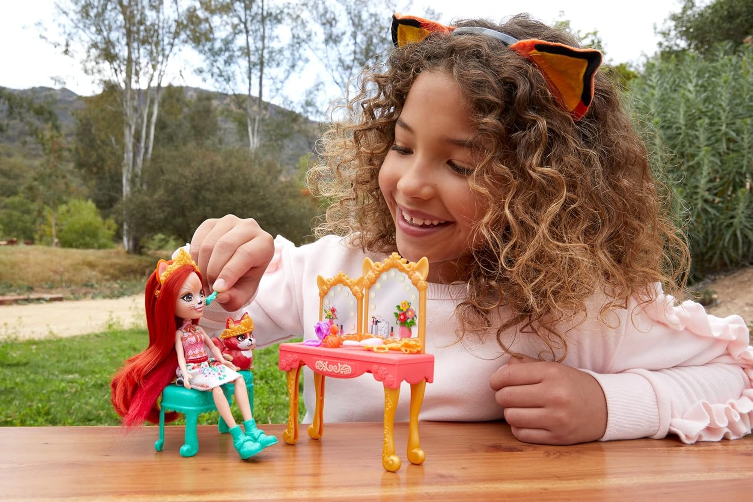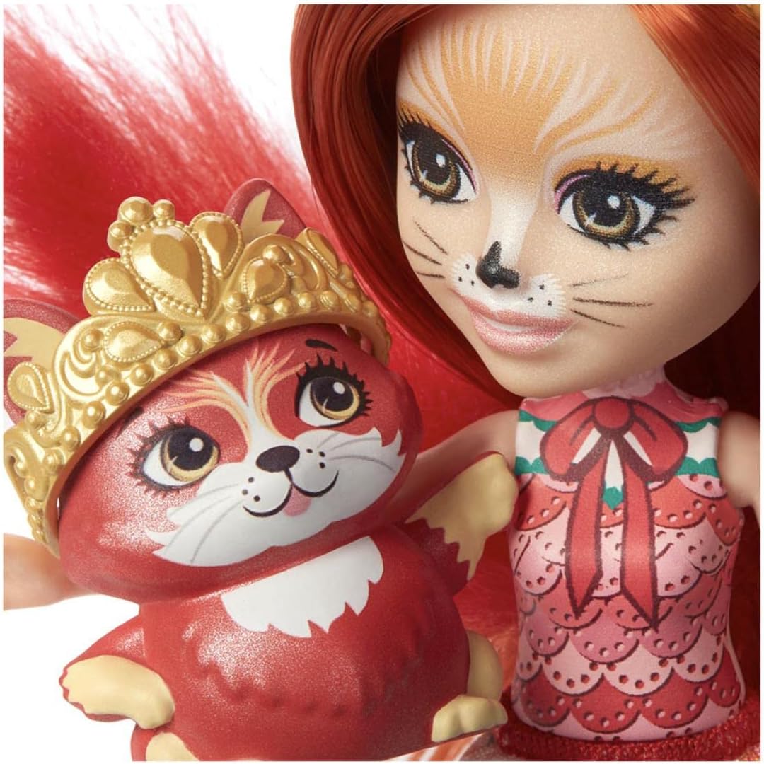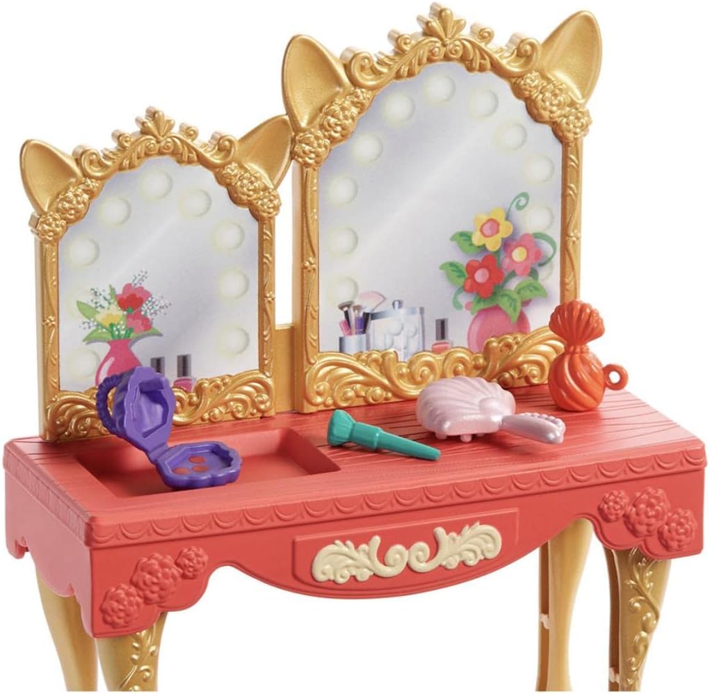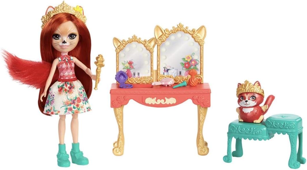 Preparati per il ballo reale con Fabrina Renard (6 pollici) e la bambola Frisk della collezione Royal Enchantimals. Questa toeletta in stile antico con delicate decorazioni è dotata di doppio specchio e doppia seduta, i bambini potranno rinnovarsi in compagnia di queste migliori amiche volpi. Accessori come una bottiglia di profumo, un portacipria, un pennello e altro ancora stimolano l'immaginazione. diadema e scettro. Frisk è assolutamente adorabile con la sua corona abbinata, pronta per le avventure reali. Ottima idea regalo per bambini dai 4 anni in su, soprattutto se amano gli animali