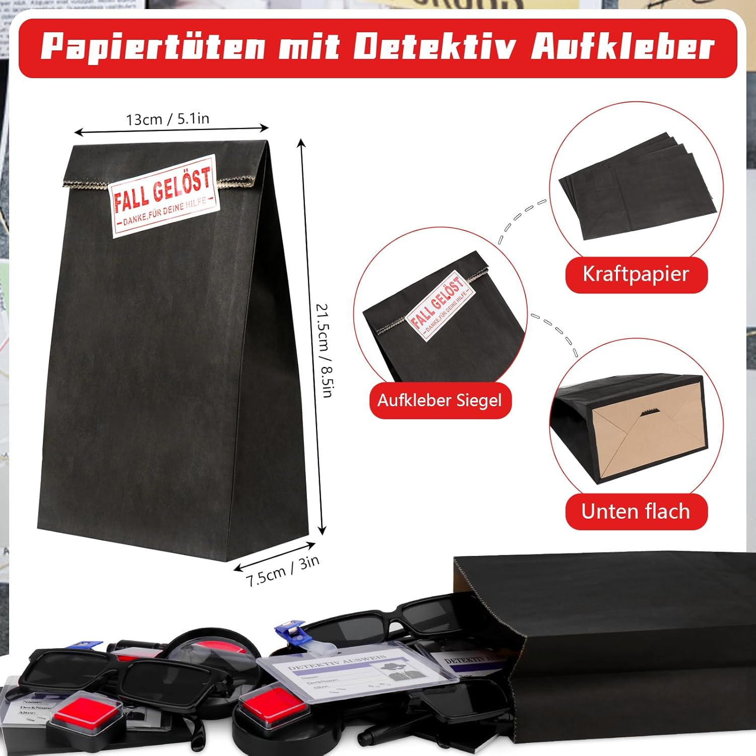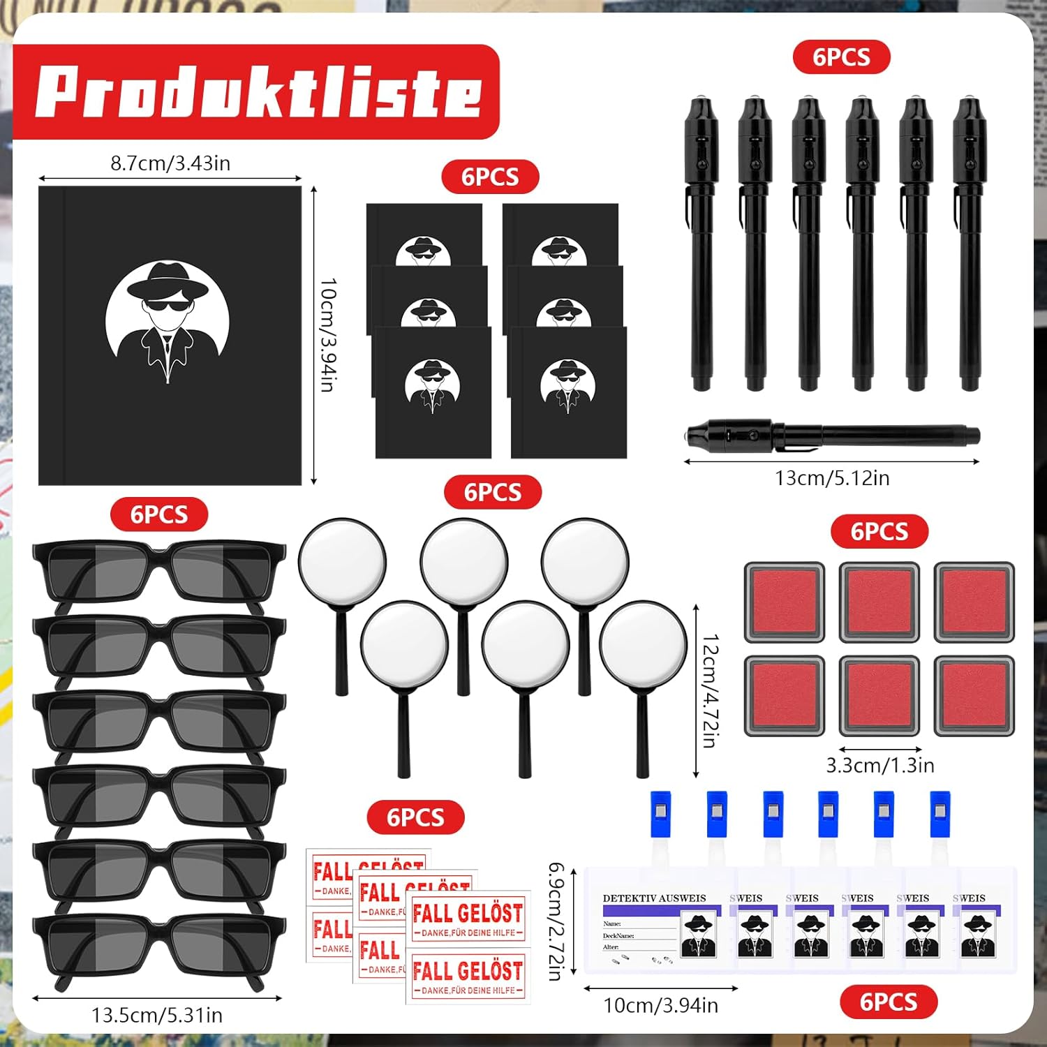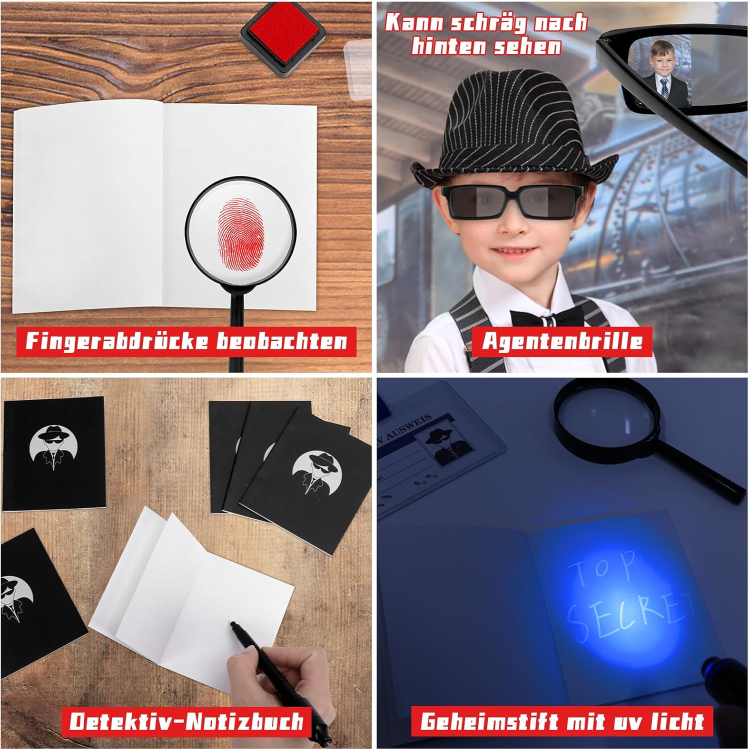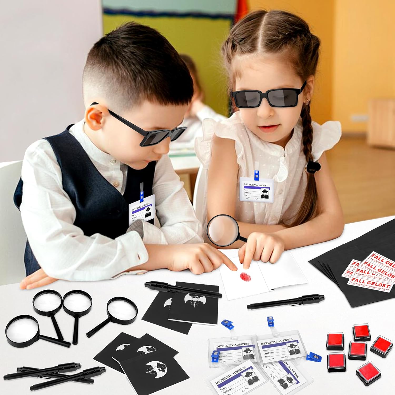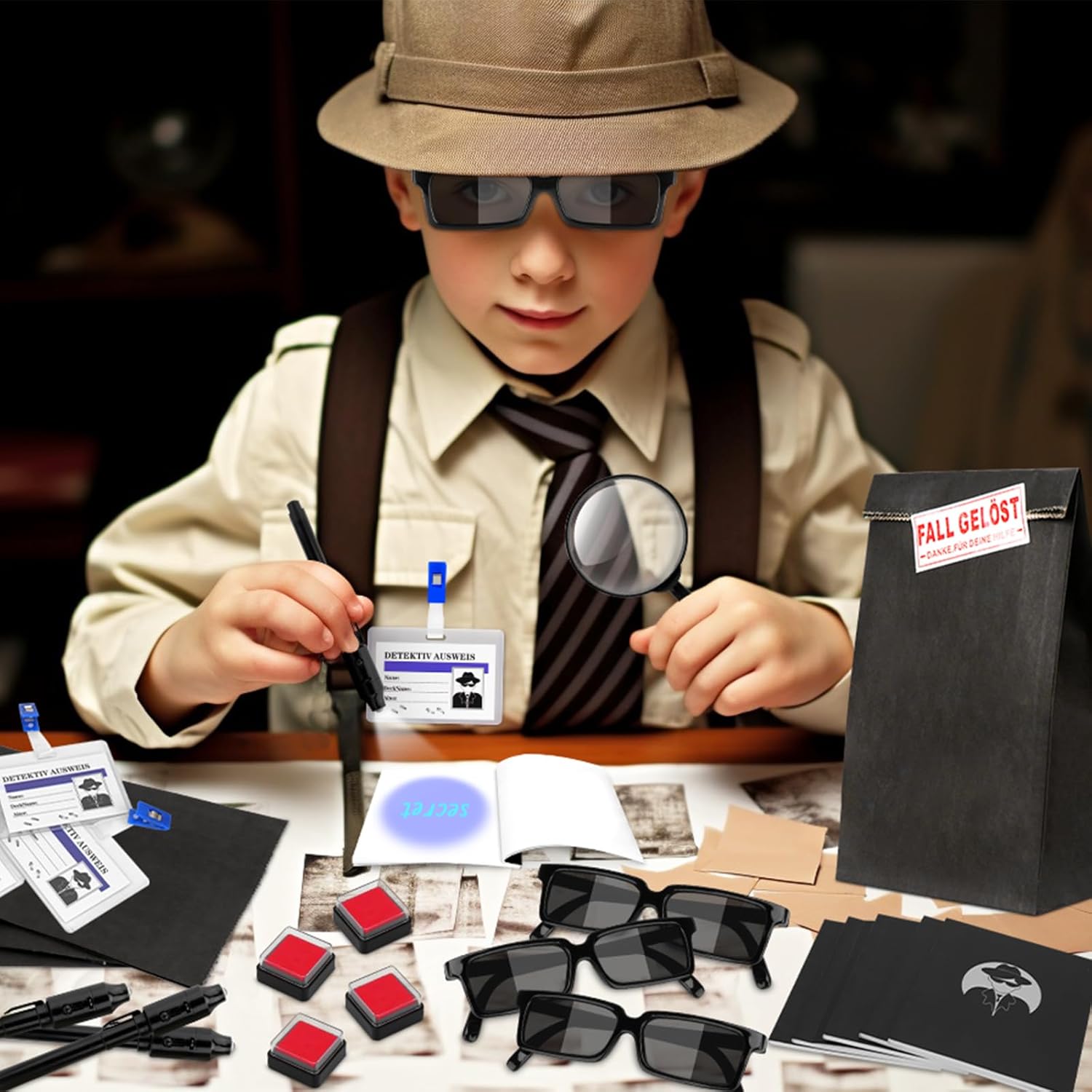 🕵️SET DA DETECTIVE DA 48 PEZZI PER USI VERSATILI: questo ampio set comprende 6 occhiali spia, 6 penne segrete, 6 quaderni, 6 lenti d'ingrandimento, 6 carte d'identità dell'investigatore, 6 set di impronte digitali e 6 sacchetti di carta con adesivi "CASO RISOLTO". Adatto per attività di gruppo, eventi di fuga o come regalo in varie occasioni. 🕵ESPERIENZE INTERATTIVE: MESSAGGI SEGRETI E ANALISI DELLE TRACCE: Le penne cerebrali UV ti consentono di scrivere messaggi invisibili che diventano visibili sotto la luce integrata. Le lenti d'ingrandimento possono essere utilizzate per esaminare i dettagli e i set di impronte digitali aiutano a ricreare tracce, ideali per intrattenere attività puzzle. 🕵MATERIALI DUREVOLI PER USO RIPETUTO: i componenti di questo set sono realizzati con materiali durevoli. Gli occhiali e le lenti d'ingrandimento sono realizzati in plastica robusta, i quaderni e le carte d'identità sono realizzati in carta di alta qualità. Il set di impronte digitali è progettato per rappresentazioni chiare. 🕵️CONSERVAZIONE PRATICA CON ADESIVI “CASE SOLVED”: Il set contiene sacchetti di carta (13 x 7,5 x 21,5 cm) e adesivi decorativi (7 x 3 cm) per organizzare gli utensili o per piccole sorprese. Ideale per creare più set individuali per i partecipanti. 🕵IDEALE PER EVENTI E ATTIVITÀ A TEMA: il set è una buona scelta per eventi in escape room, feste a tema, giochi di gruppo o come regalo. Supporta attività interattive e divertenti in varie situazioni sociali.