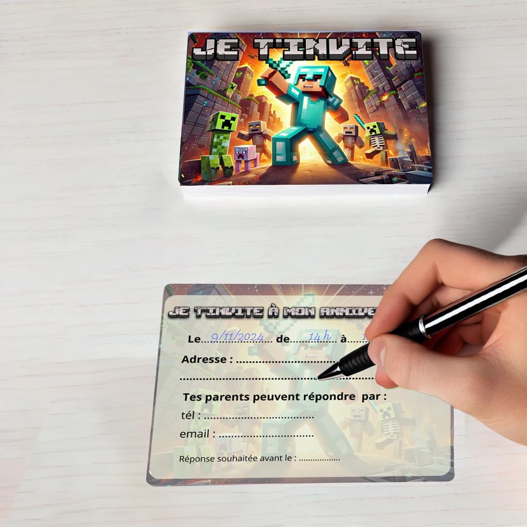 👾 [CONFEZIONE DA 10 CARTE D'INVITO COMPLEANNO MINECRAFT] – Carte perfette per gli appassionati di videogiochi e Minecraft, ideali per i compleanni di adolescenti (soprattutto ragazzi). Un design accattivante che piacerà agli appassionati di gaming. ⭐️ [RETRO PRECOMPITO PER UNA FACILE ORGANIZZAZIONE] – Ogni scheda è precompilata per semplificare l'aggiunta delle informazioni essenziali: data, ora, luogo e dettagli della risposta. Perfetto per genitori e bambini che organizzano una festa di compleanno. 🎮 [BUSTA STAMPATA A TEMA VIDEOGIOCO] – Inclusa: buste a tema Minecraft abbinate, con un design stampato a tema videogioco originale, che aggiunge un tocco speciale a ogni invito. 📏 [FORMATO CARTOLINA DI ALTA QUALITÀ] – Cartoline in formato 10,4 cm x 14,8 cm, stampate su carta opaca di alta qualità da 350 g/m², garantendo vestibilità e qualità professionali. La scelta ideale per celebrare con stile le occasioni speciali. 🇫🇷 [MADE IN FRANCE AND ASSEMBLED BY AN ESAT] – Prodotto locale e responsabile, realizzato in Francia e assemblato da un ESAT (istituto di servizi di assistenza al lavoro), che garantisce un approccio sociale ed etico.